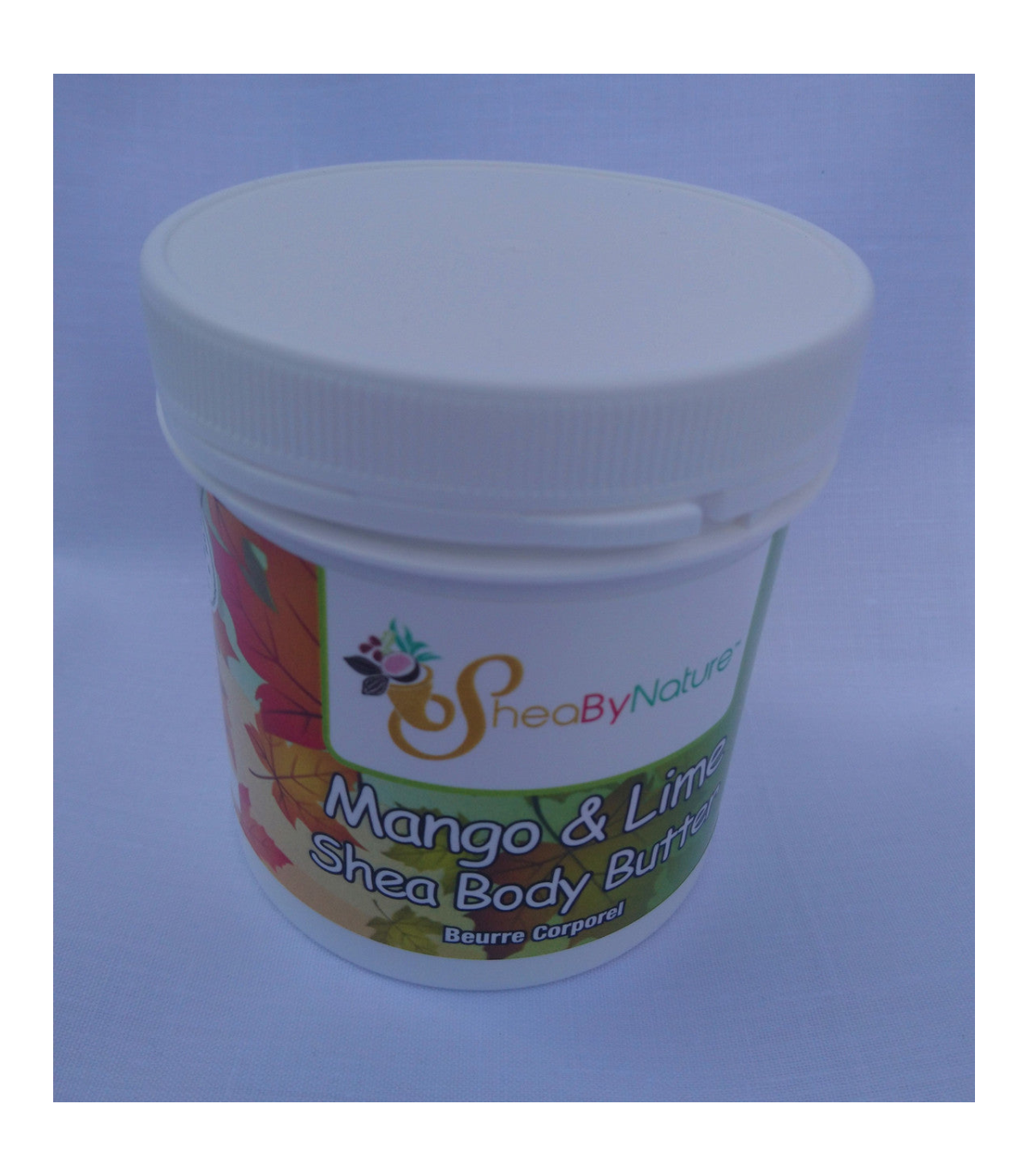 Body butter with mango and lime essential oils, and pure unrefined fair trade shea butter. This sheabynature intensive thick body butter also contain nourishing and skin softening cocoa butter, healing and antiageing Vitamin E, sunflower and coconut oils. It is an ideal intensive therapy for (very) dry, damaged, normal, sensitive and mature skin. Our Mango and Lime Body butter, is so smooth and silky on the skin, it is very thick and firm but melts deliciously into oil which you then apply all over your skin. A Multi use product for use on body, face, hands, feet and scalp, for moisturising, massaging and shaving. It comes in a 250g large tub that lasts and lasts. A little goes a long way! Buy it today.