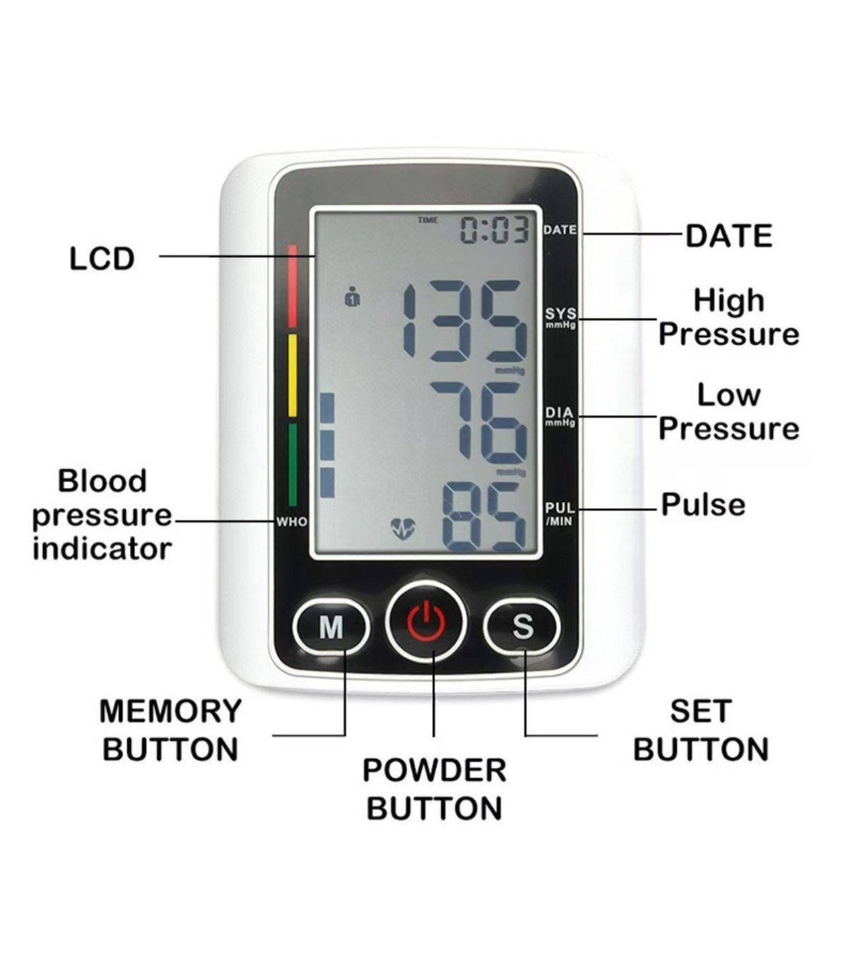 【Fully Automatic】- Wrap the cuff around your upper arm, assume proper sitting position, get your readings on large LCD screen with one touch of the button.Displayed measurements include: systolic pressure, diastolic pressure, pulse rate, date, time, and user ID. It will automatically shut down without any operation for 30 seconds.