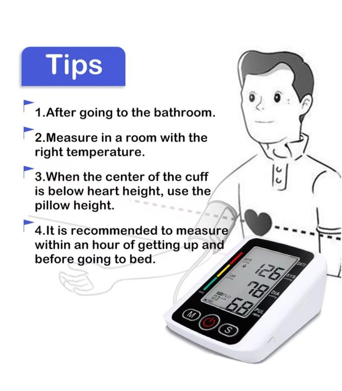 Easily measure blood pressure with one button, no complicated buttons, no need to adjust, and you can measure it without understanding;