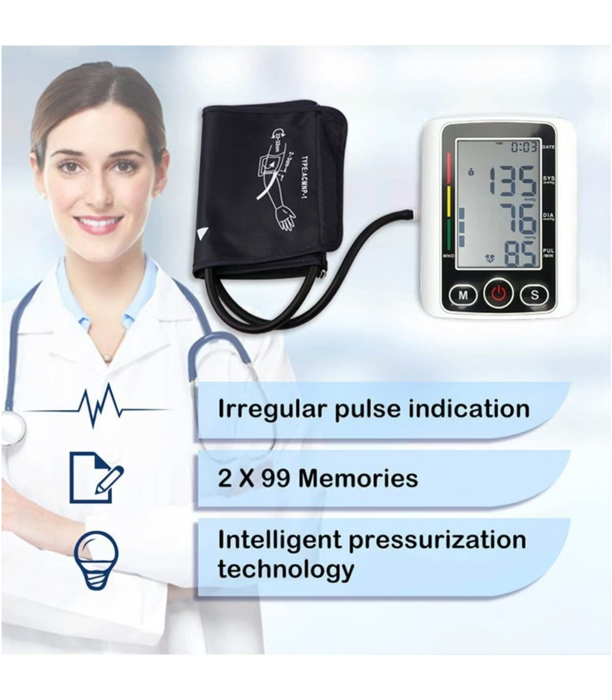 The accuracy ranges are: ±3 mmHg / ±0.4 kPa (blood pressure) and ±5%( pulse rate). Recommended by doctors for home health and blood pressure monitoring and recording.