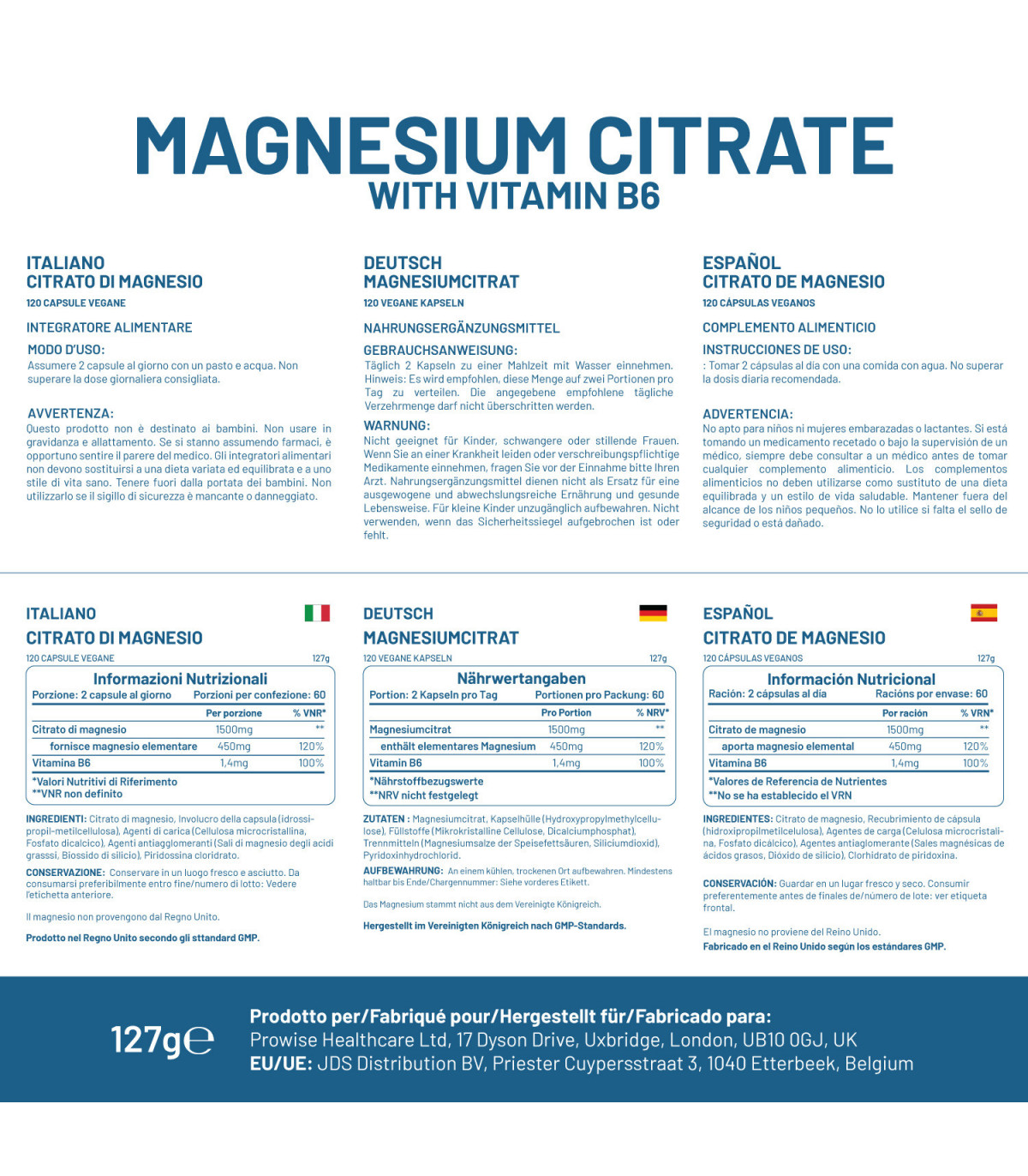 Magnesium Citrate Capsules 1500mg with Vitamin B6 | 120 Vegan Tablets | 450mg Elemental Mg | High Strength Magnesium Supplements for Women & Men | Capsules not Tablets | Made in UK by Prowise