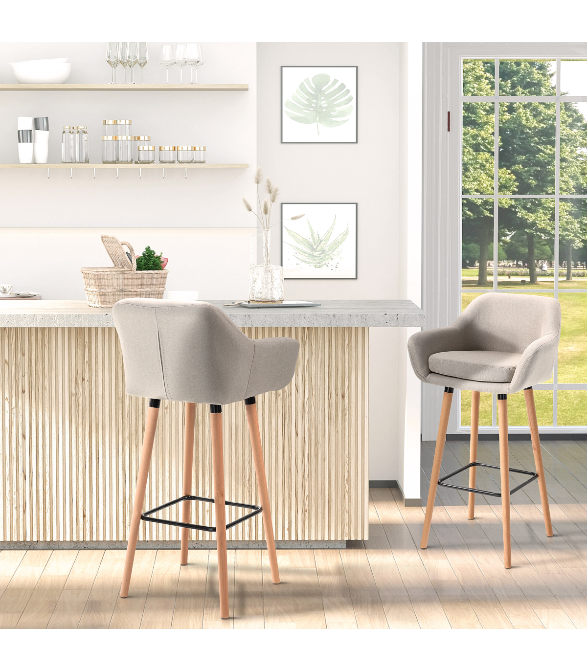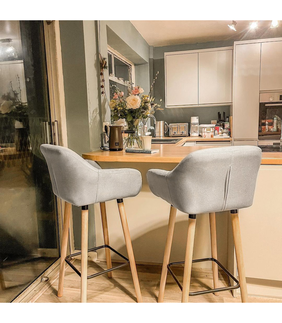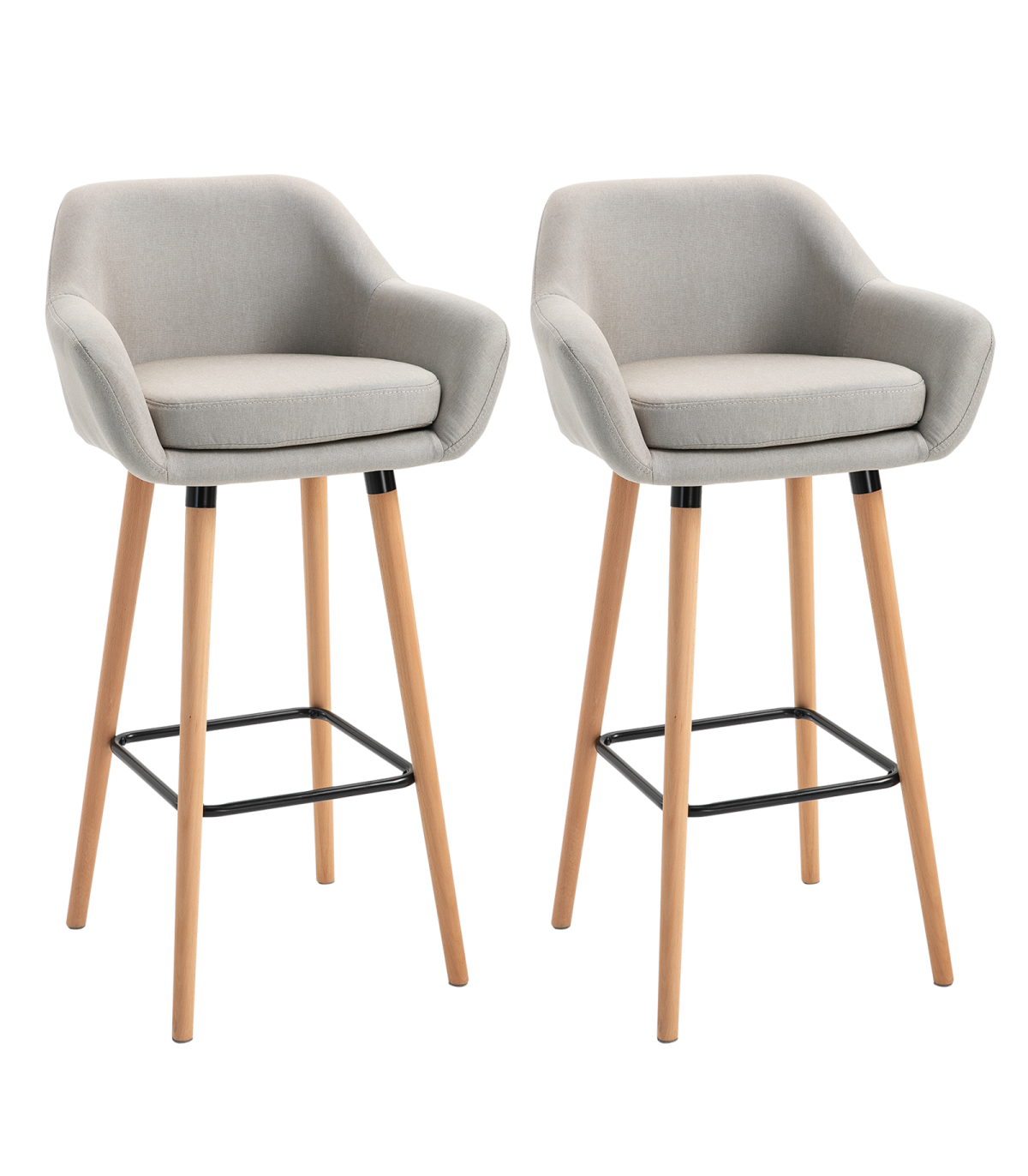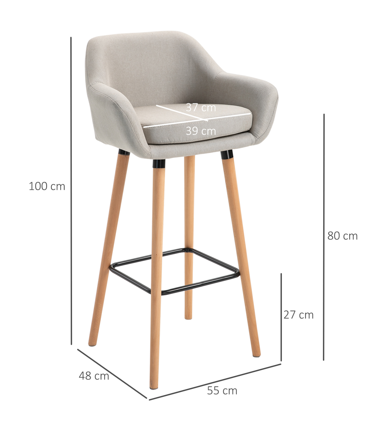 Set of two bar stools: A matching set for your home, in a wide tub design for a smooth and modern look for a beautiful addition to your home.Tall wooden base: Solid wood legs ensures strength and stability. 'A' shape to help keep stable. Bottom footrest for lower body comfort.Comfortable: Combines a wide seat and deep and thick cushions for you to sink in, with a high back and armrests for support.Linen upholstery: Allows your skin to breathe, as well as being easy to clean and keep fresh.Dimensions: 100H x 55W x 48Dcm. Seat: 39W x 37Dcm. Recommended Bar Table Height:110cmMaximum load 120kg. Assembly required.