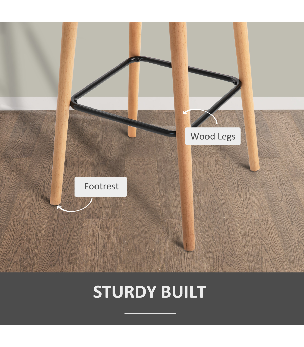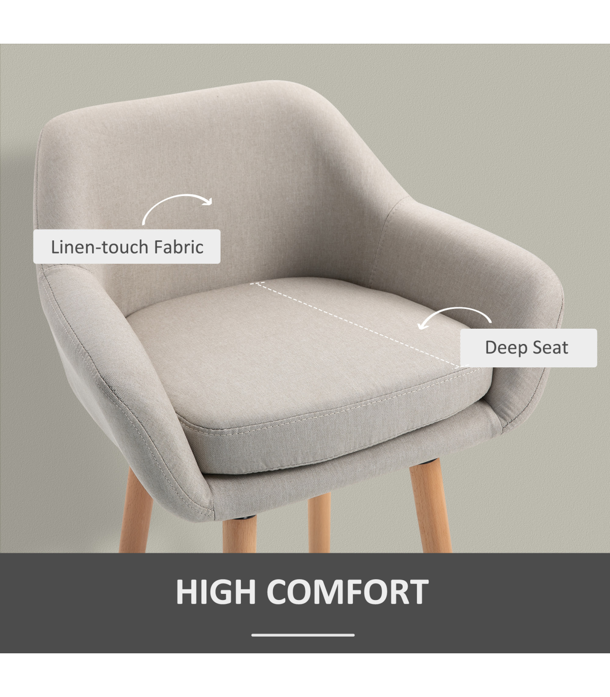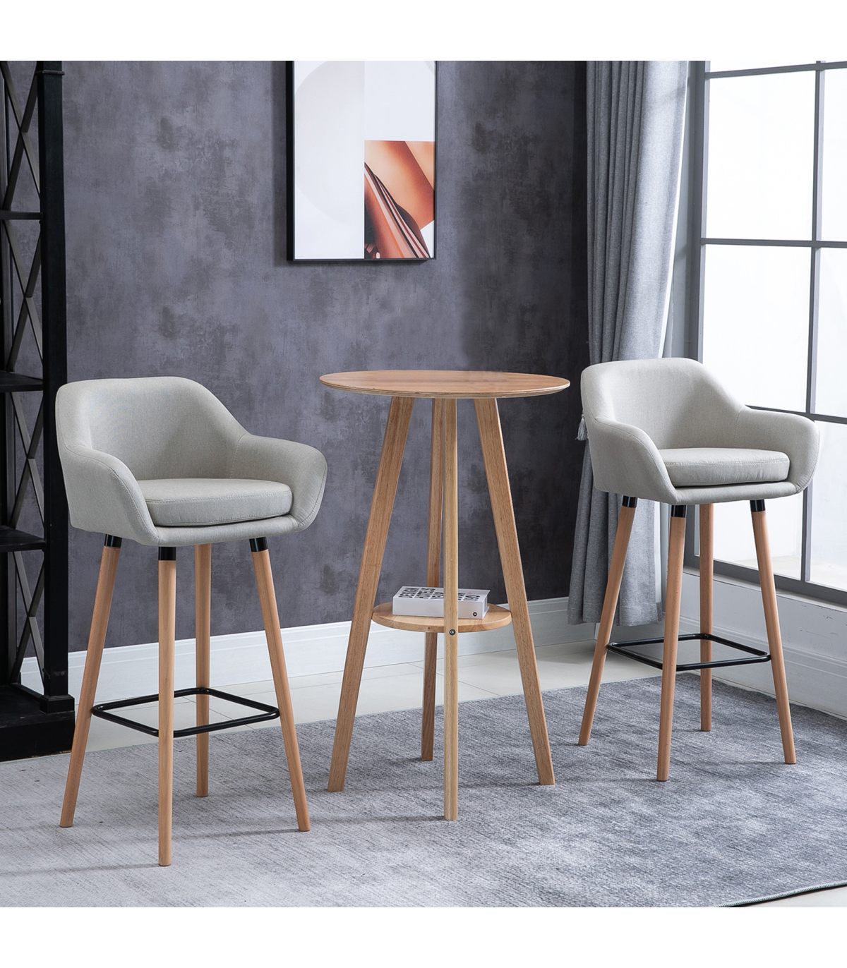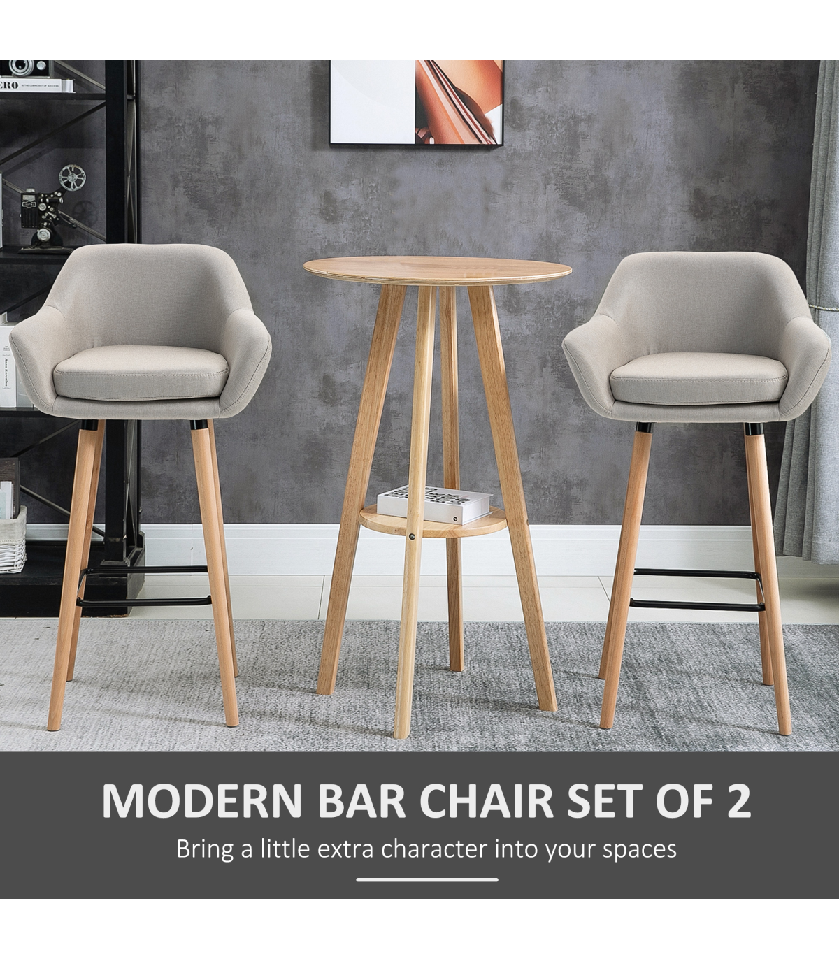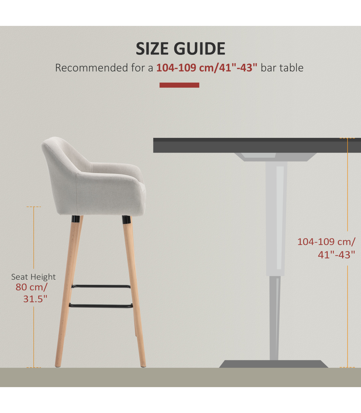 Set of two bar stools: A matching set for your home, in a wide tub design for a smooth and modern look for a beautiful addition to your home.Tall wooden base: Solid wood legs ensures strength and stability. 'A' shape to help keep stable. Bottom footrest for lower body comfort.Comfortable: Combines a wide seat and deep and thick cushions for you to sink in, with a high back and armrests for support.Linen upholstery: Allows your skin to breathe, as well as being easy to clean and keep fresh.Dimensions: 100H x 55W x 48Dcm. Seat: 39W x 37Dcm. Recommended Bar Table Height:110cmMaximum load 120kg. Assembly required.