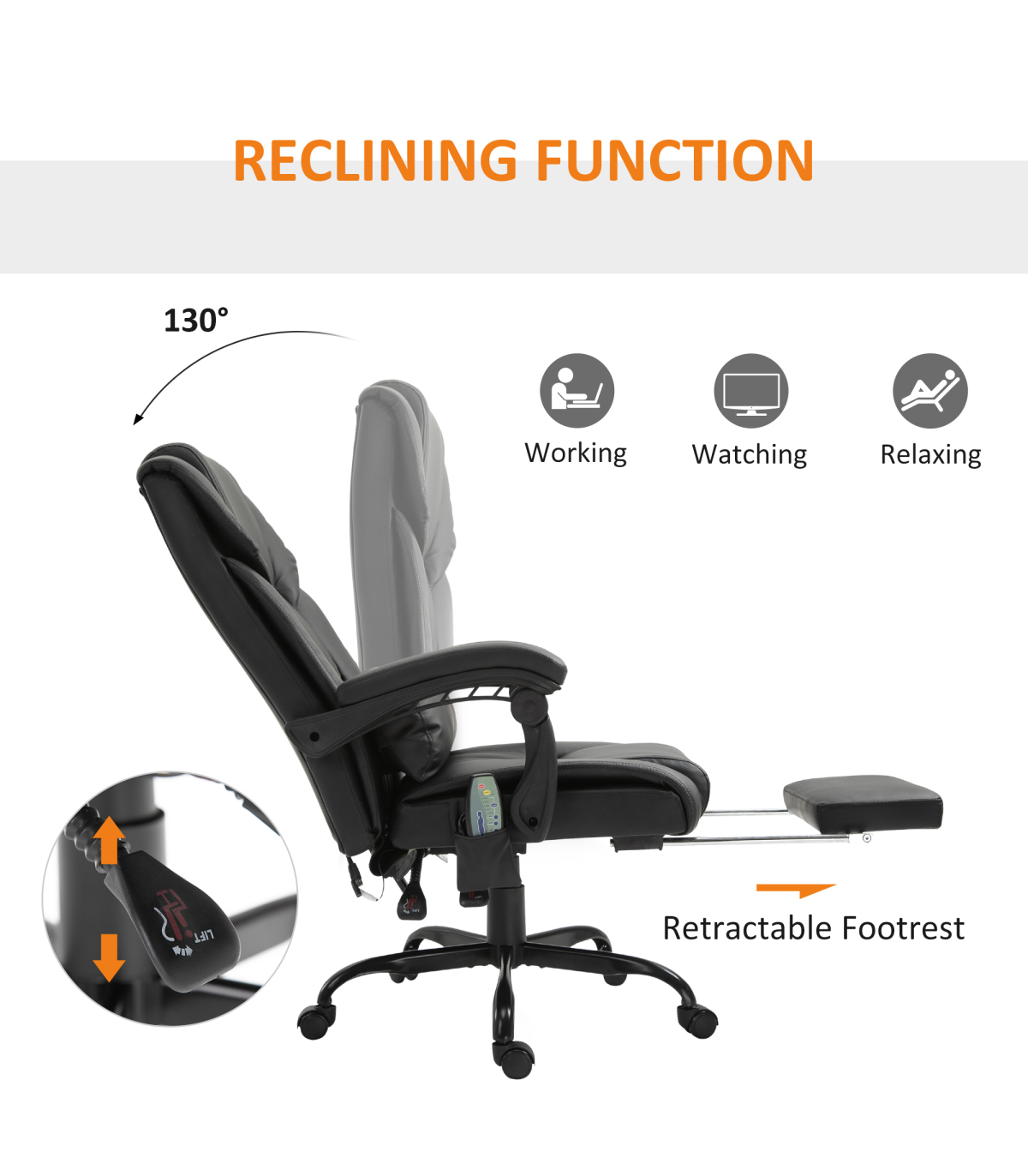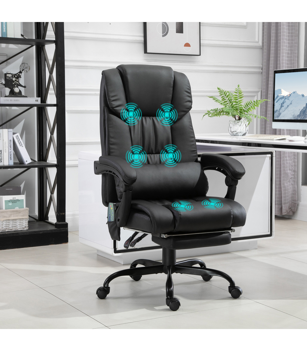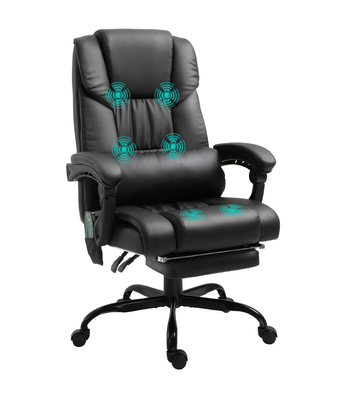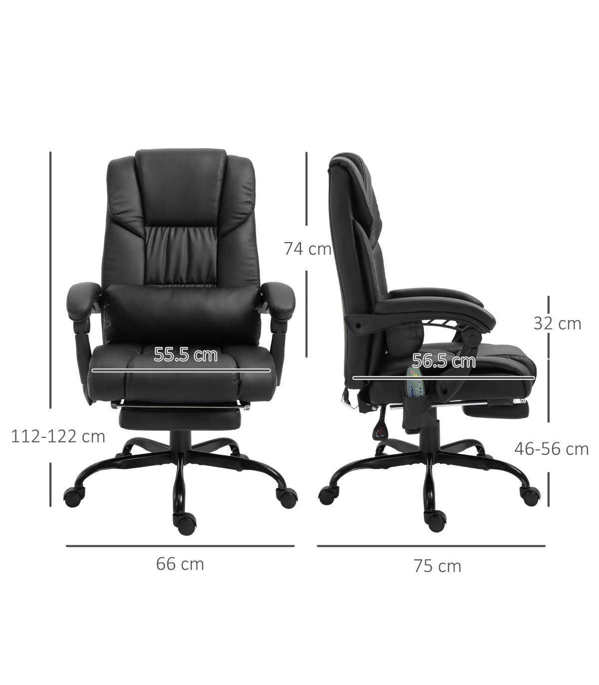 Six massage points: Two on the shoulders, two on lower back and two on the thigh area, giving you a soothing and relaxing massage which focuses on core points. Controlled by the attached remote which has five different function modes.Comfortable design: Height can be adjusted, the back goes to a maximum 130-degree angle, with a pull-out footrest. Five castor wheels for moving easily and seat can 360 rotate for free.112-122cm adjustable height: Set this office chair to a position you want - great for matching with your work desk level. Helps prevent you straining your body.Thick padding: Filled with sponge for comfort as you sit and relax, with sleek faux leather upholstery for a stylish and executive look.Dimensions: 112-122H x 66W x 75Dcm. Seat: 46-56H x 55.5W x 56.5Dcm.