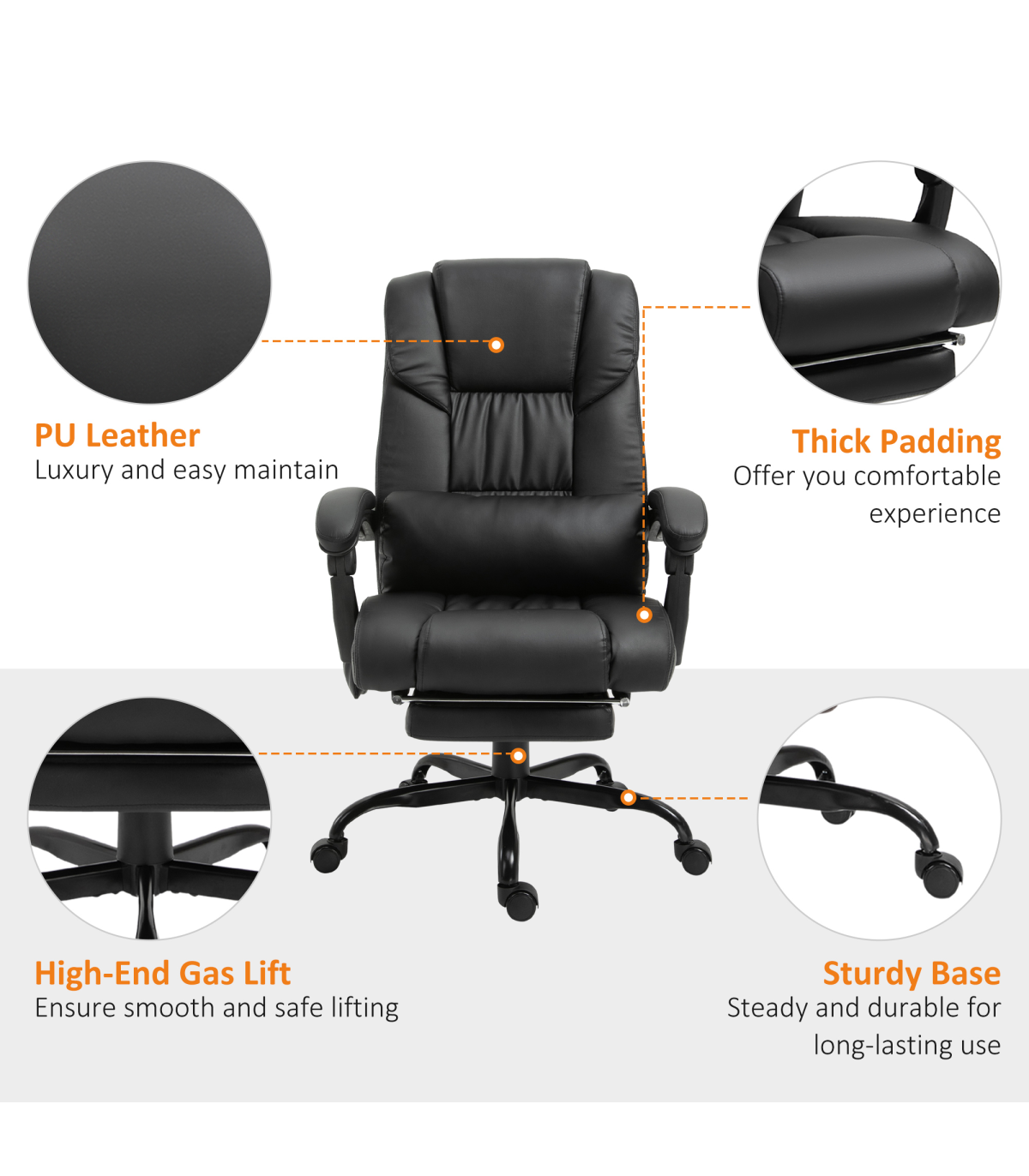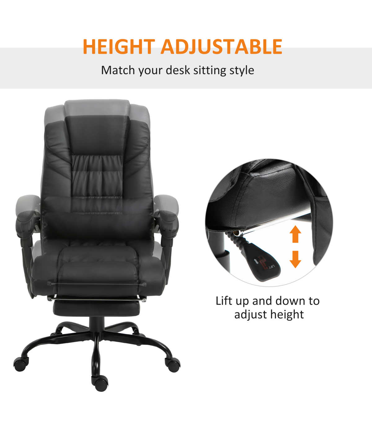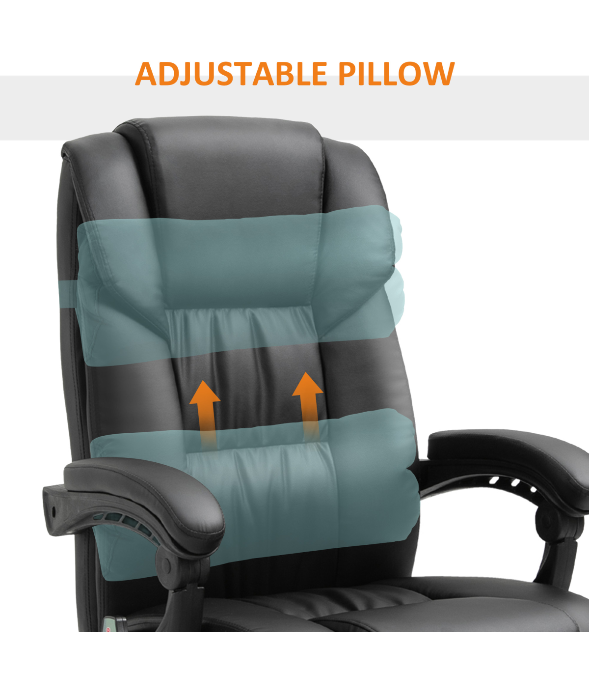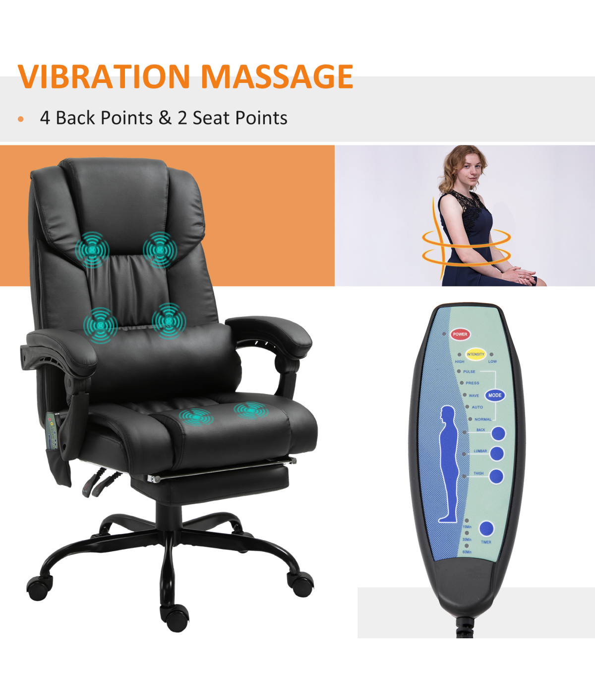 Six massage points: Two on the shoulders, two on lower back and two on the thigh area, giving you a soothing and relaxing massage which focuses on core points. Controlled by the attached remote which has five different function modes.Comfortable design: Height can be adjusted, the back goes to a maximum 130-degree angle, with a pull-out footrest. Five castor wheels for moving easily and seat can 360 rotate for free.112-122cm adjustable height: Set this office chair to a position you want - great for matching with your work desk level. Helps prevent you straining your body.Thick padding: Filled with sponge for comfort as you sit and relax, with sleek faux leather upholstery for a stylish and executive look.Dimensions: 112-122H x 66W x 75Dcm. Seat: 46-56H x 55.5W x 56.5Dcm.