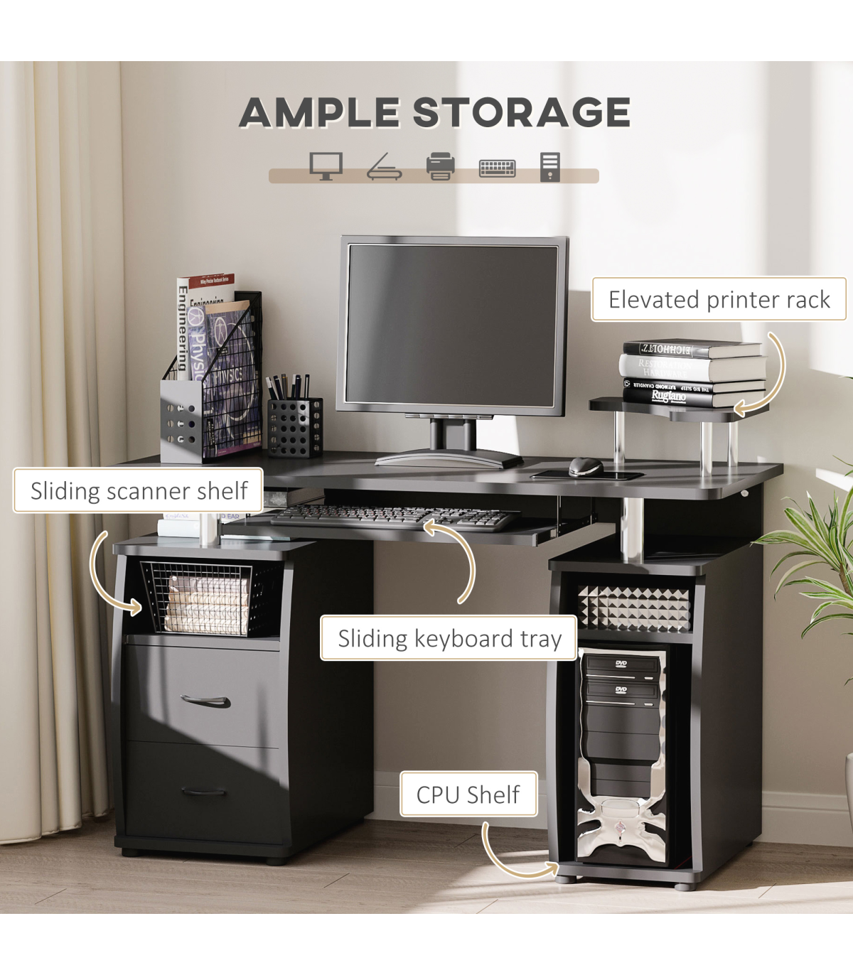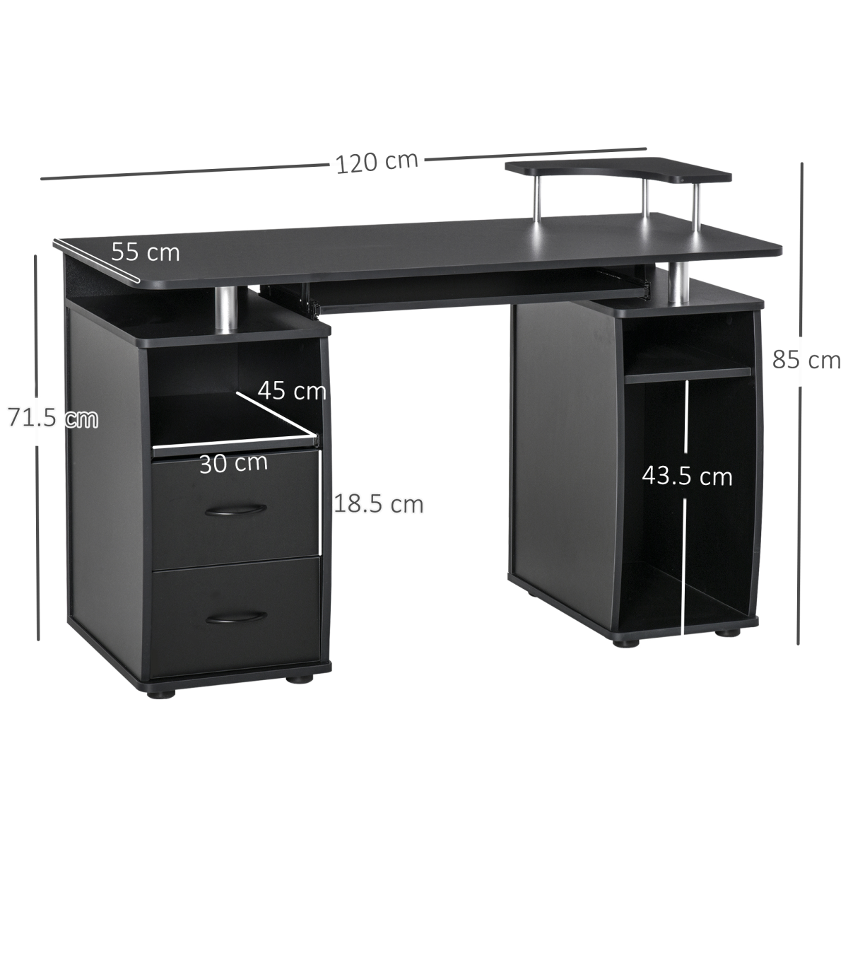 Multi-Storage and Work Space: Features a two-drawer cabinet, computer tower holder, large work desk, monitor shelf and keyboard tray. Easy to work and keep everything next to you.Scanner Shelf: Slides out, makes your multitasking work jobs easier than ever. Gliding rails for smooth movement in and out.Particle Board Structure: Durable so it is suitable for everyday use, keeping your devices and files etc. supported as you work. Rounded corners for safety.Melamine Coating: Smooth top layer which protects against light wear and marks. DIMENSIONS: 85H x 120L x 55Wcm. Scanner shelf: 16.5H x 30.5W x 45Dcm. Drawer inner: 10.5H x 27W x 28Dcm.MAXIMUM LOAD 50KG. ASSEMBLY REQUIRED.