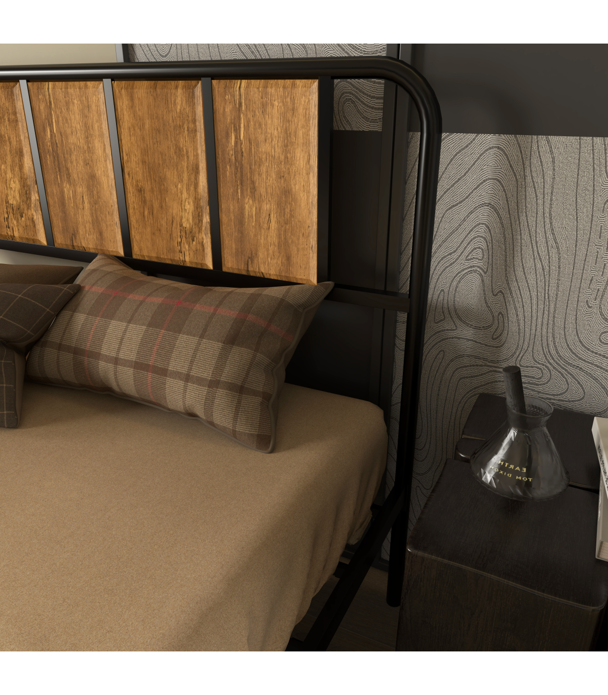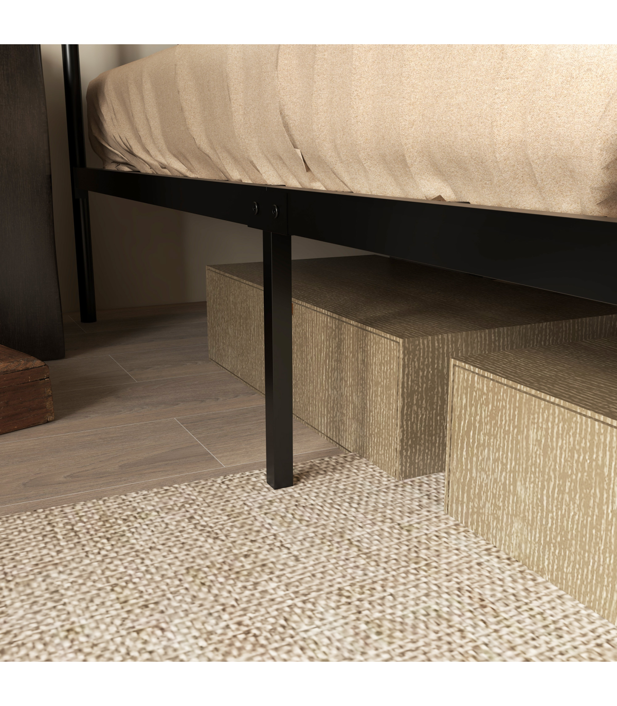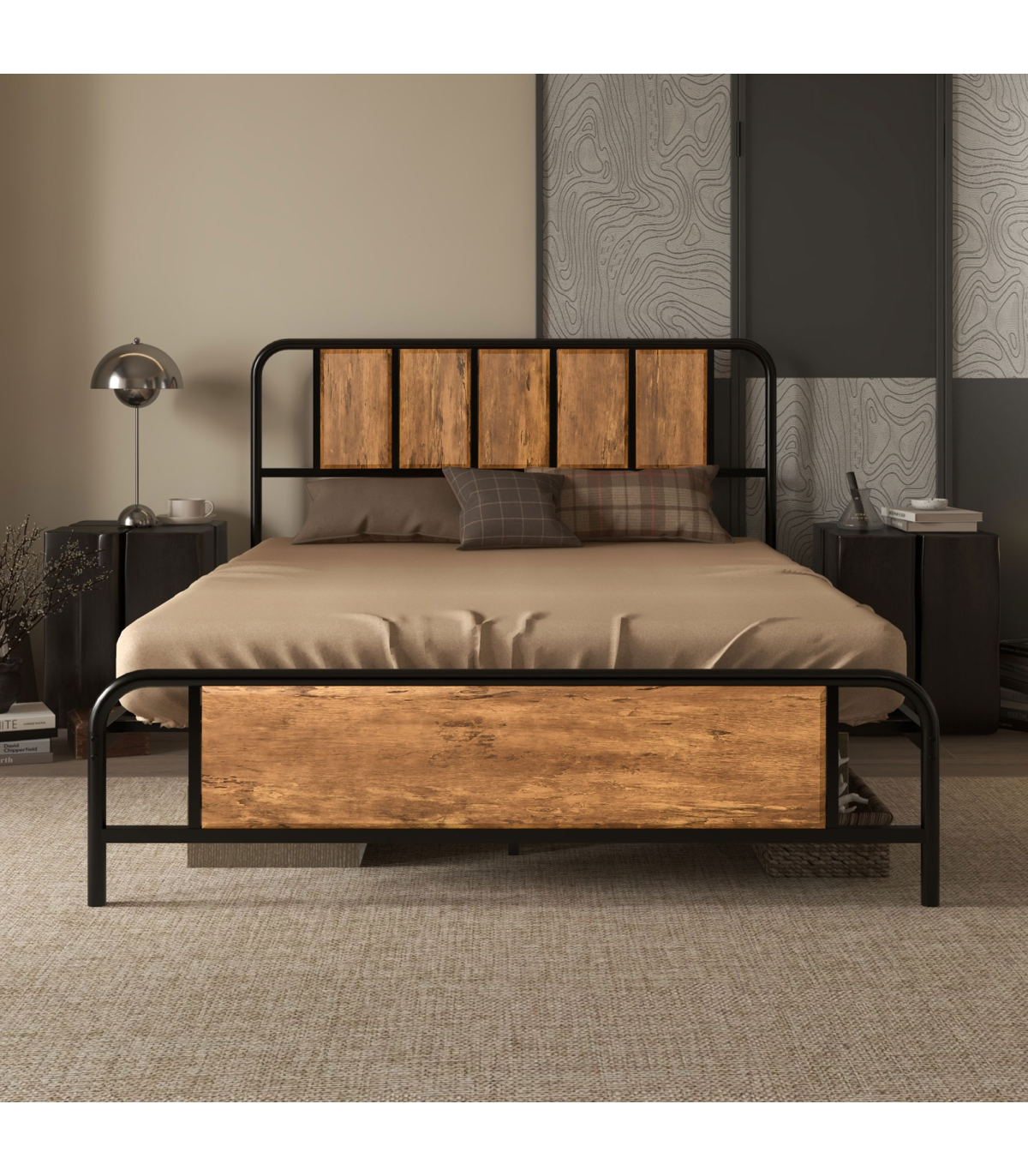 Retro look: A black steel bed frame, with wood-effect panels both ends. Great for plenty of bedroom interior styles.Steel frame: A strong frame, which supports you properly as you sleep on this double bed frame.Under-bed clearance: Space for discreet storage, easy to keep things within the double bed base - helps to keep the space clear of clutter.Double frame size: Lots of room for you and someone to sleep at night on this steel double bed frame.Dimension: 102H x 145W x 199Dcm. Suitable double size mattress: 135/137W x 190Dcm. Maximum load 300kg. Assembly required.