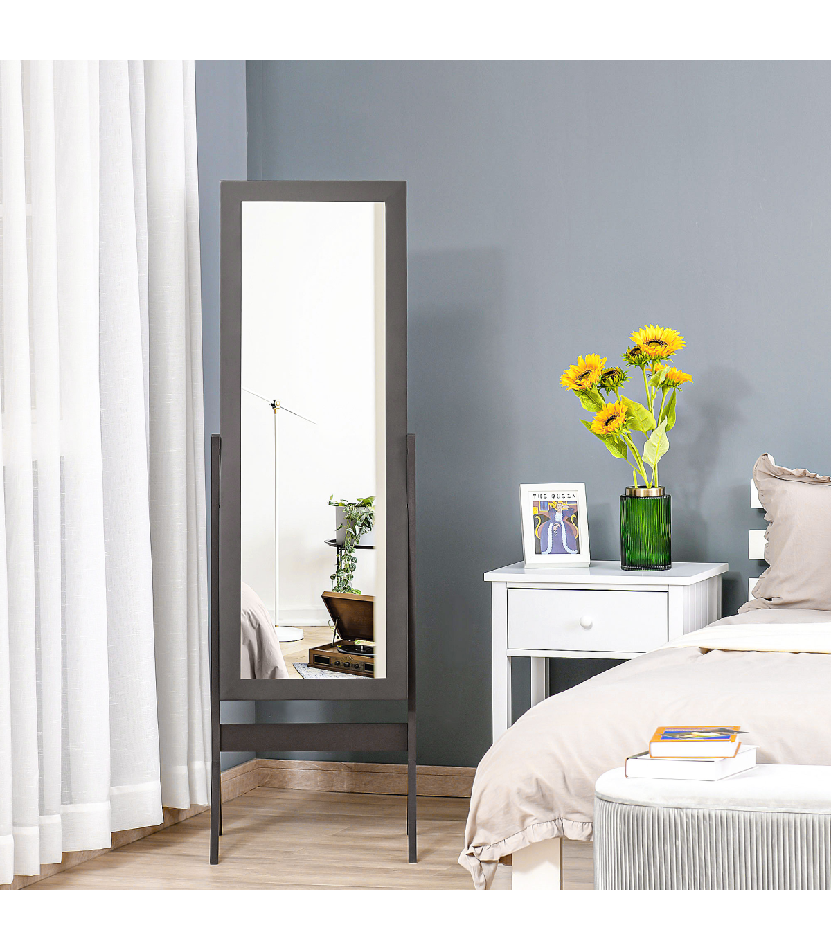 LONGLINE DESIGN: Great for seeing your whole body to get a full outfit perspective, with a thick and gleaming glass mirror for a beautiful reflection.ADJUSTABLE ANGLE: Can be changed to two different positions to suit you, with the side bolts locking it in place.MDF FRAME: Strong and durable for a mainstay in your home. STURDY BASE: Fitted with two feet on each side to keep it balanced and upright.PURE COLOUR FINISH: Looks great placed anywhere in your home, the bedroom, bathroom, hallway etc. DIMENSIONS: 148H x 47W x 46Dcm. Mirror: 118L x 42W x 1.8Dcm (with frame), 108L x 32W x 0.3Dcm (without frame). Base: 95cm.ASSEMBLY REQUIRED, ALL ACCESSORIES INCLUDED.