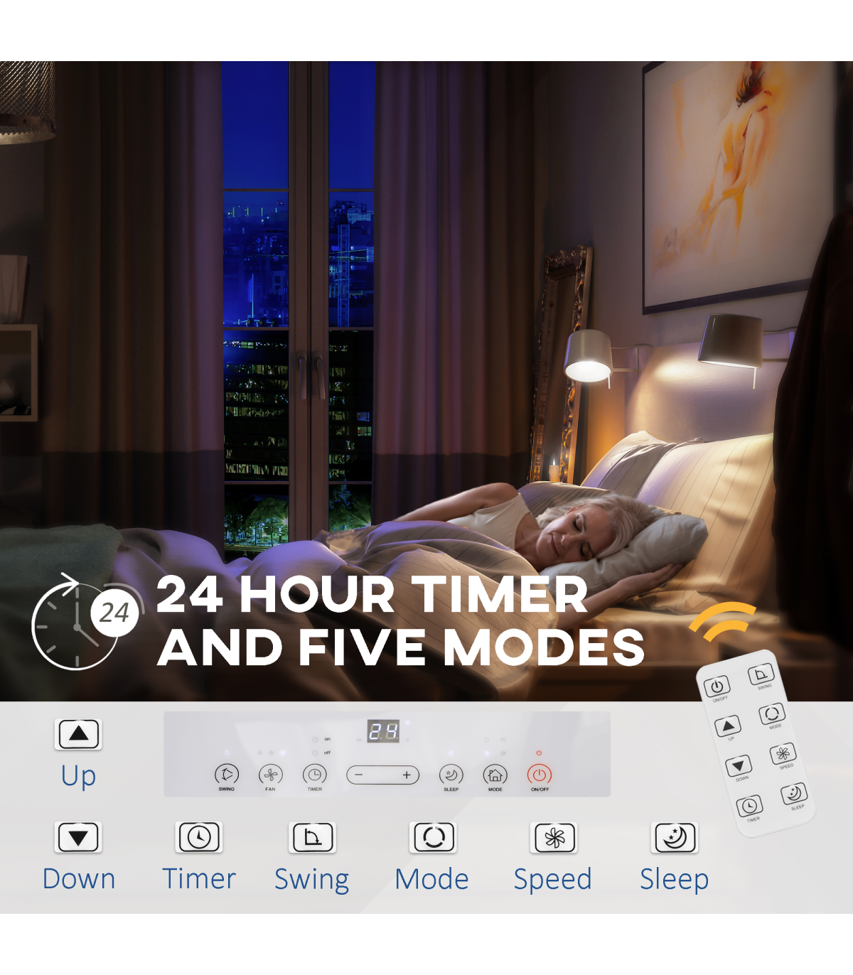 15-31?, multi-mode air conditioner: Cool, dehumidify, ventilate, auto-temp and quiet-sleep mode. Use this air conditioner unit in so many ways, how you want. Self-evaporating system means less emptying.24-hour timer: Air conditioning machine can be set to turn off after a specific running time. Great for sleeping - won't overrun on electric.Control panel and remote: Two ways to control this ac unit - use when close by or far away.Adjustable air swing: Move the direction of the air flow from this air con up or down - cover an area you want.Wheels and handle: A truly portable air conditioner - easy to roll around the floor or carry. Window kit included.