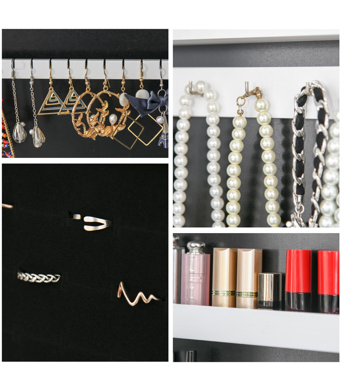 Ample storage space: 32 earring notches, 70 slots for finger rings, 12 hooks for necklaces and bracelets, 3 storage shelves