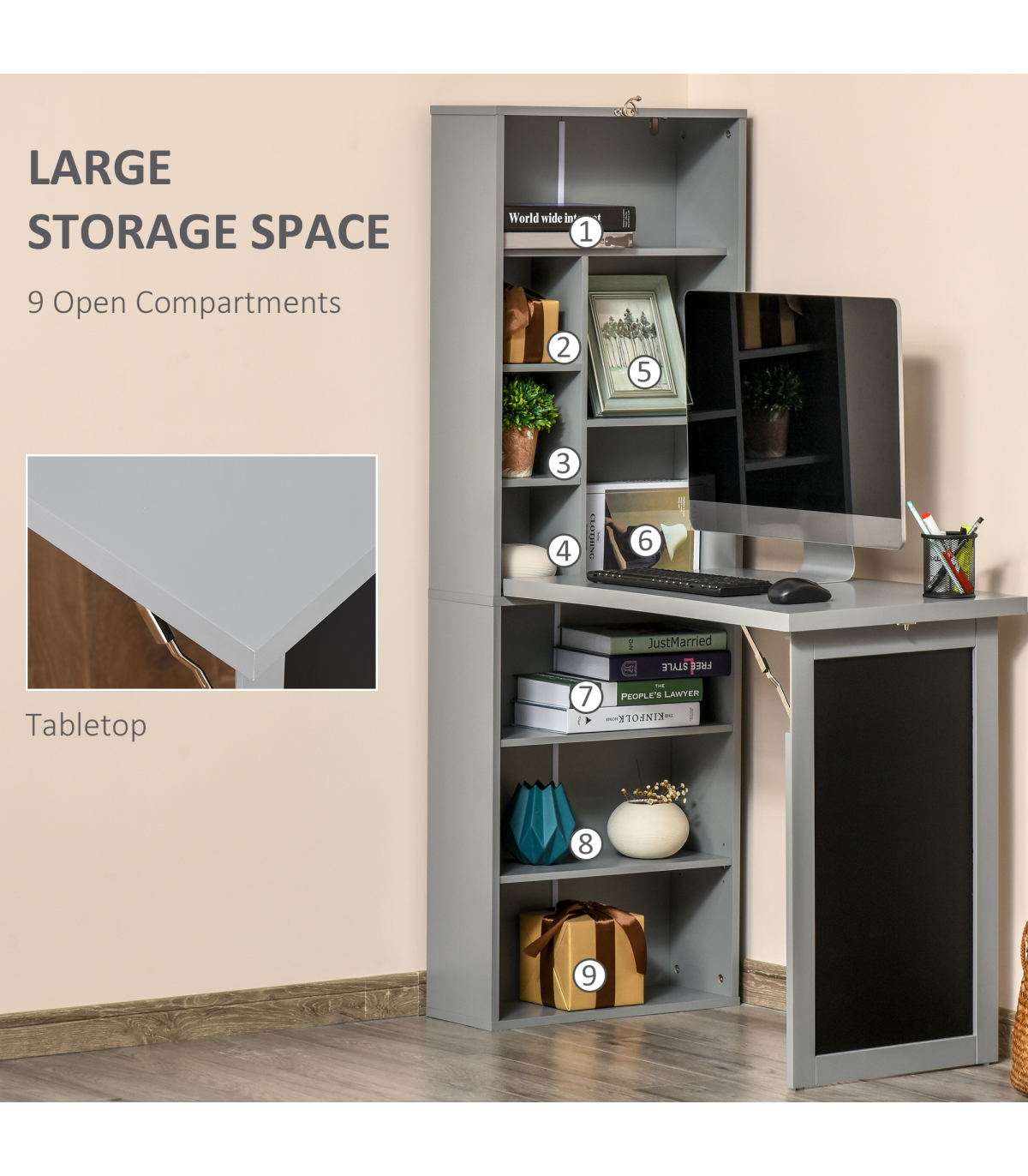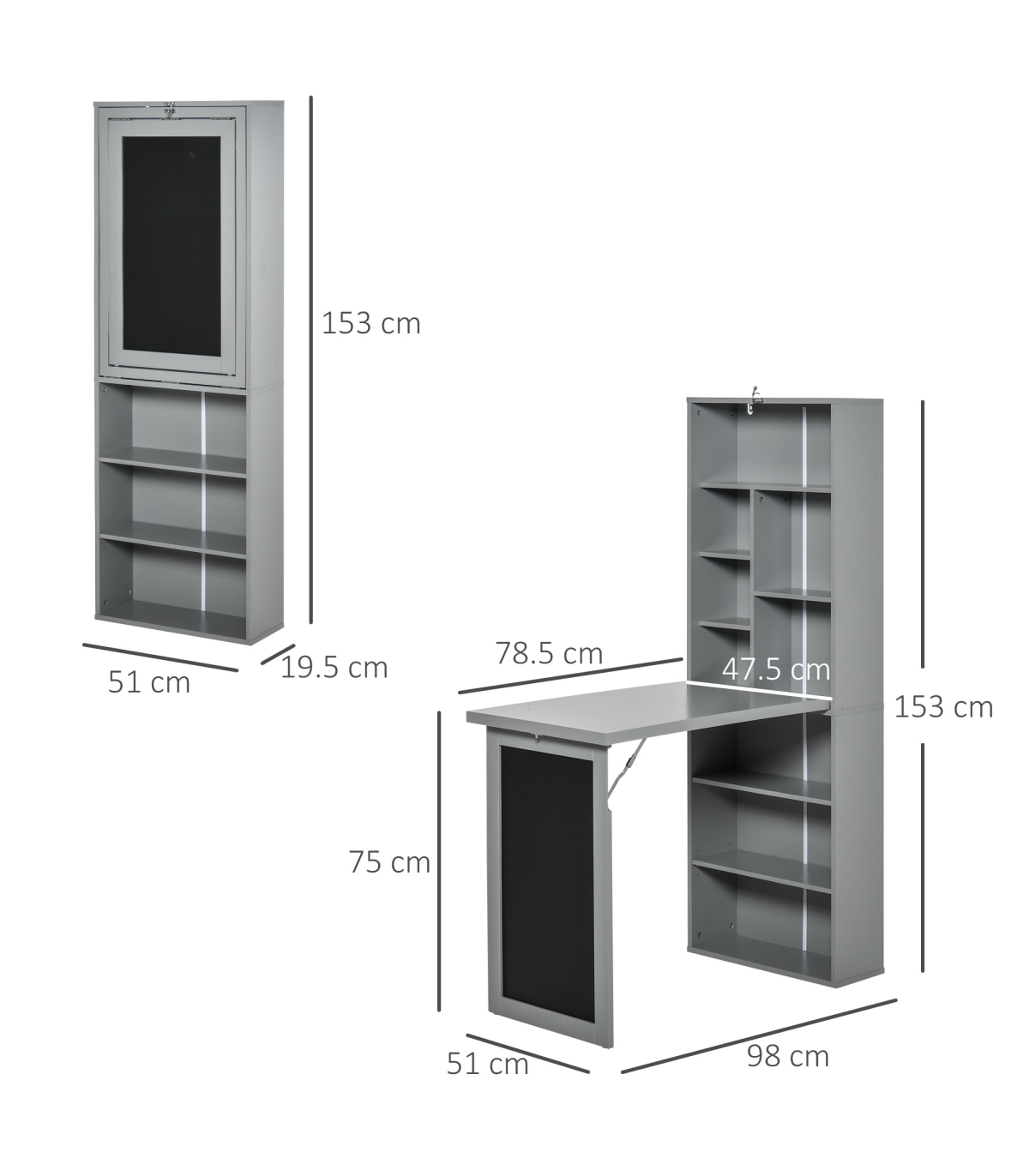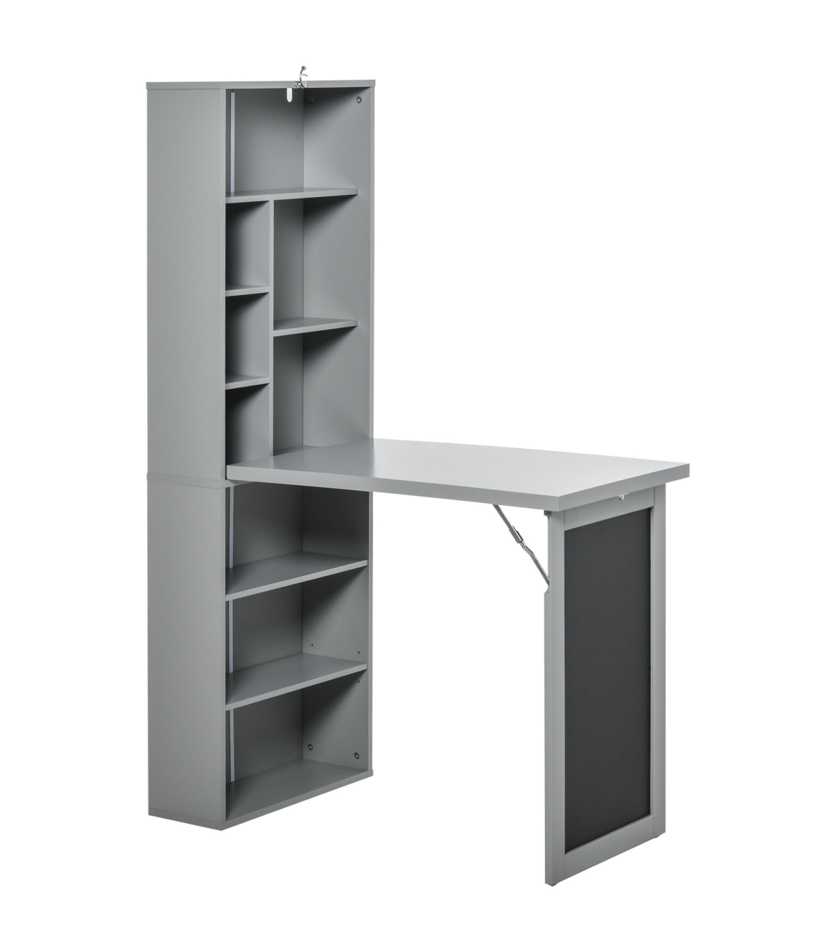 3-in-1 design: The home office desk is formed of the end bookcase, middle work table and the chalkboard on the end panel. A place to work from, where you can keep your books close and thoughts visibly noted. Shelf features nine compartments, bottom shelf can be moved to three different positions.Folding: Computer table can fold up into the bookcase and displays the chalkboard when correctly locked into place. An innovative design made to save space where needed.Sturdy: Tough and durable particle board structure made to be used every day. Fitted with metal hinges and accents to hold each part in place. Blackboard: Displays when the study desk is both folded and unfolded, easy to see your thoughts at all times.Anti-tipping: Fixes the study table to the wall for safety in homes with children and pets. Dimensions: 153H x 98W x 51Dcm. Middle table: 75H x 47.5W x 78.5Dcm.Maximum load: Whole: 60kg. Table: 50kg. Assembly required.