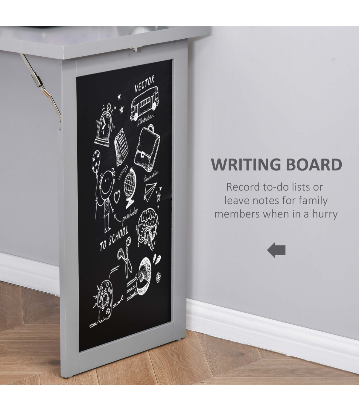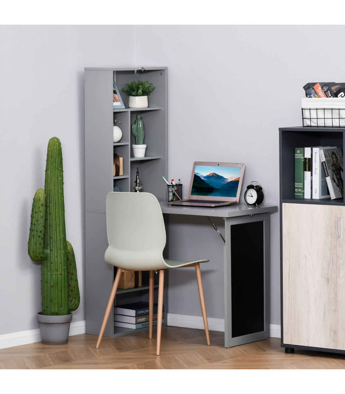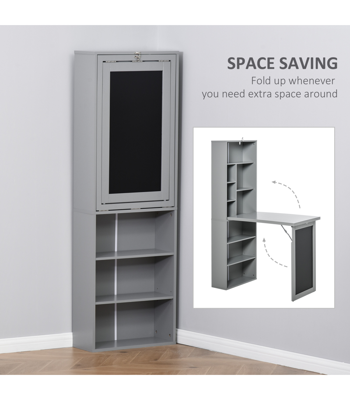 3-in-1 design: The home office desk is formed of the end bookcase, middle work table and the chalkboard on the end panel. A place to work from, where you can keep your books close and thoughts visibly noted. Shelf features nine compartments, bottom shelf can be moved to three different positions.Folding: Computer table can fold up into the bookcase and displays the chalkboard when correctly locked into place. An innovative design made to save space where needed.Sturdy: Tough and durable particle board structure made to be used every day. Fitted with metal hinges and accents to hold each part in place. Blackboard: Displays when the study desk is both folded and unfolded, easy to see your thoughts at all times.Anti-tipping: Fixes the study table to the wall for safety in homes with children and pets. Dimensions: 153H x 98W x 51Dcm. Middle table: 75H x 47.5W x 78.5Dcm.Maximum load: Whole: 60kg. Table: 50kg. Assembly required.