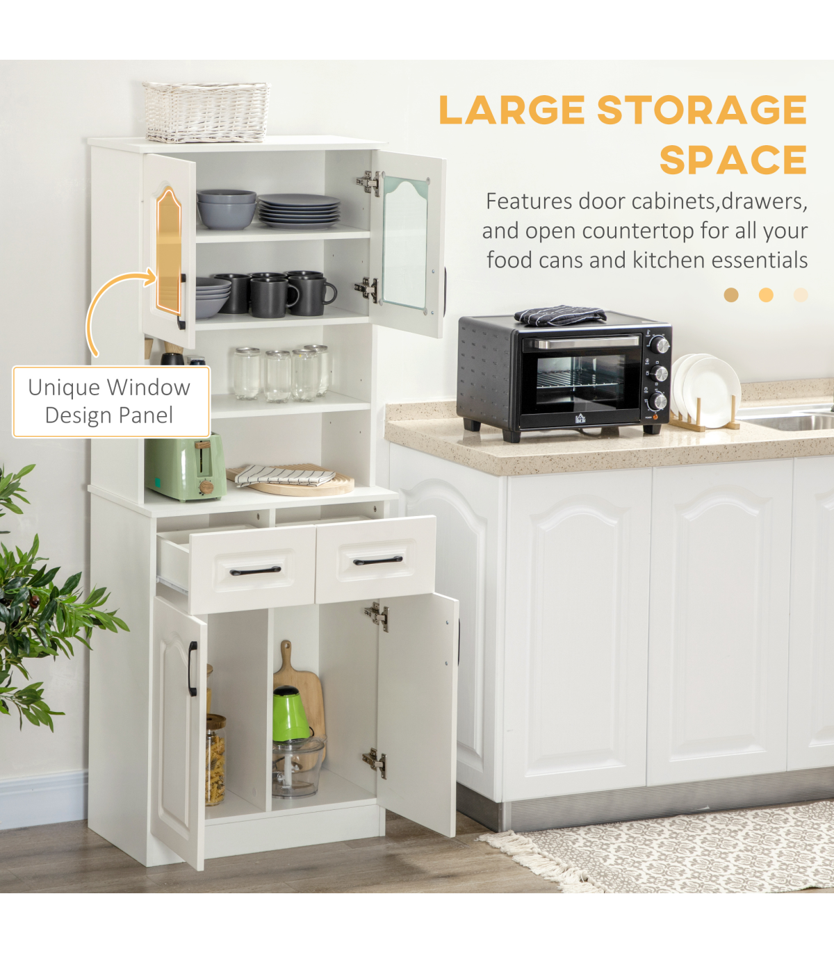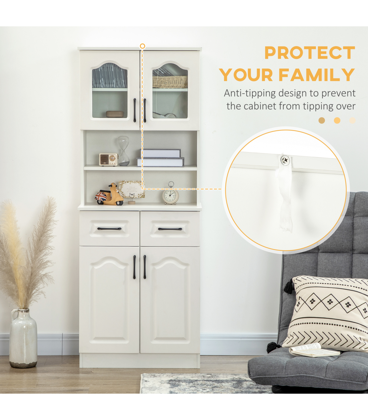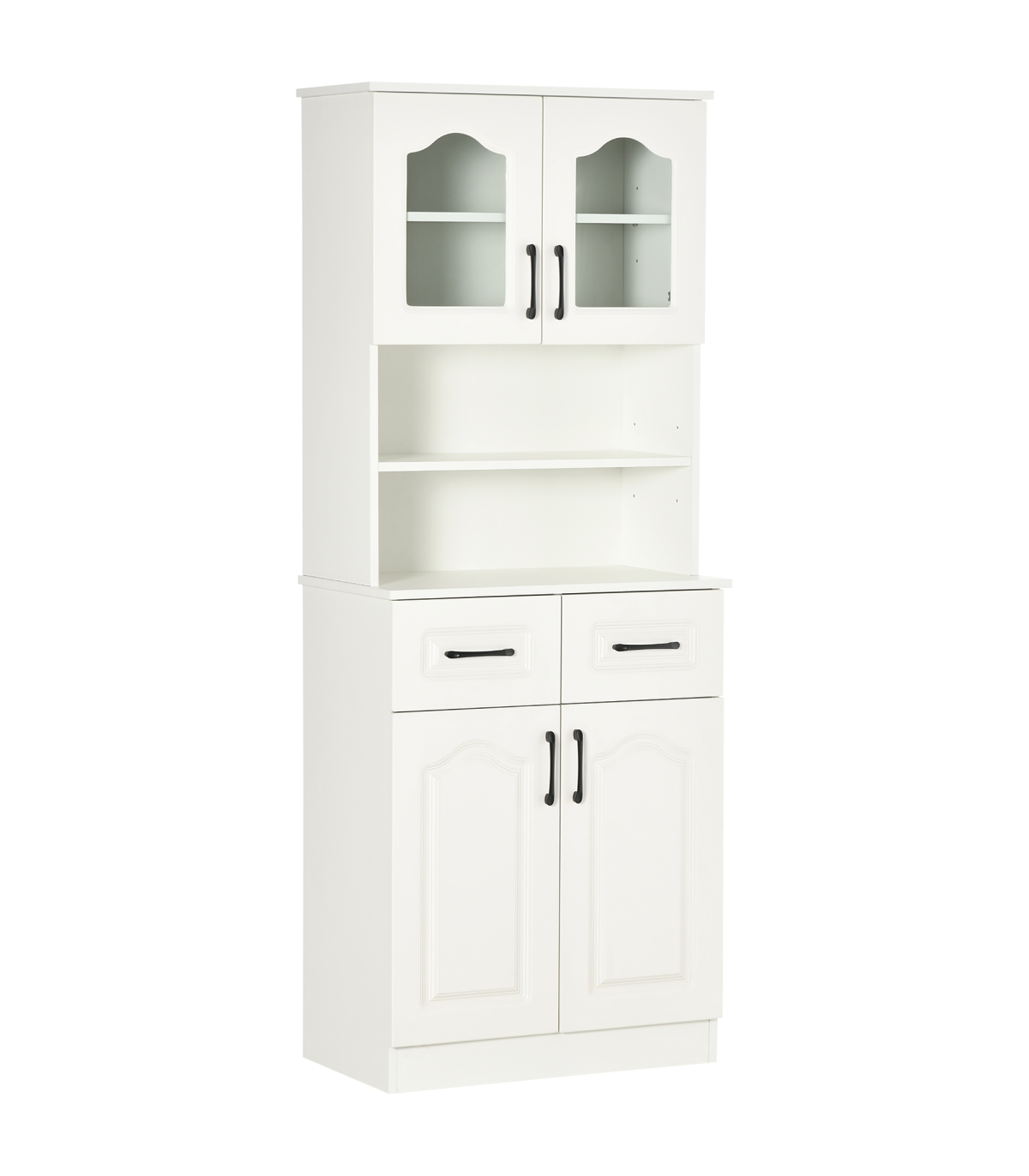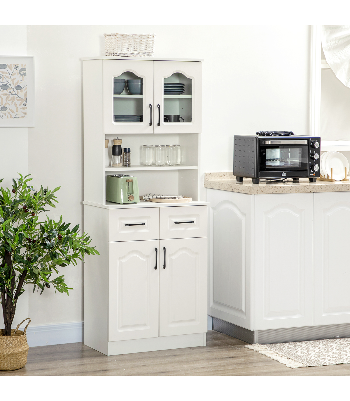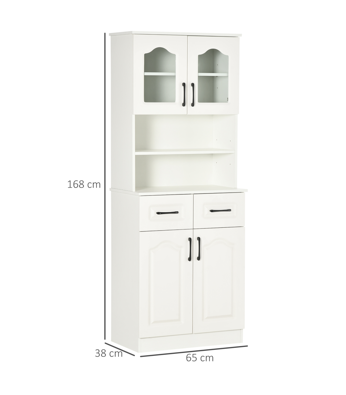 Multi-storage: Kitchen storage cabinet features a top and bottom cupboard, two middle shelves and two drawers - room for kitchen and dining essentials.Two flexible shelves: Move up/down easily in this storage cupboard - or simply remove them. Changes this storage space instantly.Contemporary: White colour, with black handles and glass doors. Simple and beautiful, this kitchen storage unit is suitable for many home interiors.Anti-tipping straps included: Attach this pantry cupboard to a wall so it won't fall over. Safe for family homes.Dimensions: 168H x 65L x 38Wcm. Maximum load 80kg. Assembly required.