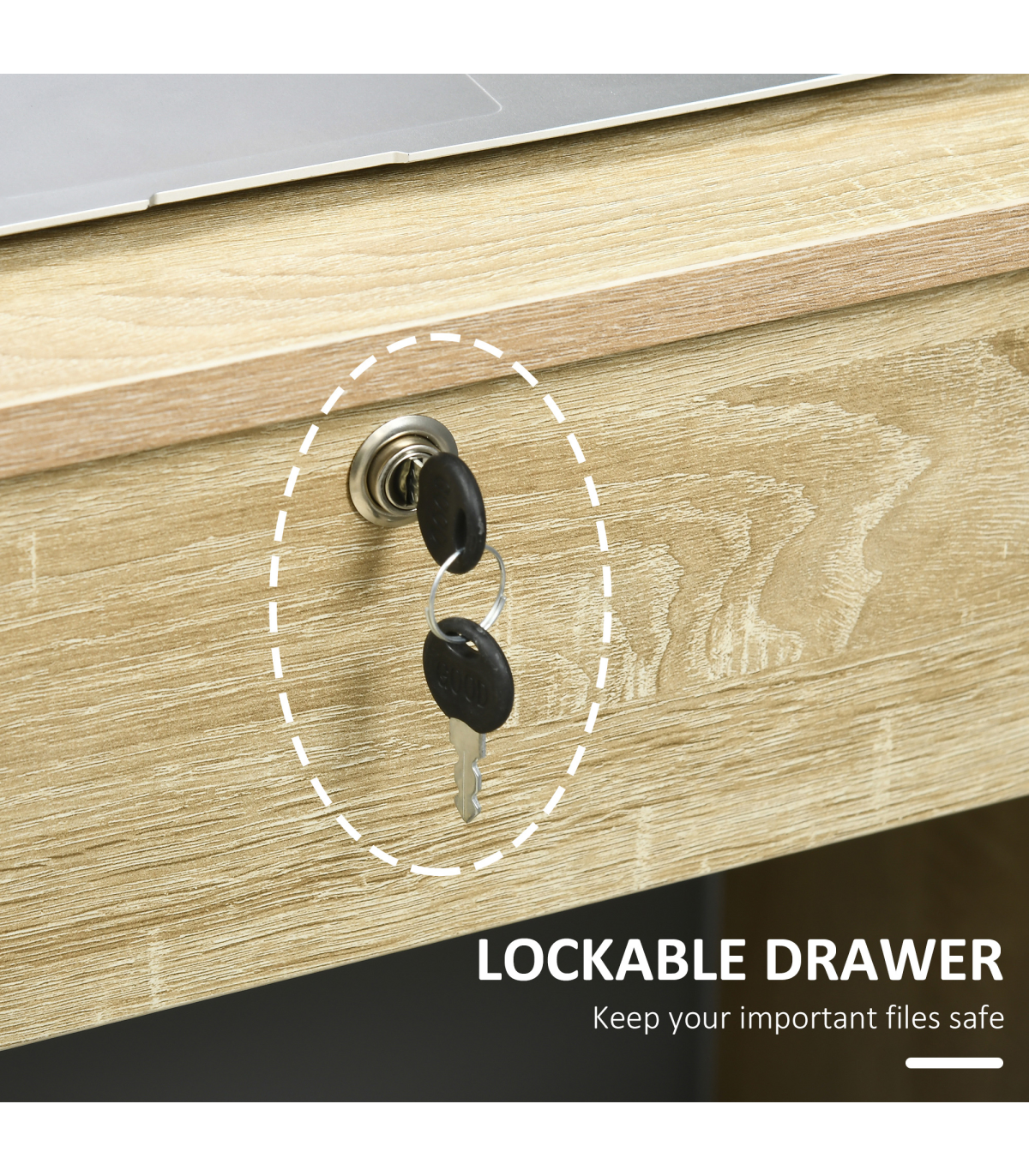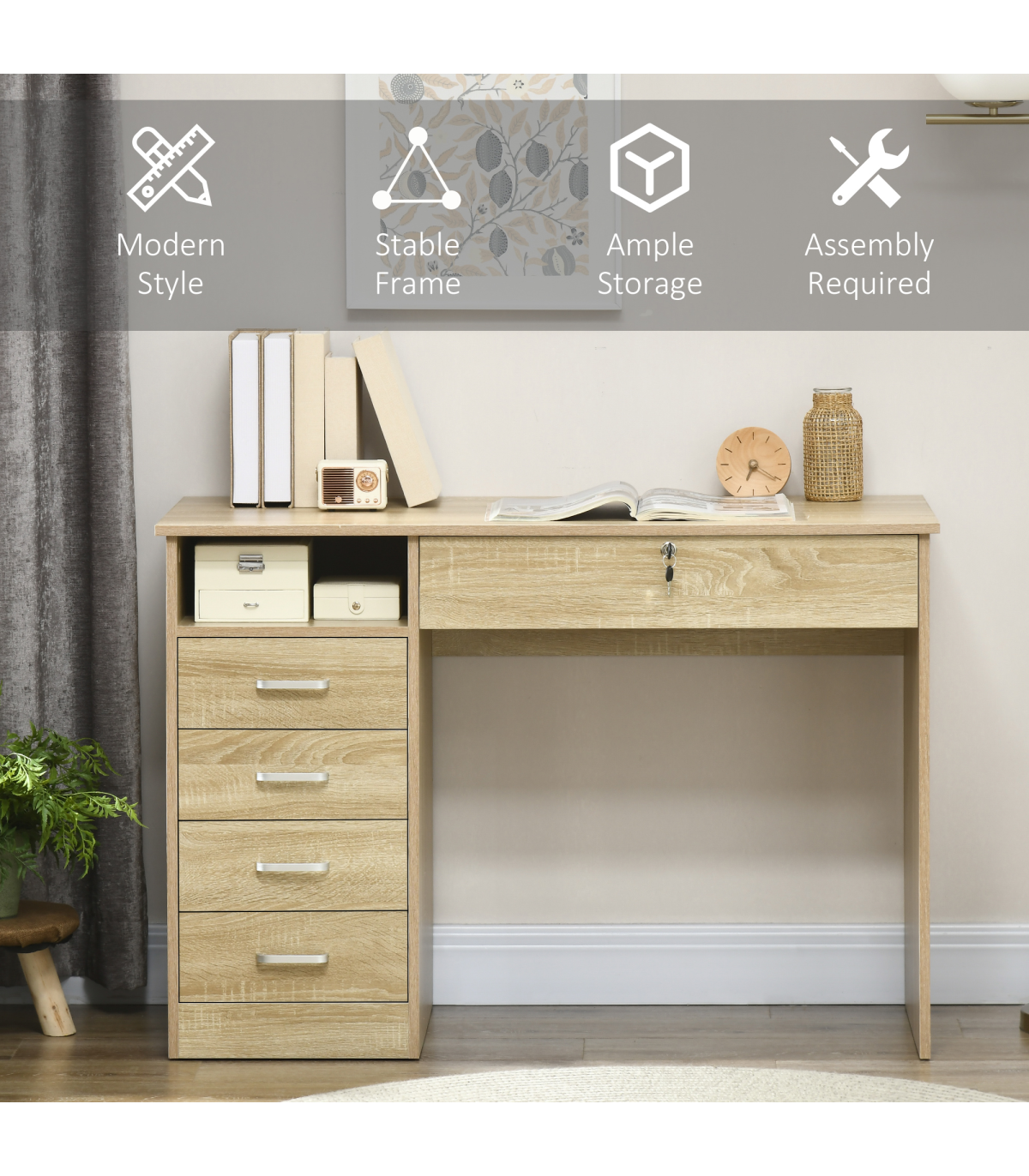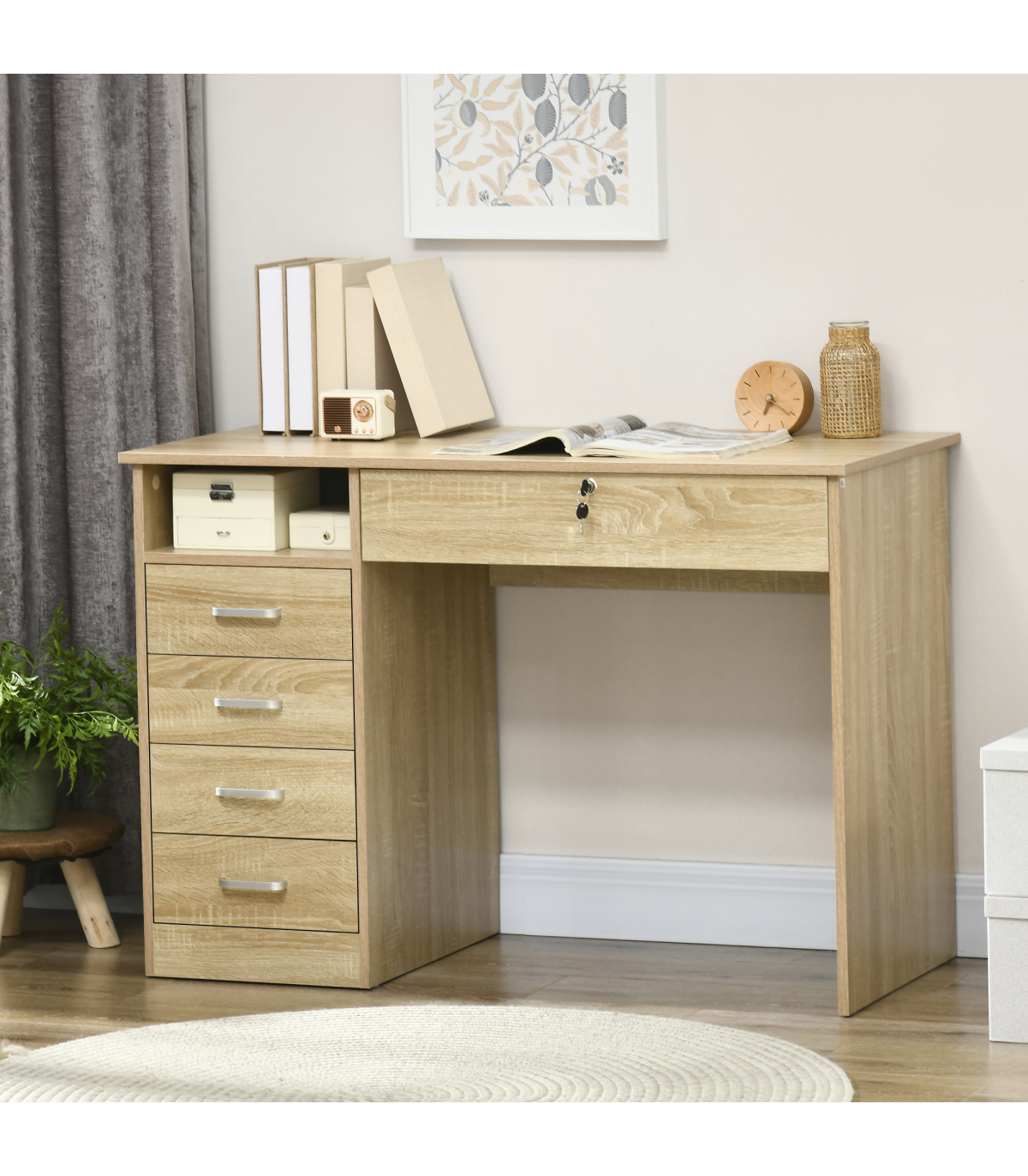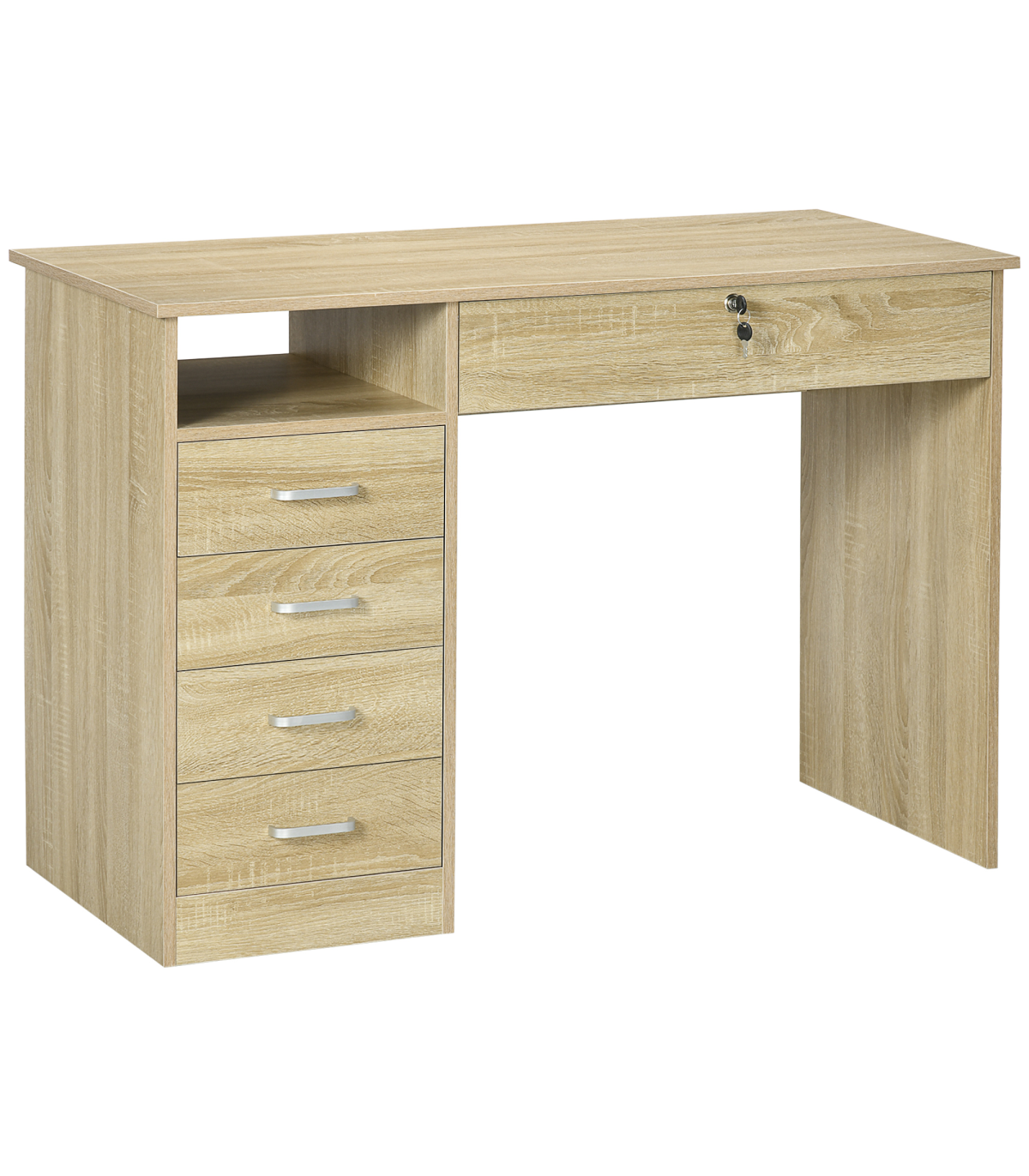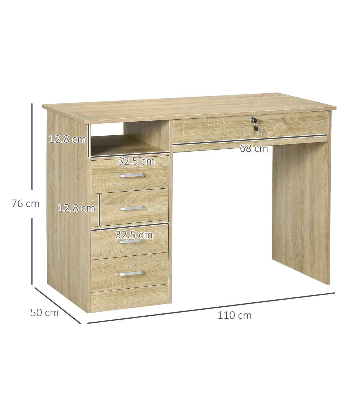 Storage: Large desktop, shelf and five drawers - this study table has enough space for your working essentials.Locking drawer: One below the table top - gives you peace of mind with keeping your private files and accessories safe in the PC desk. Two keys included.Sturdy structure: Particle board formation, this computer table is made to be used everyday. Classic and forever-in-style finish.Dimensions: 76H x 110L x 50Wcm. Locking drawer inner: 7H x 63L x 33.5Wcm. Other drawers inner: 7H x 27.5L x 33.5Wcm. Shelf: 12.8H x 32.5W x 47Dcm.Maximum load 80?kg, assembly required.