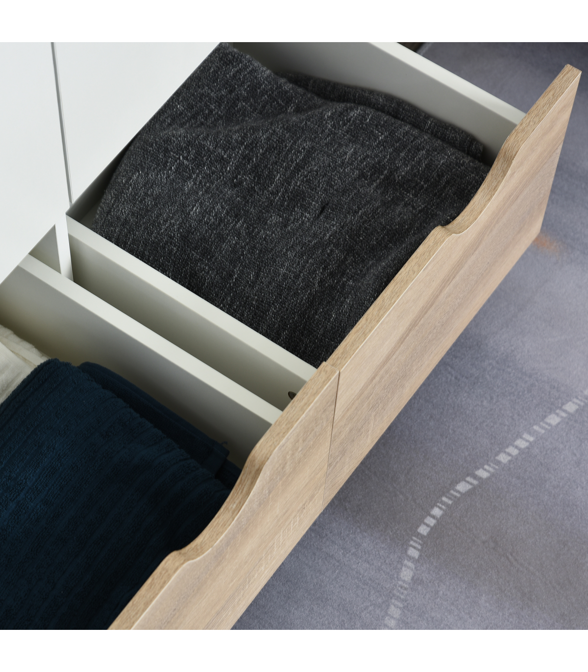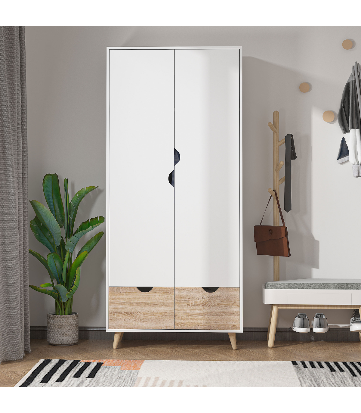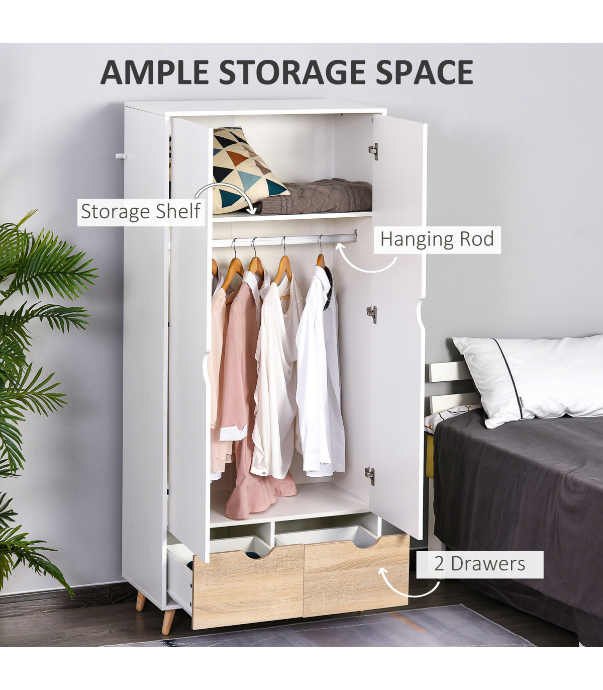 Design features the main compartment with metal clothes rod and shelf, with bottom two slide-out drawers for extra storage