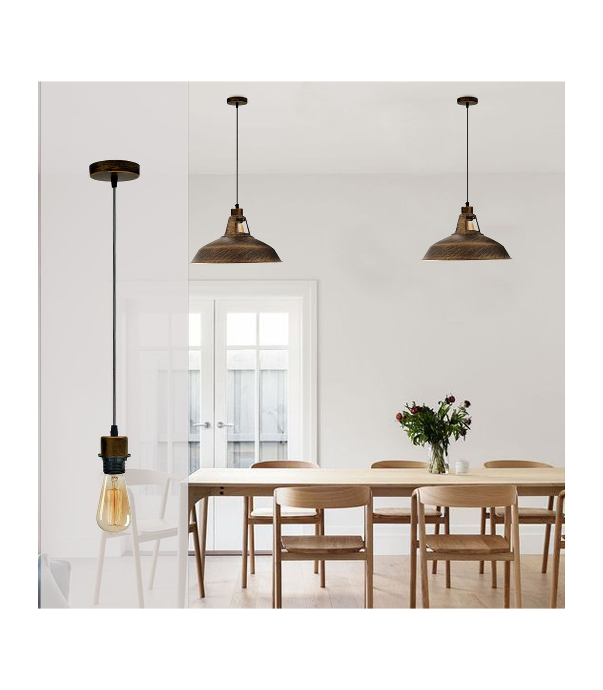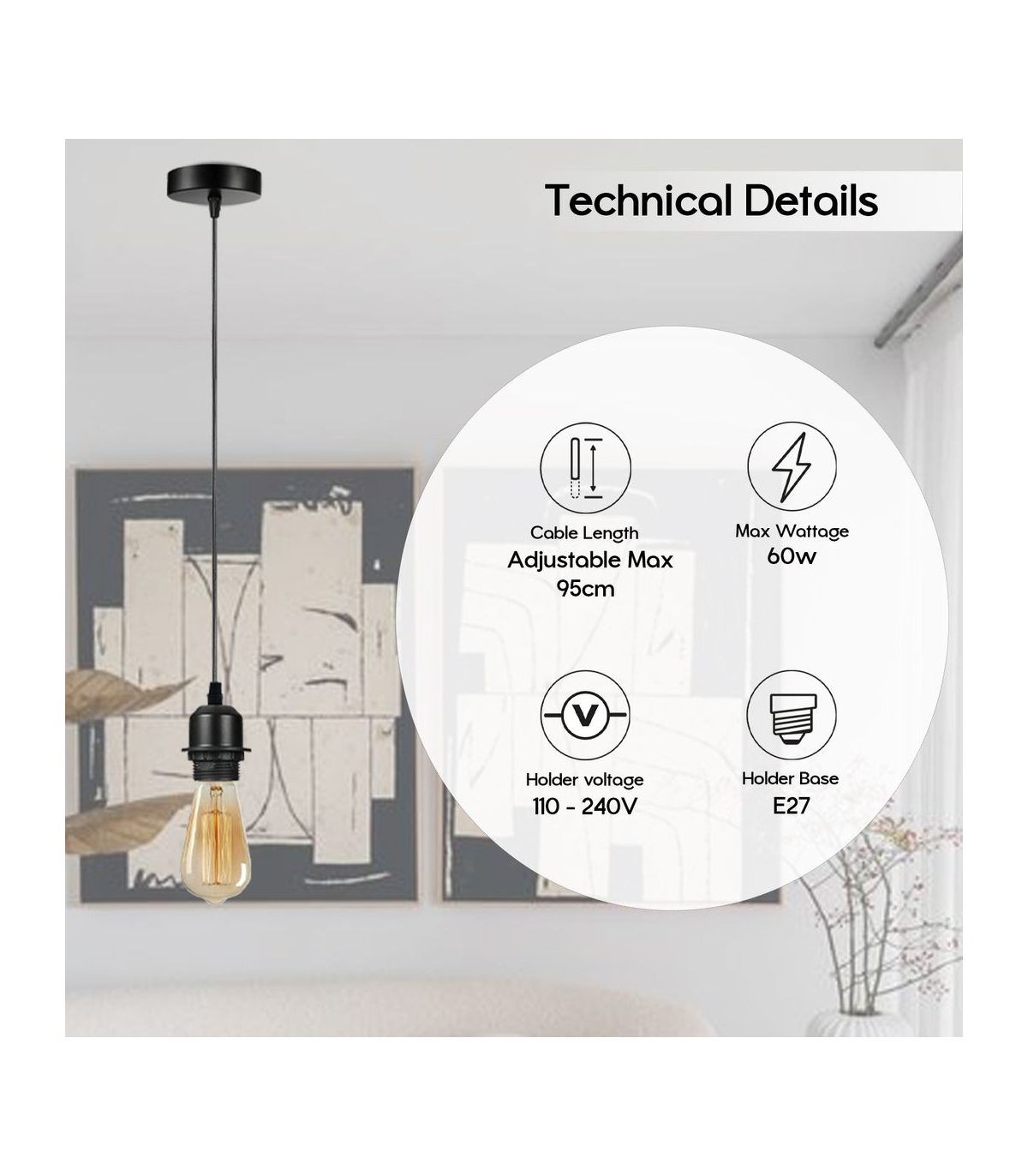 Features: The pendant light kits are designed with contemporary style. Ideally, the filament retro bulbs will be a good choice to bring out the character of this fitting. All the parts comply with the british standard. Perfect for adding lampshades. It can be dimmable when used with a matching dimmer switch and dimmable bulb. Item Specifications / Technical Details: Item Type: Pendant light holder Style: Vintage/Retro Voltage: AC110V-240V Material: Metal/PVC Bulb Requirements: Requires E27 max 60W Bulb Type: Compatible with all kinds of E27 bulbs Installation Area: Indoor Power Source: Hardwired Cable length: 95cm adjustable cable Dimmable: Yes(required a dimmable bulb and dimmer switch) Energy consumption: A+ with LED bulb Package included: 10 x Pendant holder with 95cm cable. 10 x Ceiling rose and all the necessary fittings.