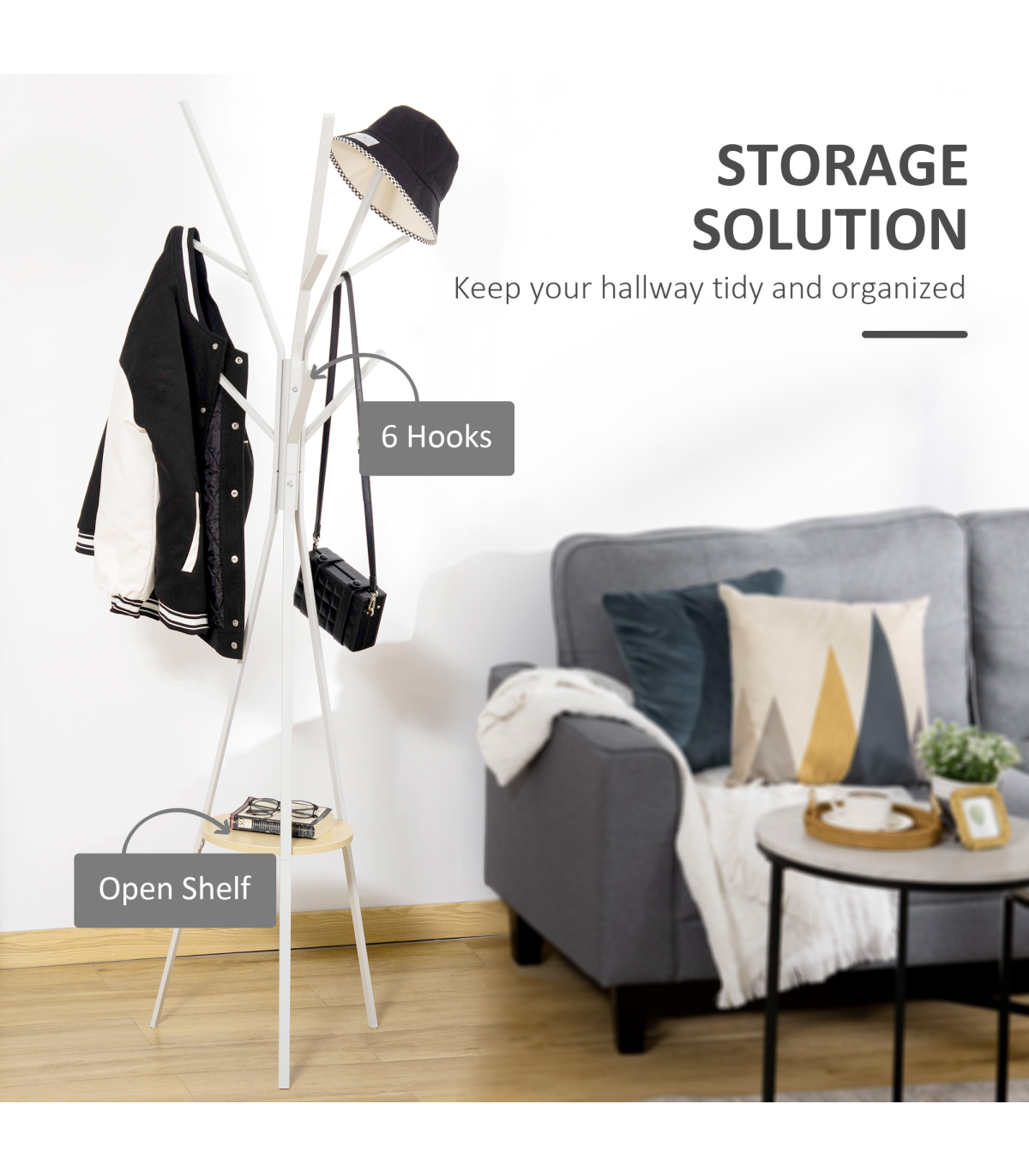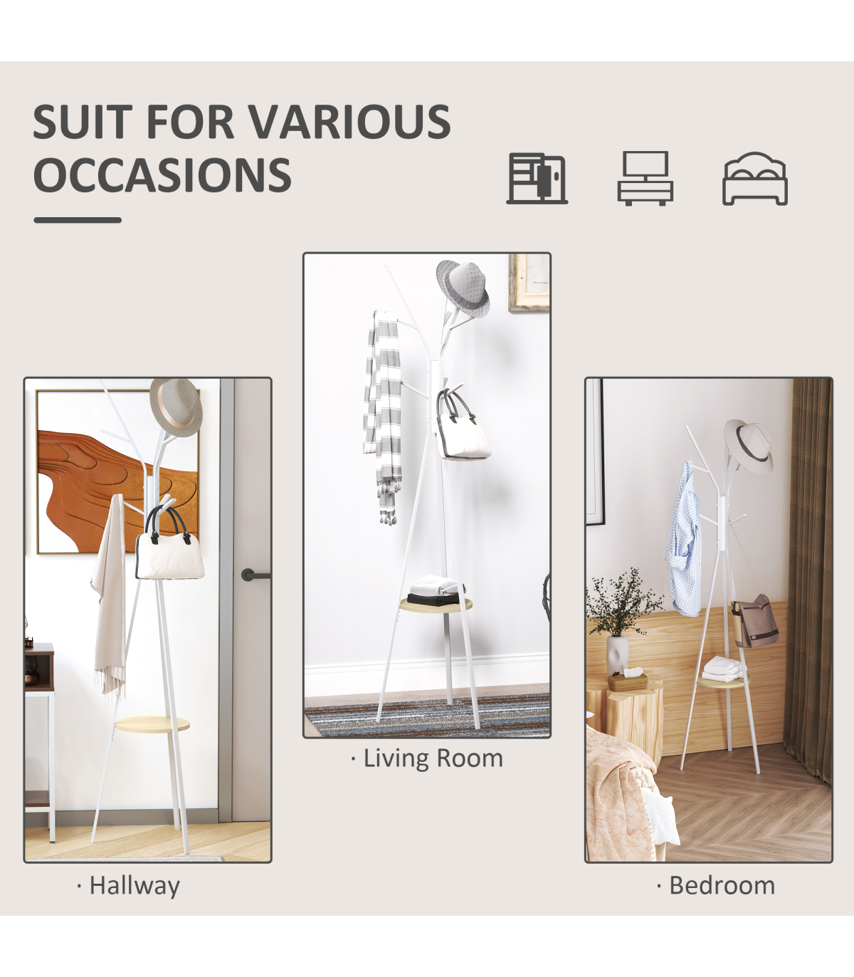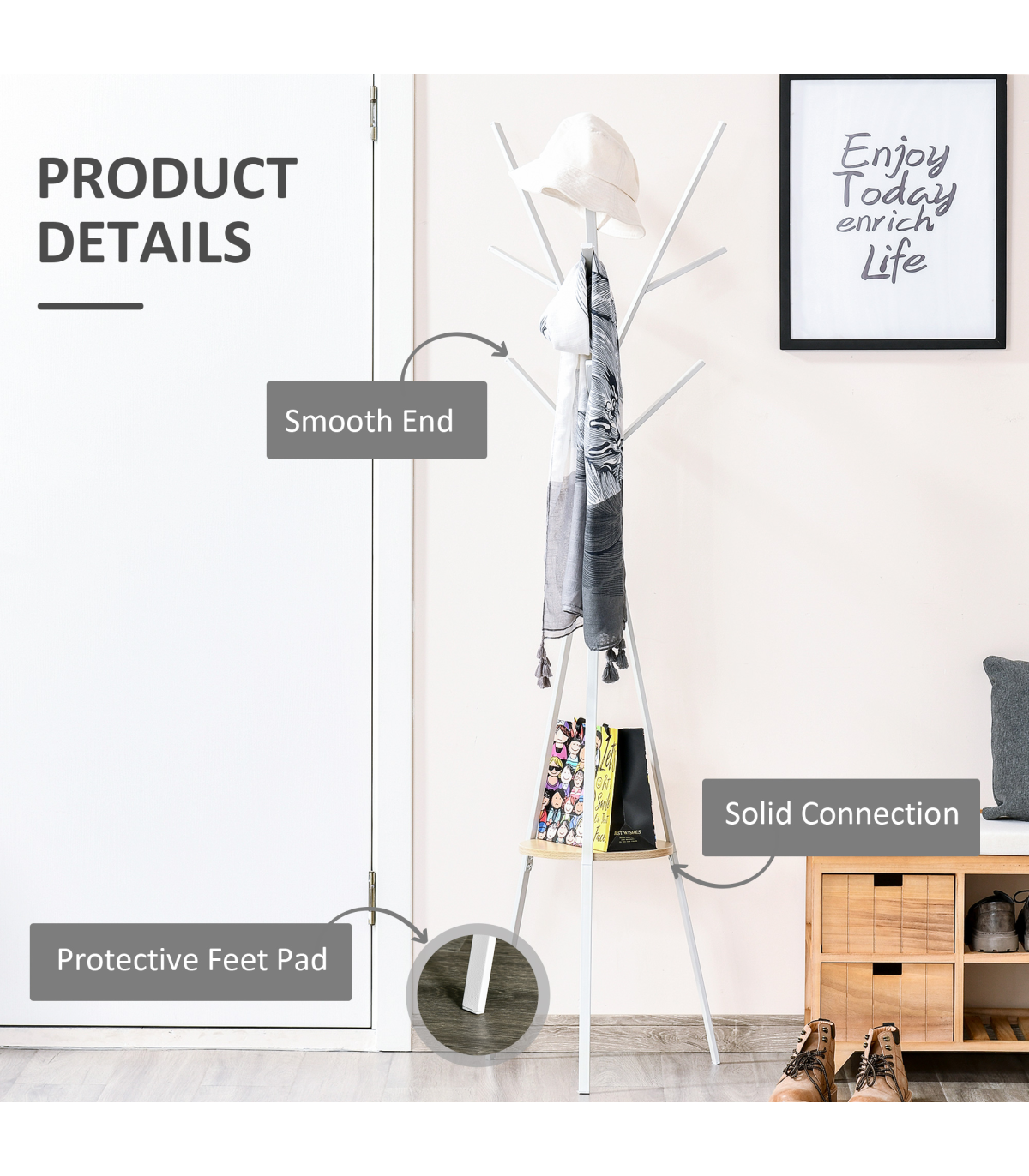 - "180cm Coat Rack Metal Clothes and Scarves Hat Hanger Hall Tree 9 Hooks - White" Description: - Tree Branch design coat rack, ideal for living room, bedroom, entryway, and more - 3 main branches with 9 hooks for coats, handbags, scarves, jackets, and more - The bottom circle shelf can store bins, toys, and flowerpot as you prefer - Crafted of a durable metal frame and thick fiberboard with a triangular base for added stability - End hook caps perfectly protect your clothing and hats - Stoving varnish finish on the surface makes the coat rack water-proof, rust-proof, and easy to clean - Assembly Required