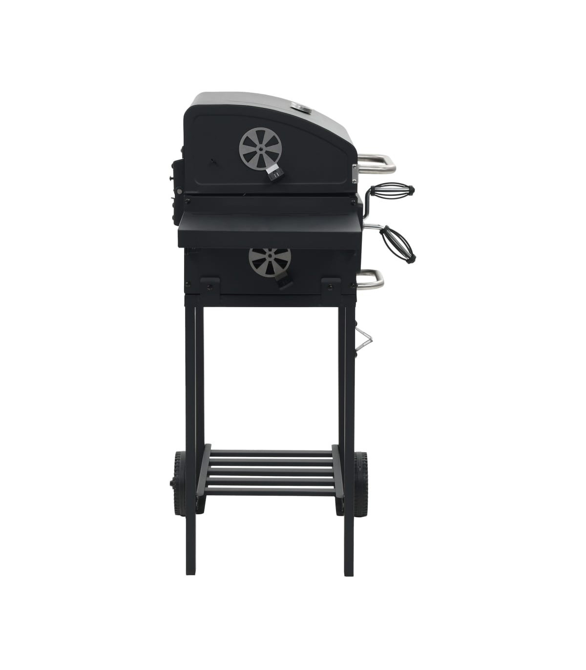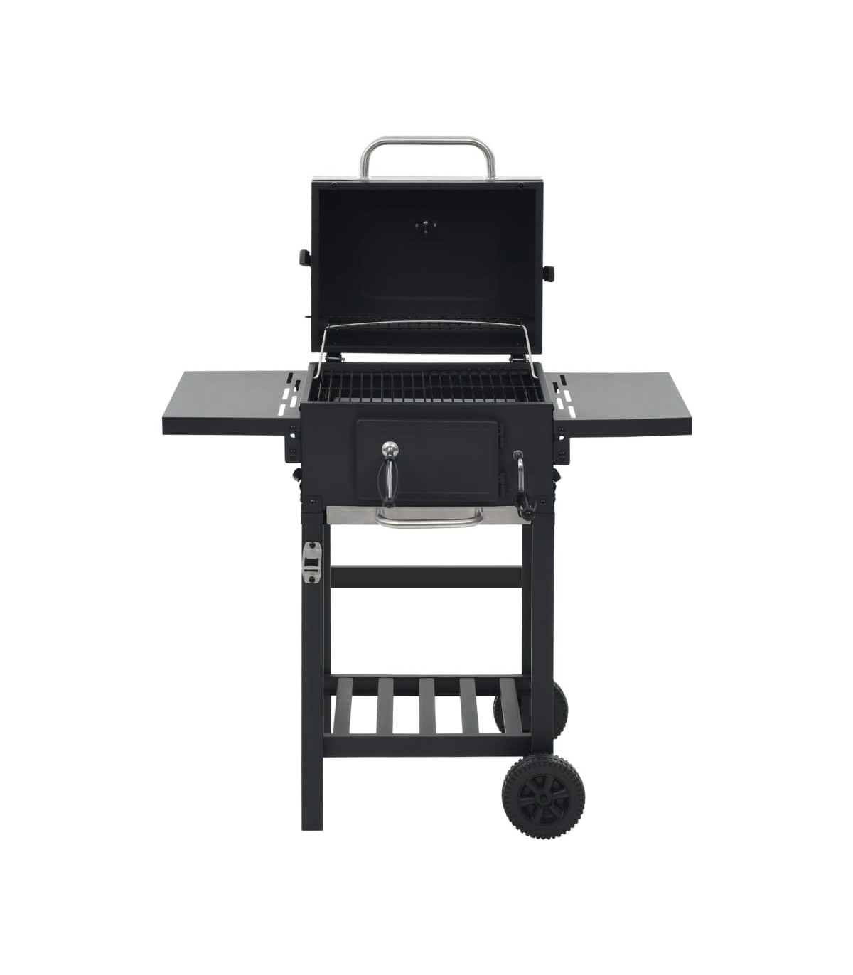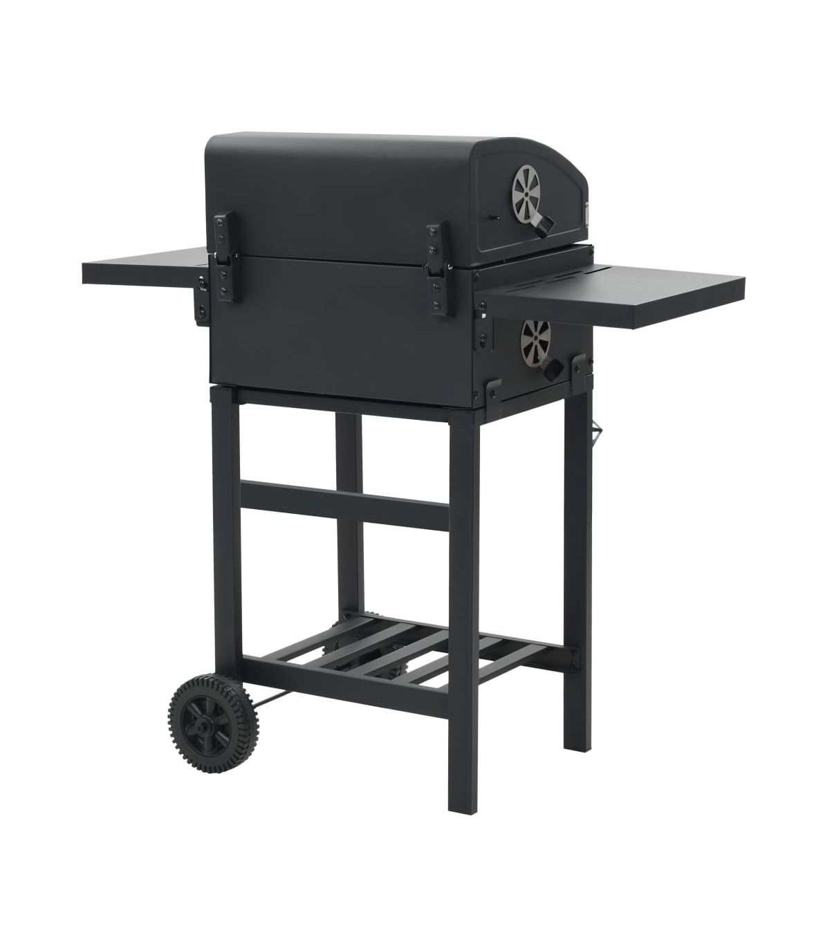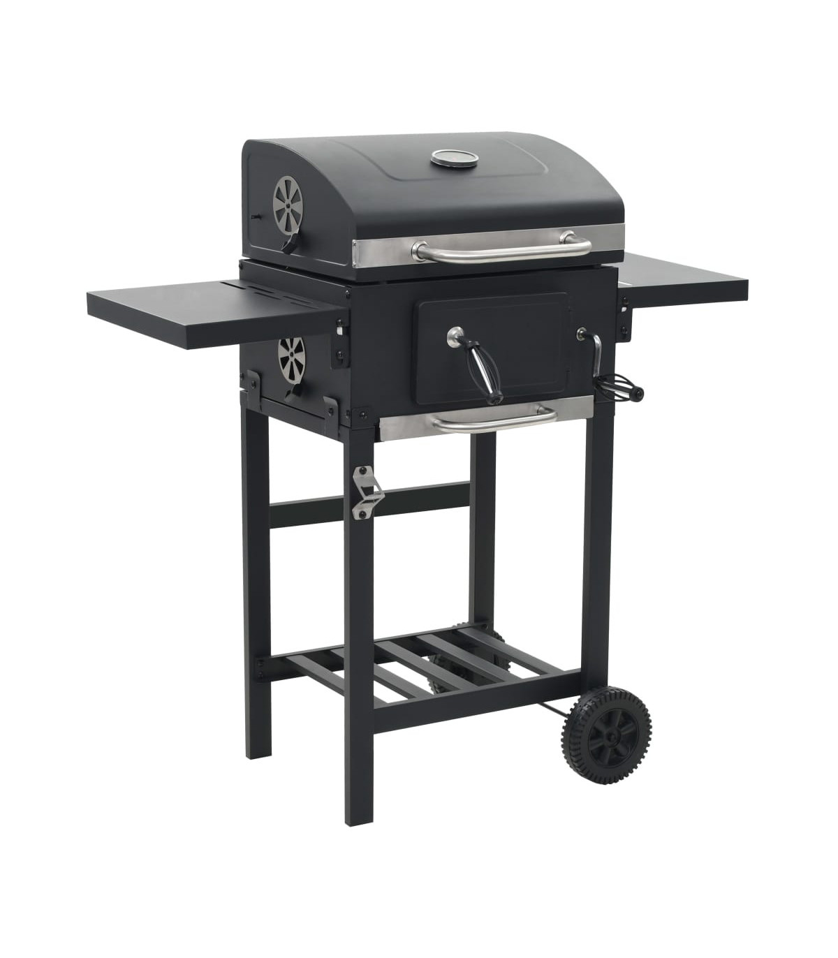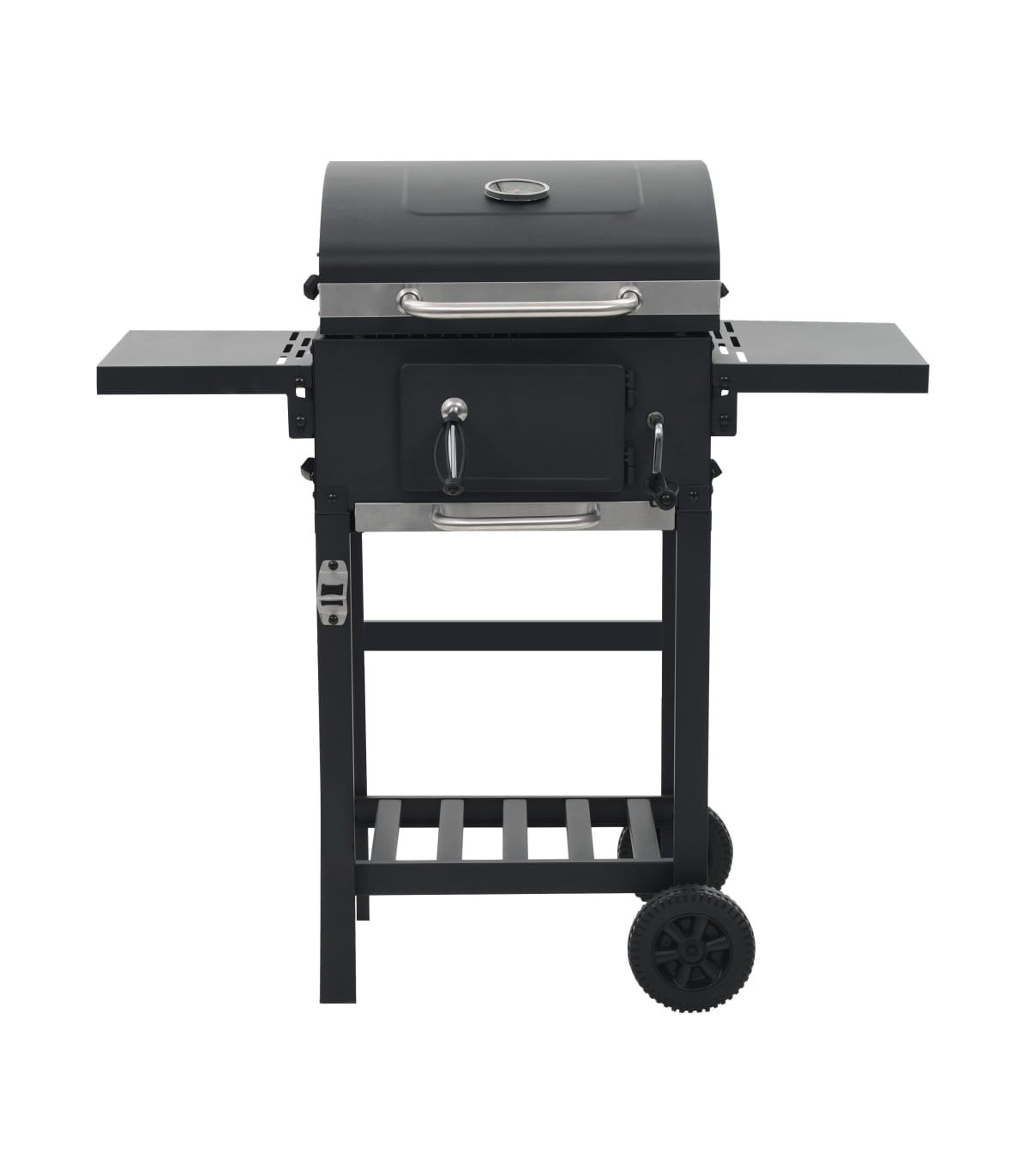 This heavy-duty charcoal-fueled BBQ grill is ideal for creating an outdoor feast for your family and friends. It will make your outdoor cooking experience sizzle, effectively turning your backyard into a second kitchen! Using charcoal as fuel, this barbecue grill is suitable for grilling, broiling and smoking. You can monitor the temperature in the chamber with the integrated thermometer on the hood. Thanks to the powder-coated steel body, our barbecue grill has a sleek and stylish design and is very durable. It has 2 pieces of enamelled cooking grid and a heavy-duty hood. Two foldable side tables offer additional space for creating sauces or your favourite side dishes. Equipped with 2 castors, this grill is easy to move around. This barbecue grill will surely be an indispensable part for your outdoor activities!