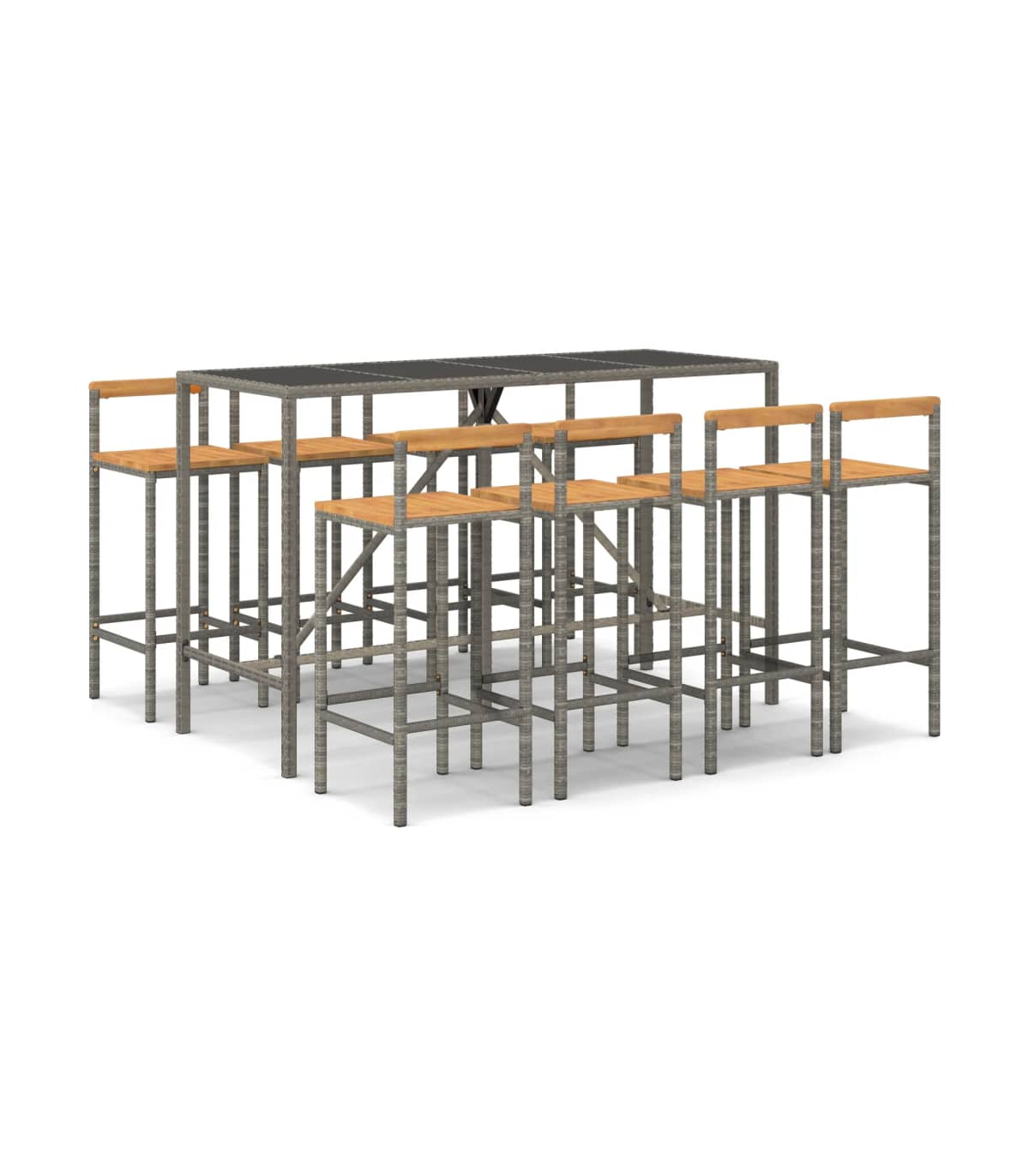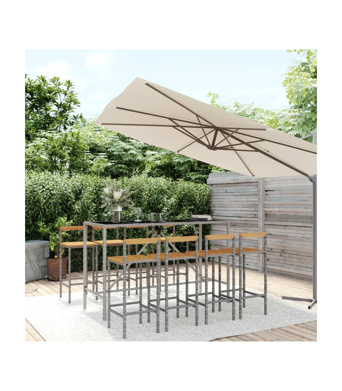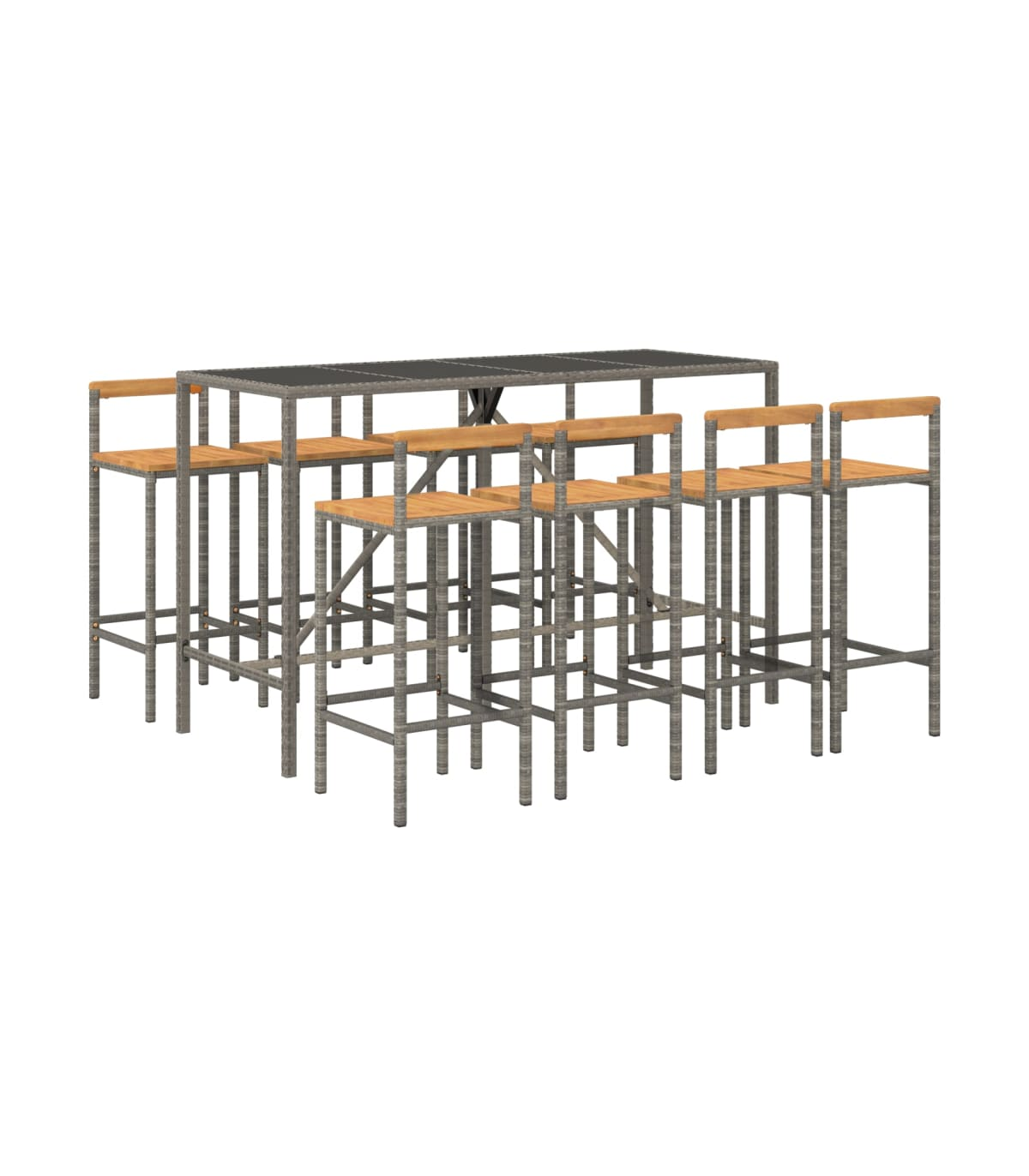 This trendy garden bar set, combining both style and function, is surely meant to be the centrepiece of your garden, patio, and any other living space. Weather-resistant material: PE rattan, also known as poly rattan, is weather resistant and easy to clean. It remains beautiful on the outside for a long period of time. It offers great quality, convenience and an aesthetic look.Comfortable seating: The bar chair is designed with a built-in footrest and wooden backrest to offer you a comfortable seating experience. The wooden seat also gives the chair a natural and pleasant look while ensuring stability.Tempered glass tabletop: The tabletop is made of tempered glass, making it easy to clean. Additionally, it is also ideal for holding your drinks, snacks, and your favourite decorations.Sturdy and stable frame: The powder-coated steel frames make the pub set sturdy and stable for daily outdoor use.Wide applications: The bar table and chairs, with its remarkable design, create a pleasant overall appearance that integrates effortlessly into any environment. Good to know:To make assembly as easy as possible, each product is delivered with a manual.Note:To make sure your outdoor furniture stays beautiful, we recommend protecting it with a waterproof cover.