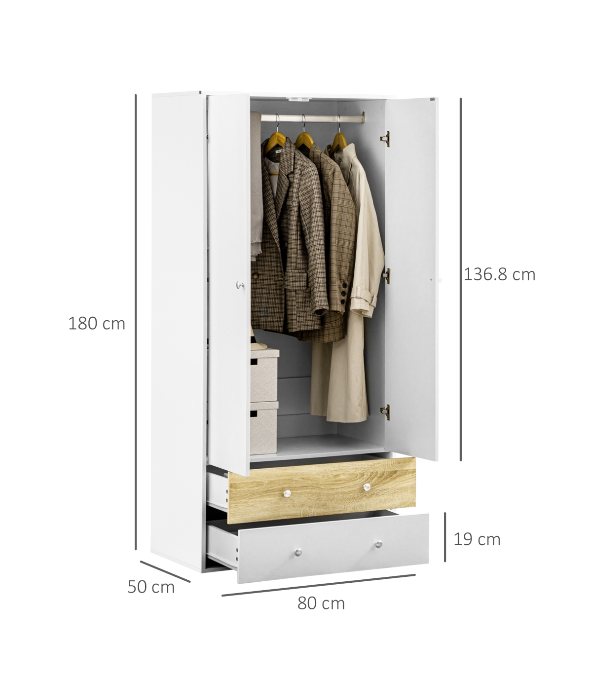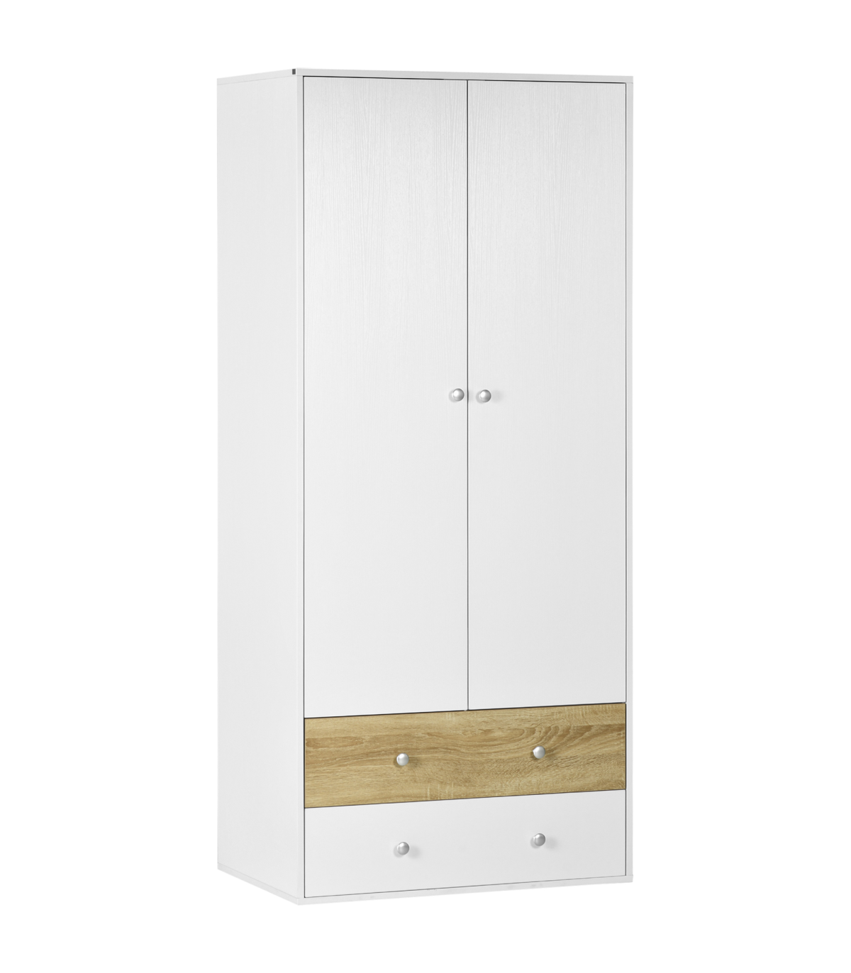Duo storage: A two-door wardrobe, with two bottom drawers. This double wardrobe offers space for hanging clothes and giving room for folded garments too.Modern design: A white wardrobe, with one wood-effect drawer - gently breaks up the one colour. A simple and beautiful look, this clothes wardrobe looks great in plenty of different spaces.Sturdy: Made from particle board for sturdiness, crafted into a tall wardrobe design - great for narrower spaces.Anti-tipping straps: Attach this wardrobe to your wall/solid surface to keep it stable. Safe for homes with children and pets.Dimensions: 180H x 80W x 50Dcm. Maximum load 10kg. Assembly required.
