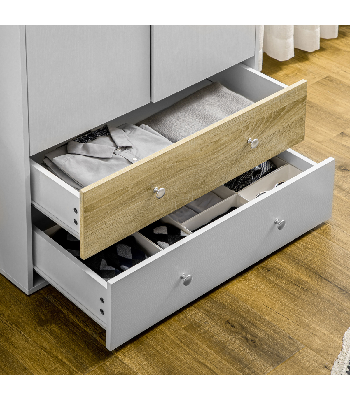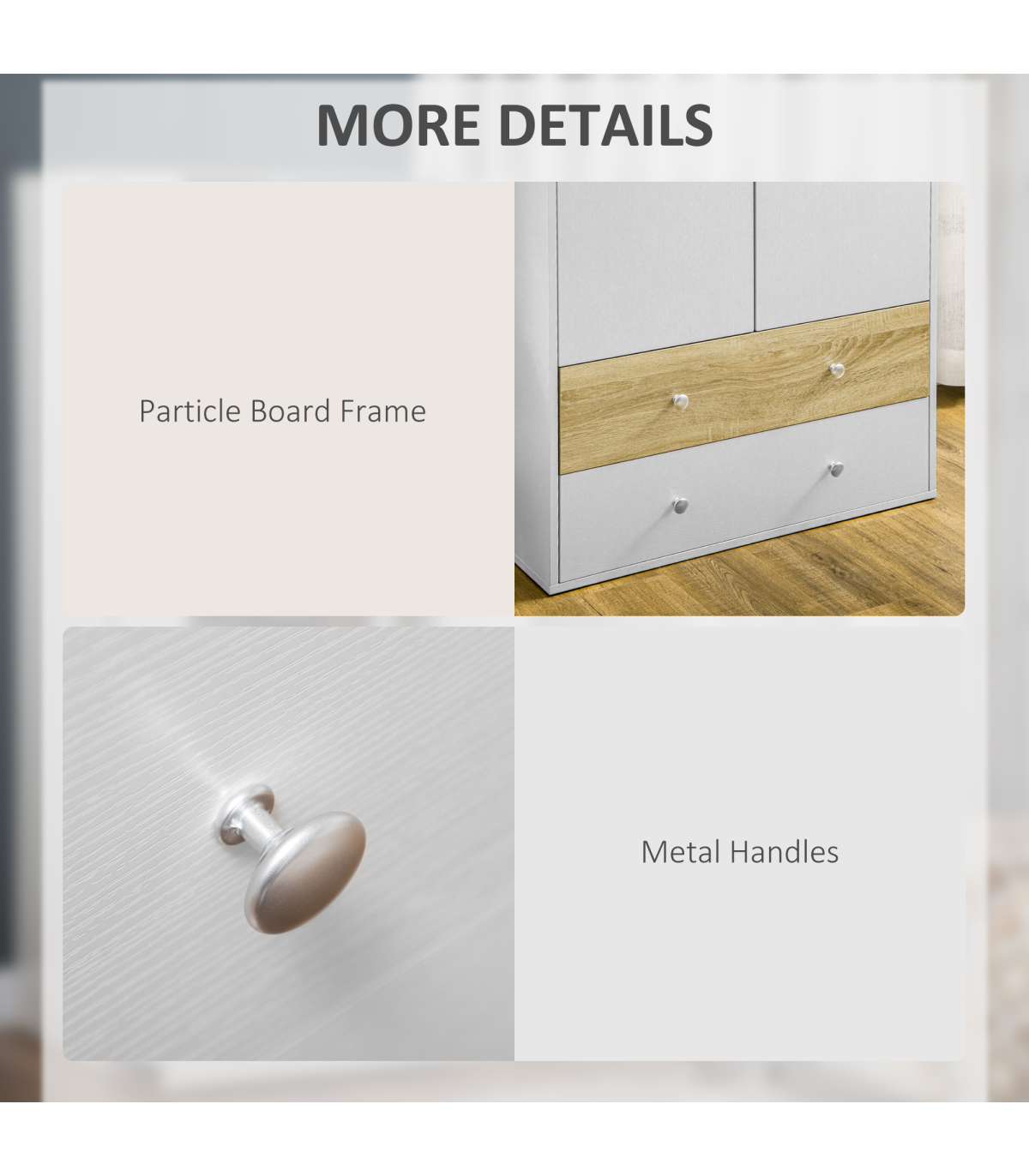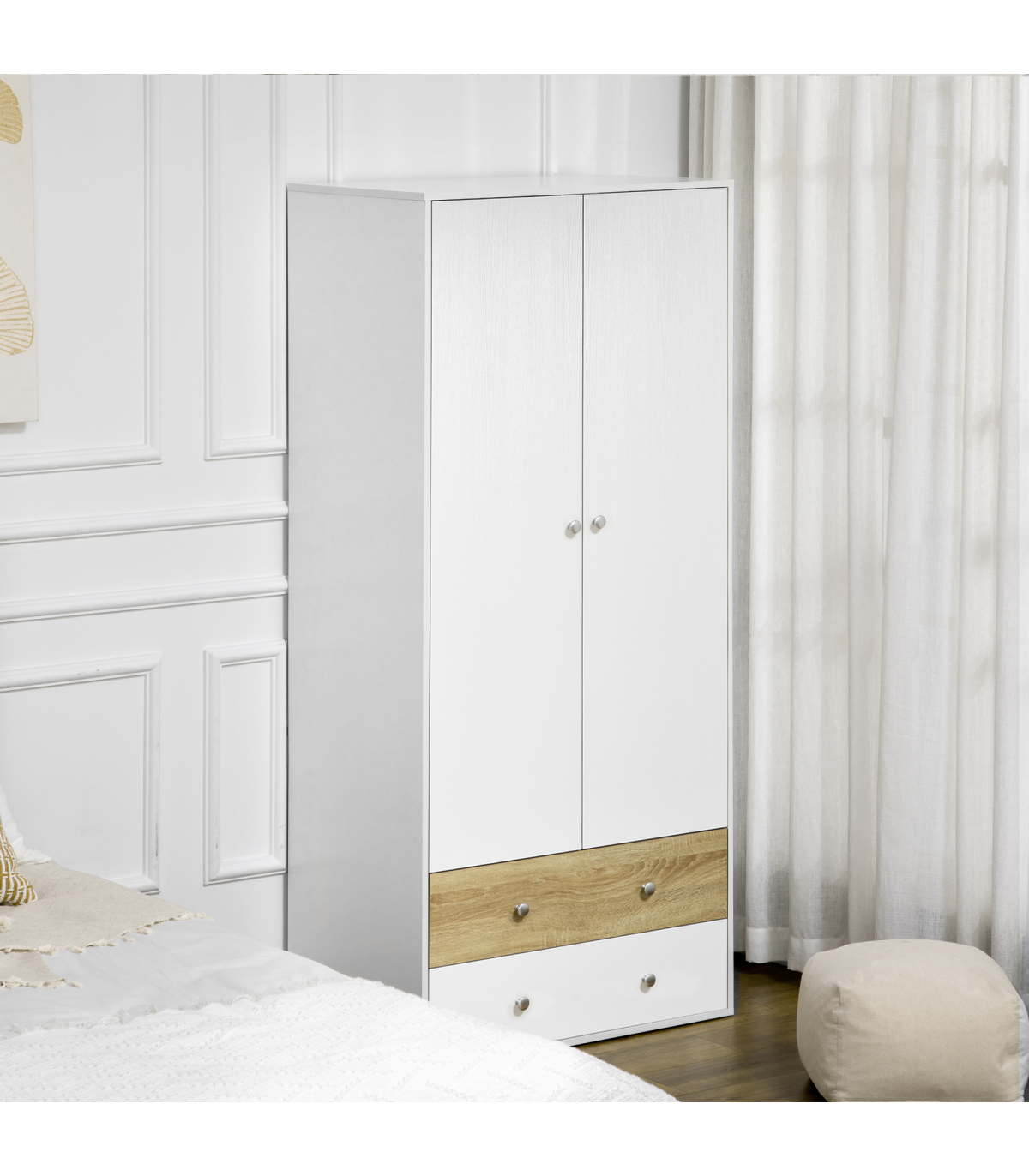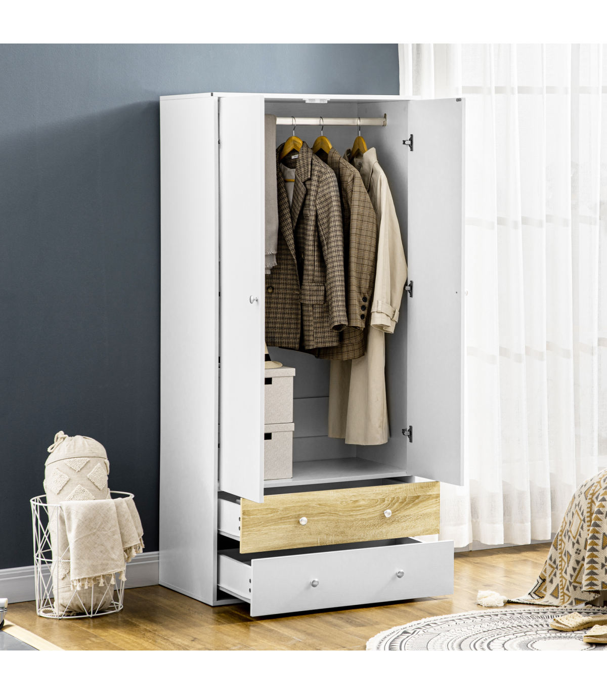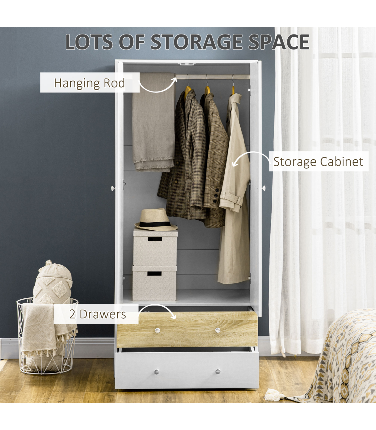 2 Door Wardrobe White Wardrobe with Drawers and Hanging Rod for Bedroom
