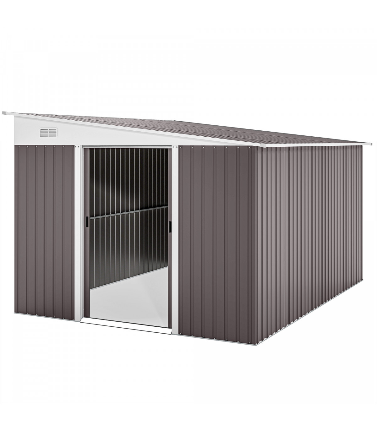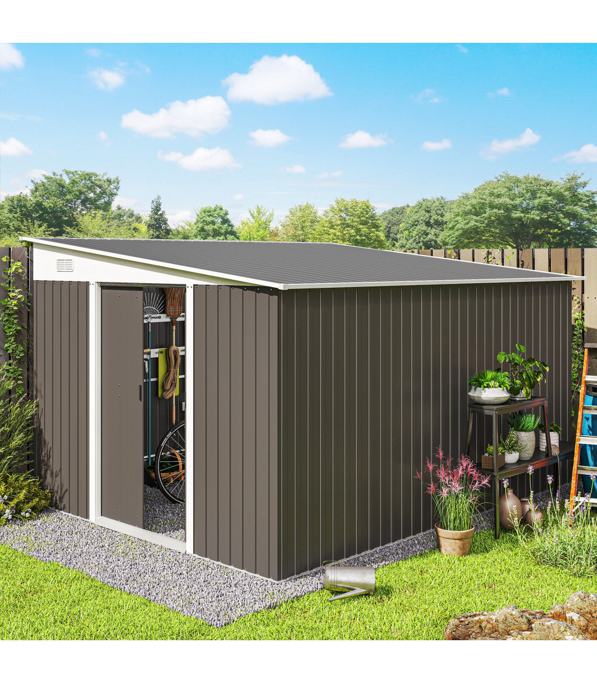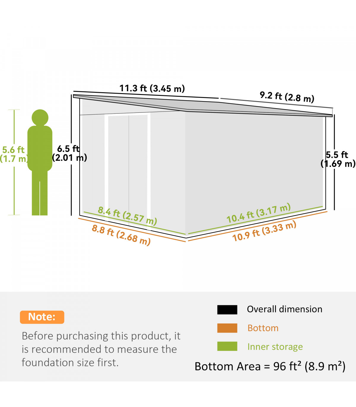 11.3 x 9.2ft Steel Garden Shed Metal Tool House Double Doors & 2 Air Vents, Grey