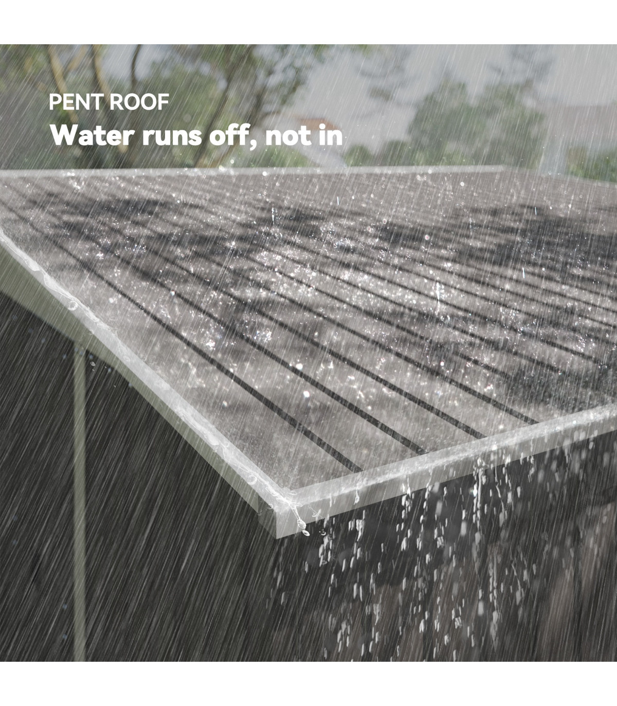 Corrugated steel frame, galvanized for extra strength. Tough, durable, and resistant to rusting and corrosion Sloped roof to prevent water build-up Double sliding door for easy access in and out Lock-on door for security, the padlock can be added (not included) Two ventilation slots to keep inside dry and fresh Please be aware, a floor foundation is NOT included Assembly required