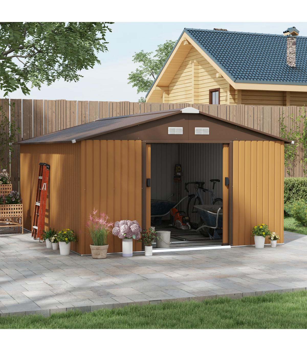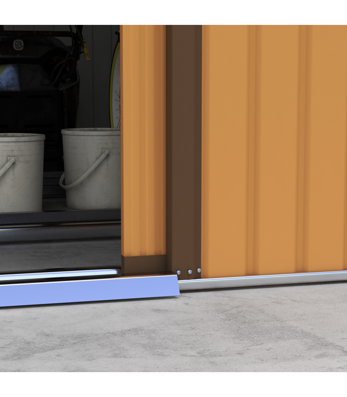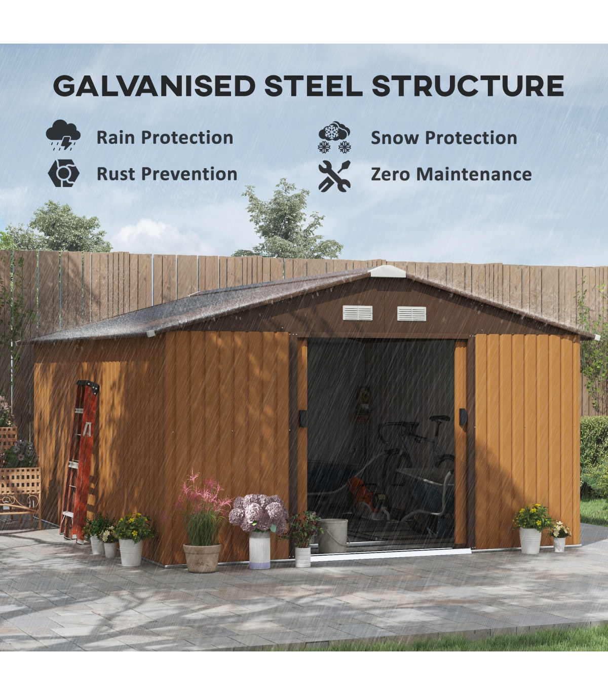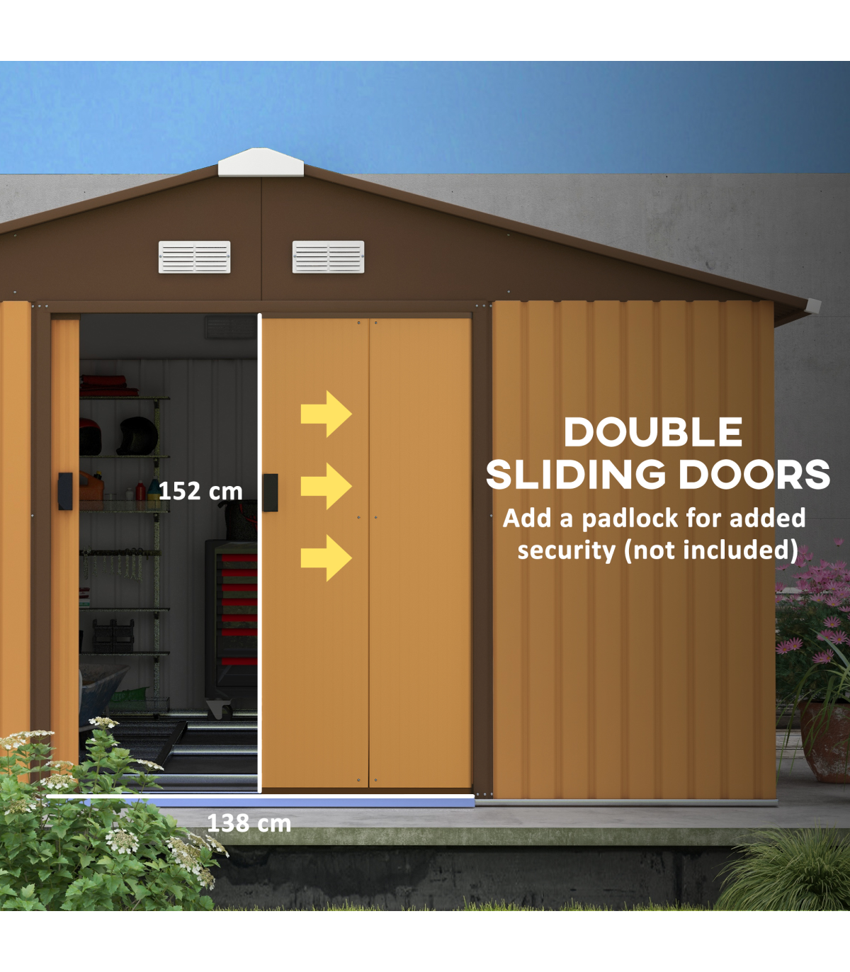 Serve as a tool shed, a bike shed, a mobility scooter shed, or a garden bin storage Spacious enough for storing all your outdoor tools, equipment and gardening gear in this galvanised shed Made from colour steel with a top coat for durability and protection against the elements Sliding double doors for easy access this metal storage shed Sloping roof for water to roll to floor, helping to prevent rust build-up Four ventilation to air to pass through this bike storage metal shed Floor foundation included, with all parts pre-cut and pre-drilled please use gloves when installing Assembly required