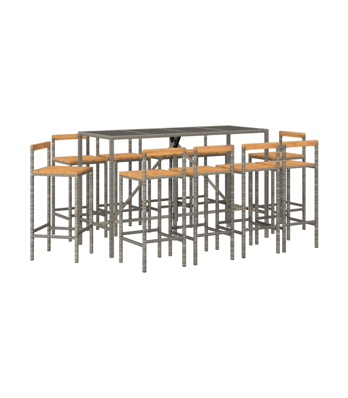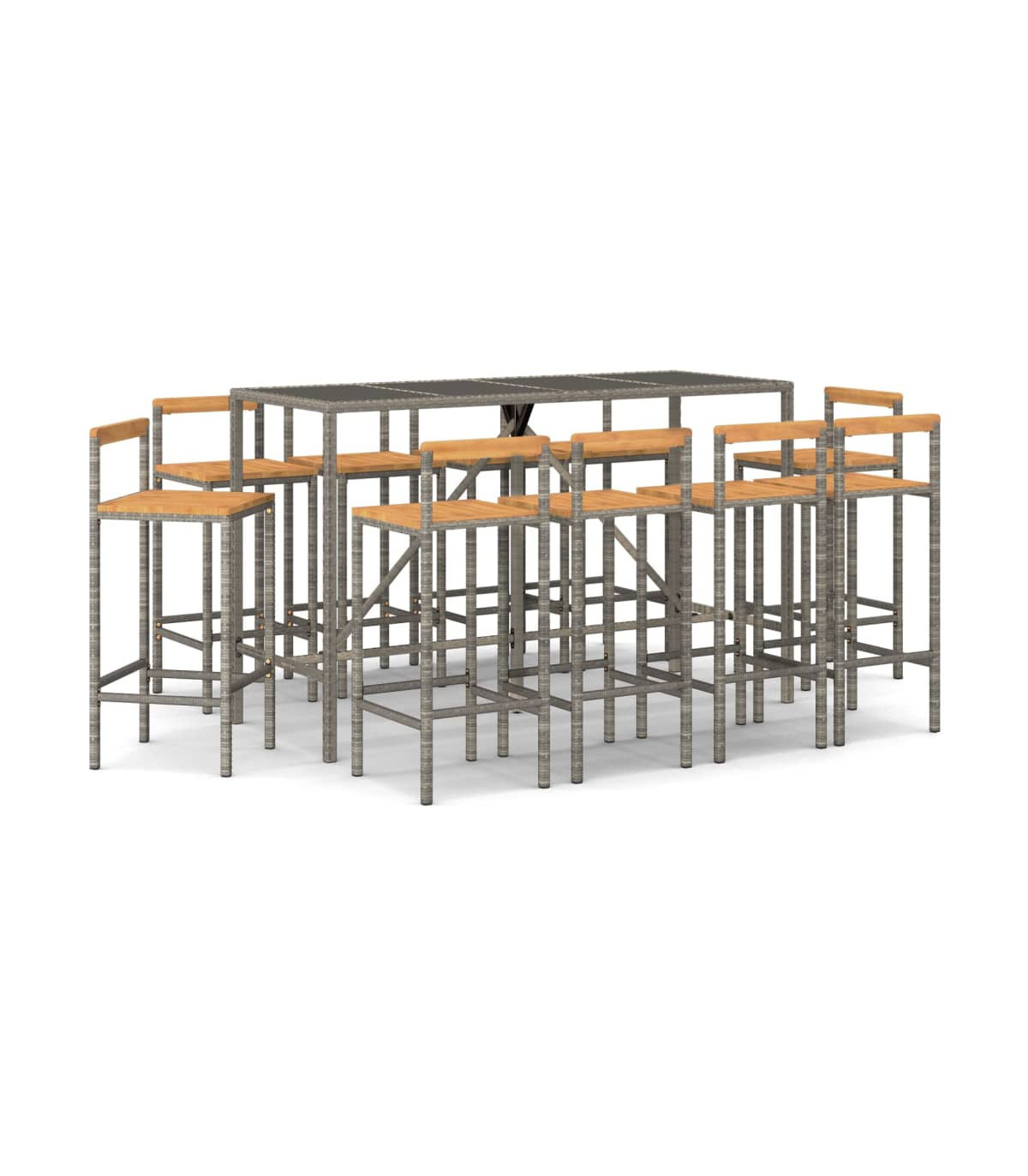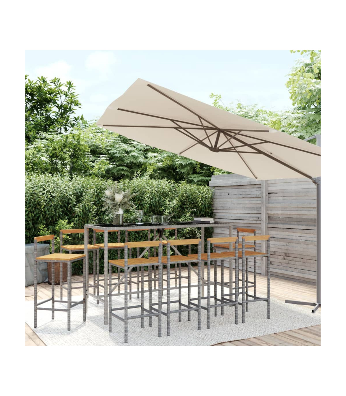 This trendy garden bar set, combining both style and function, is surely meant to be the centrepiece of your garden, patio, and any other living space. Weather-resistant material: PE rattan, also known as poly rattan, is weather resistant and easy to clean. It remains beautiful on the outside for a long period of time. It offers great quality, convenience and an aesthetic look.Comfortable seating: The bar chair is designed with a built-in footrest and wooden backrest to offer you a comfortable seating experience. The wooden seat also gives the chair a natural and pleasant look while ensuring stability.Tempered glass tabletop: The tabletop is made of tempered glass, making it easy to clean. Additionally, it is also ideal for holding your drinks, snacks, and your favourite decorations.Sturdy and stable frame: The powder-coated steel frames make the pub set sturdy and stable for daily outdoor use.Wide applications: The bar table and chairs, with its remarkable design, create a pleasant overall appearance that integrates effortlessly into any environment. Good to know:To make assembly as easy as possible, each product is delivered with a manual.Note:To make sure your outdoor furniture stays beautiful, we recommend protecting it with a waterproof cover.