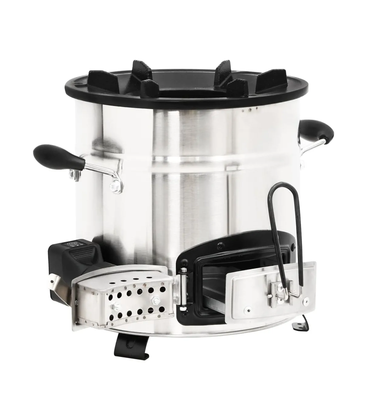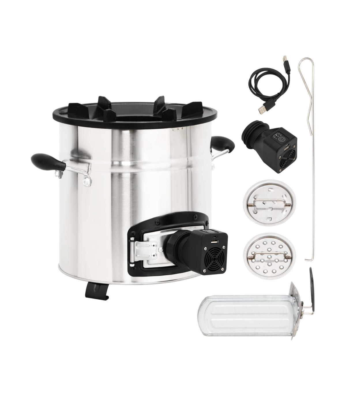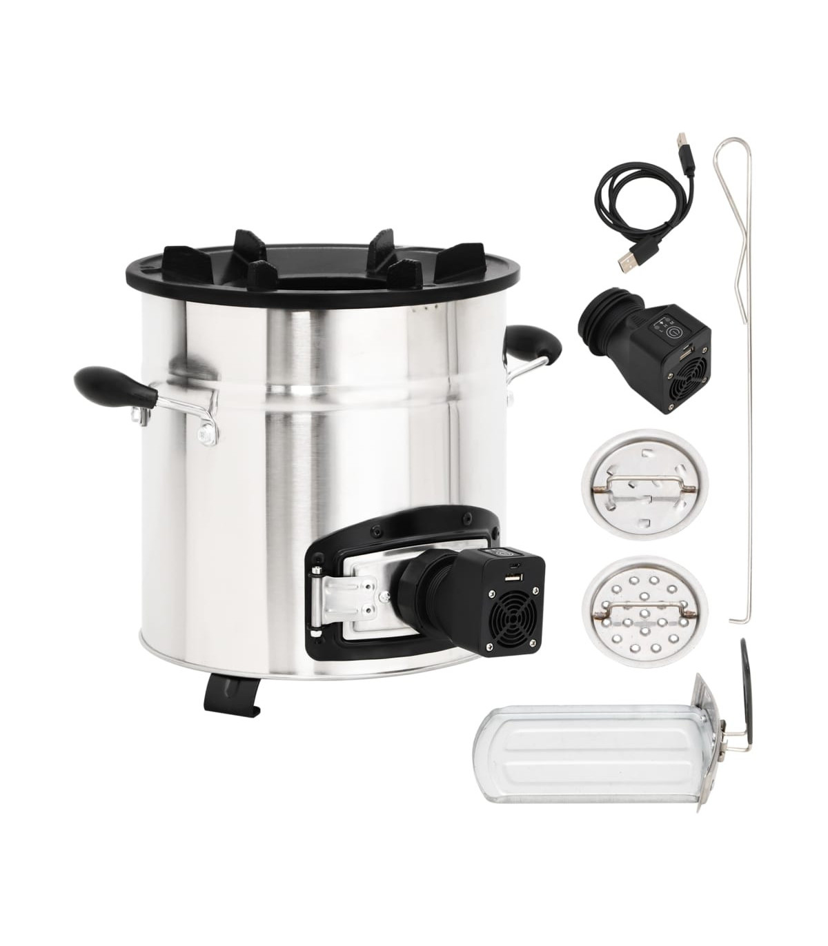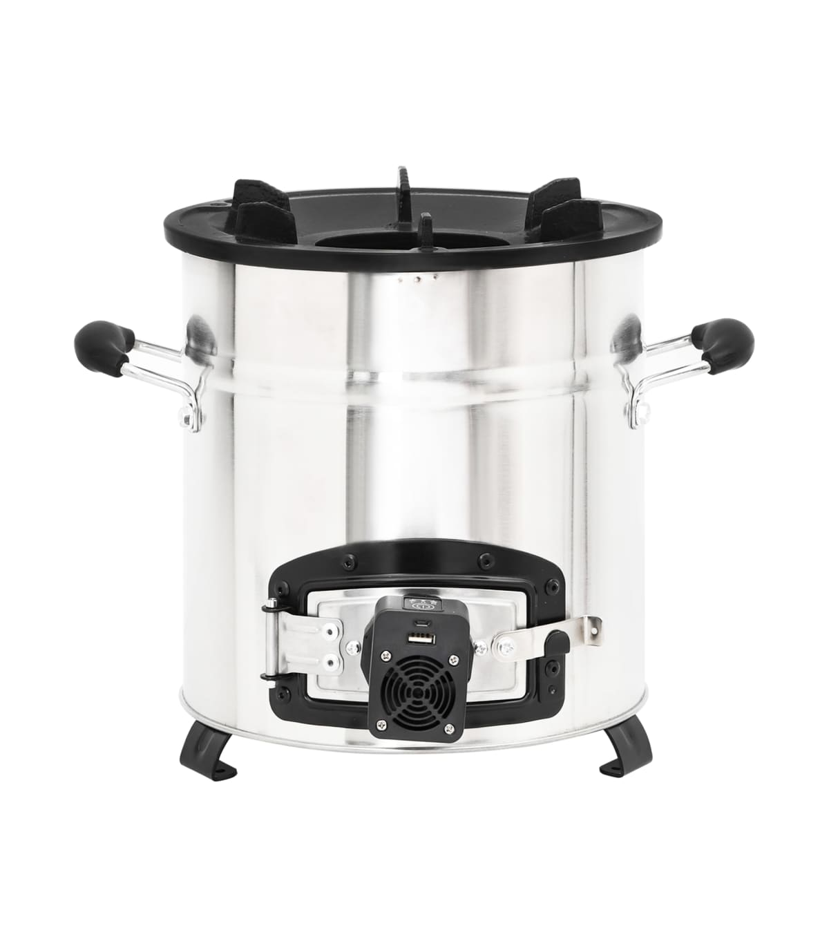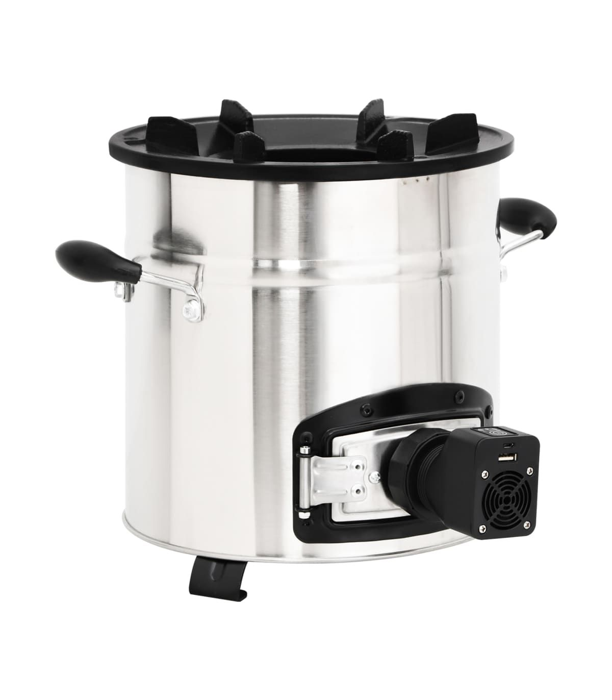 This wood stove with a USB fan serves as a cooking utensil when you have outdoor activities while creating some extra warmth and a cosy atmosphere when it gets colder. Energy saving: This charcoal grill uses wood, branches, leaves, charcoal, or solid biomass fuel. Its fully insulated vertical combustion chamber forces gases to mix with the flames, reducing harmful emissions and increasing fuel efficiency.Cast iron hearth: The fireplace features a durable, six-prong cast iron hearth frame. The low-profile design reduces the risk of chipping and can support a variety of cookware to suit all your outdoor cooking needs.Portable fan: The stove fan, with 3 operating modes, can heat up the wood-burning stove quickly. Thus, there is no need to blow it with your mouth. You can manage the firepower by pressing the button one or more times.Door design: The camping stove is also designed with a door at the bottom, which is used to assemble the fan. Additionally, you can remove cooled ash from the hole using the ashtray.Convenient handles: The outdoor heater for camping is equipped with 2 handles, allowing you to move the rocket stove safely. Note:The fan is powered by USB and the USB adapter is not included.Each product comes with an instruction manual in the box for easy assembly and use.The product must be only used outdoors.To avoid injuries and burns, do not touch the product when there is still burning wood inside or shortly after it.