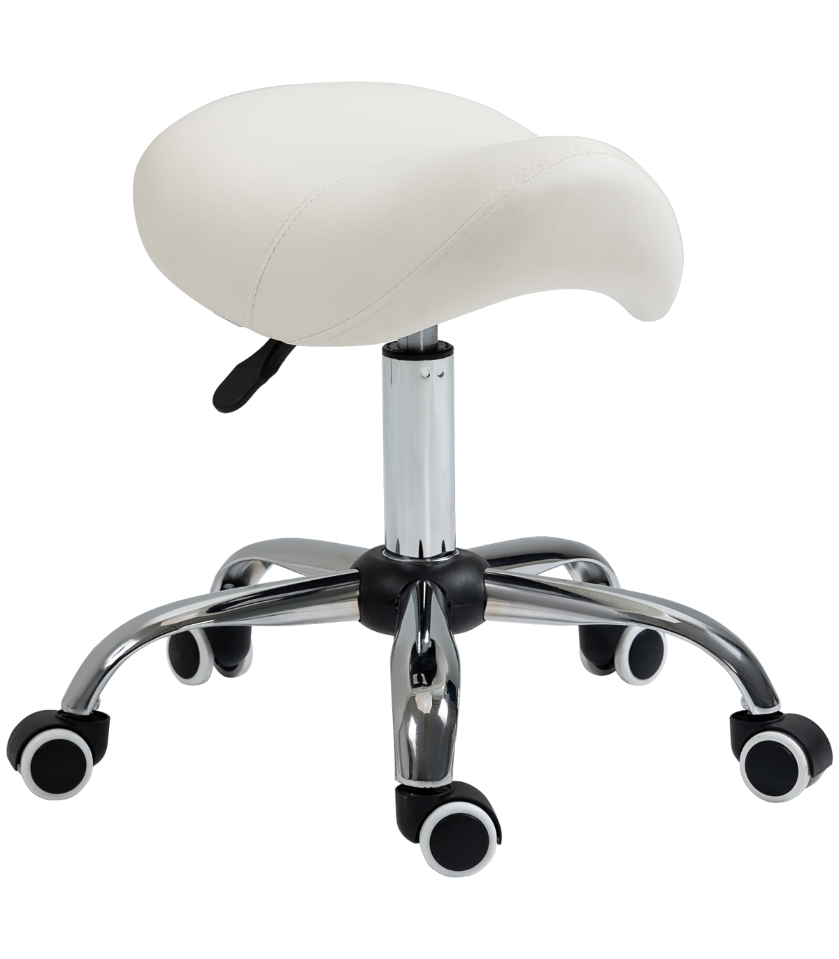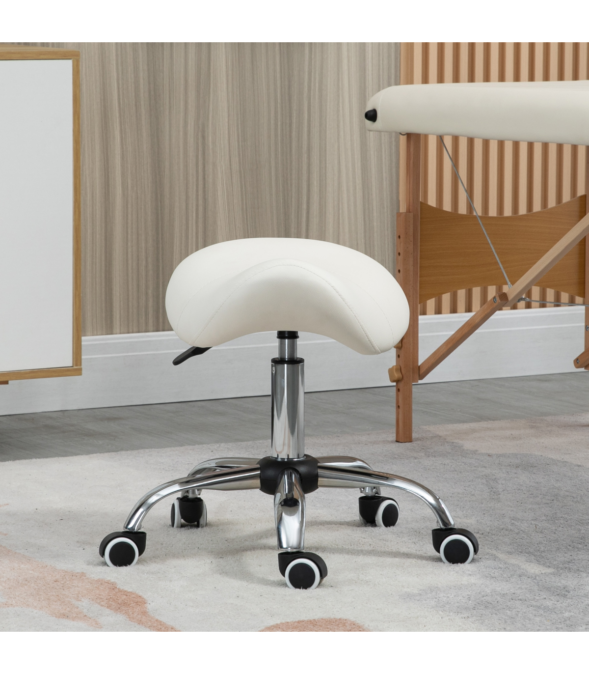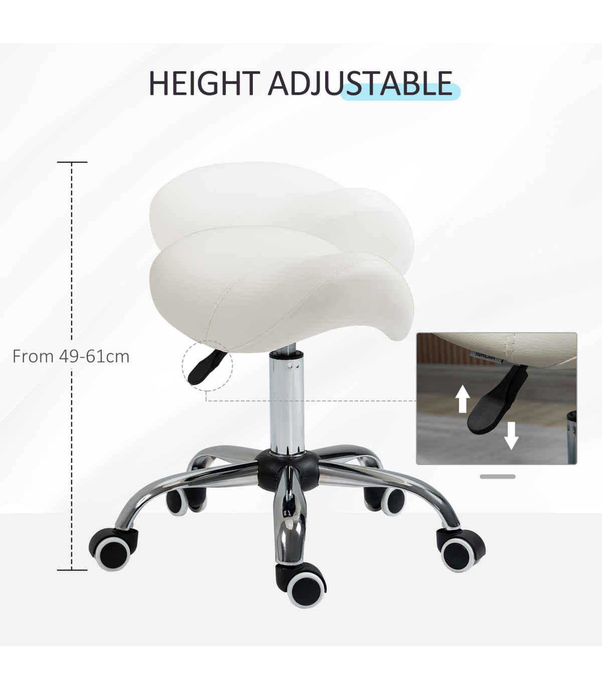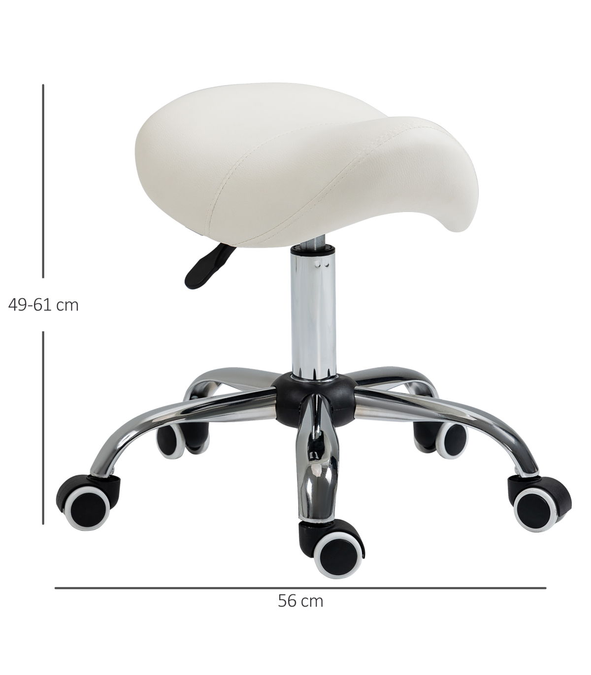 - Saddle Stool Hydraulic Rolling Faux Leather Height Adjust Mobility Chair Cream - Description: - Multi-use: Can be used for hairdressers, beauty salons, tattoo parlours, or even at home. - 49-61cm adjustable height: Set the beauty stool to a comfortable level with no straining. - Padded seat: Curved shape for better body adaptation and improved posture. Padded for comfort and wrapped in smooth faux leather. - Metal base with five wheels: Weighted base for stability. Five wheels for easy mobility while cutting hair or performing beauty tasks. - Dimensions: 49-61H x 52L x 53Wcm. Seat: 36L x 35Wcm. Maximum load: 120kg. Assembly required.