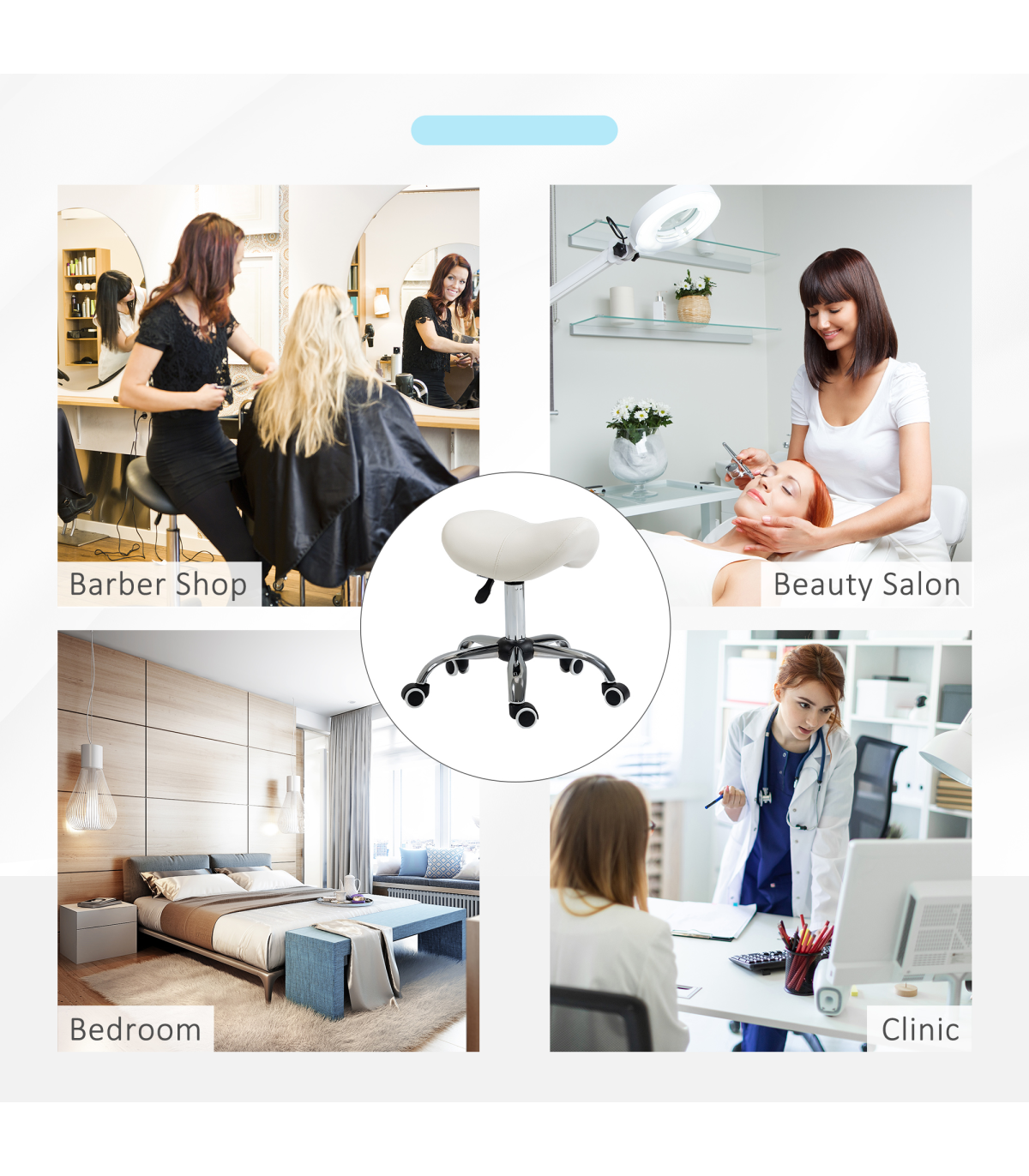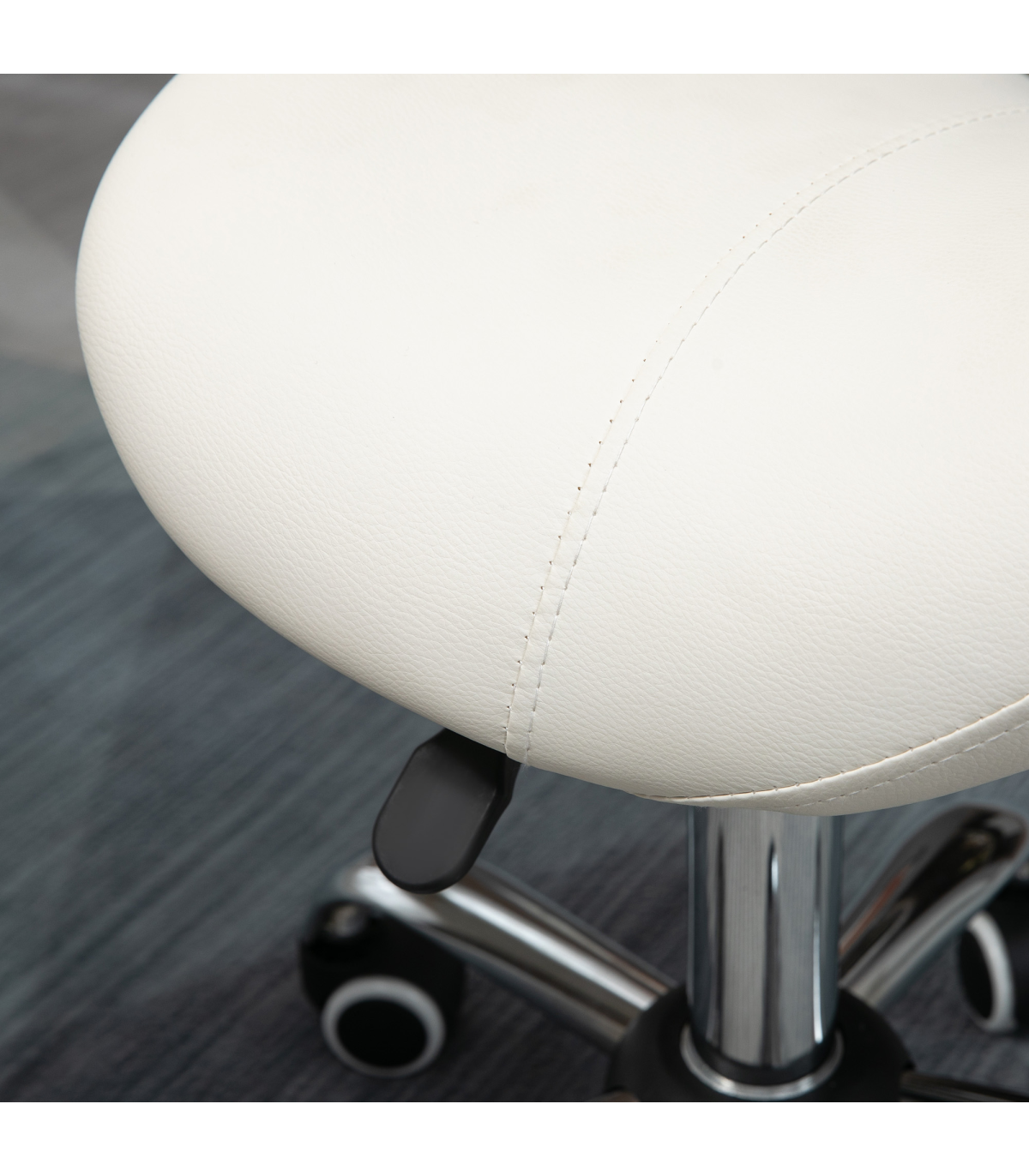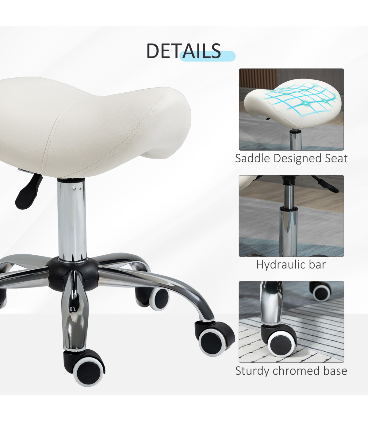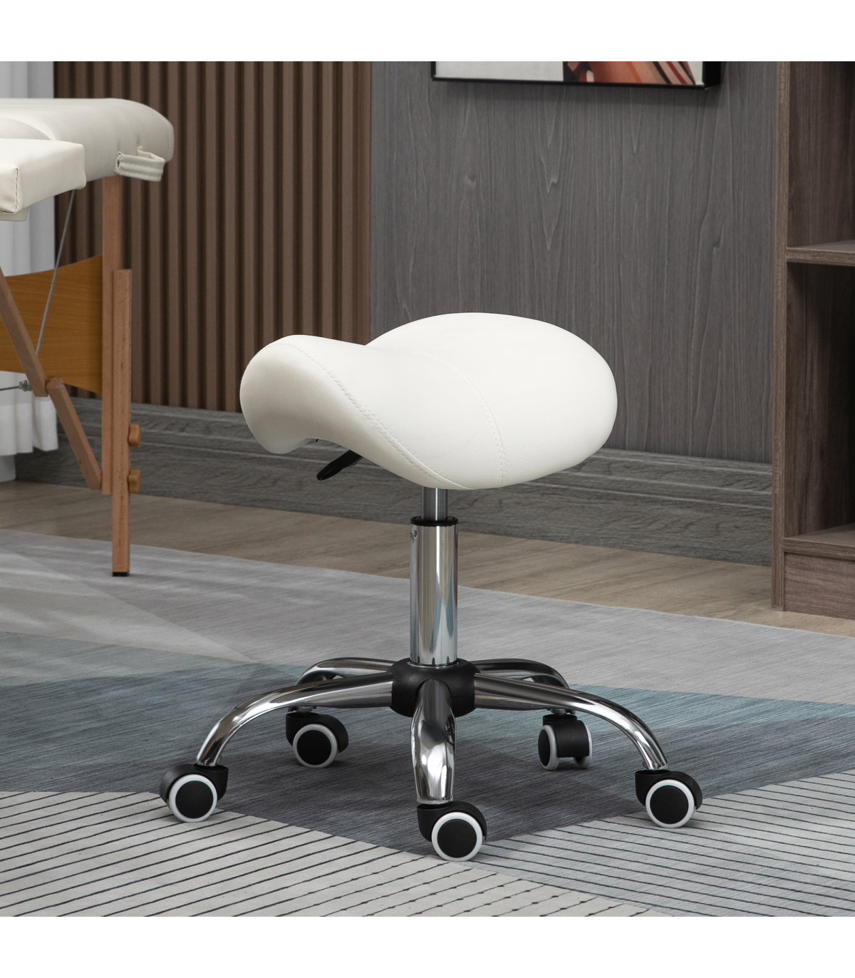 - Saddle Stool Hydraulic Rolling Faux Leather Height Adjust Mobility Chair Cream - Description: - Multi-use: Can be used for hairdressers, beauty salons, tattoo parlours, or even at home. - 49-61cm adjustable height: Set the beauty stool to a comfortable level with no straining. - Padded seat: Curved shape for better body adaptation and improved posture. Padded for comfort and wrapped in smooth faux leather. - Metal base with five wheels: Weighted base for stability. Five wheels for easy mobility while cutting hair or performing beauty tasks. - Dimensions: 49-61H x 52L x 53Wcm. Seat: 36L x 35Wcm. Maximum load: 120kg. Assembly required.