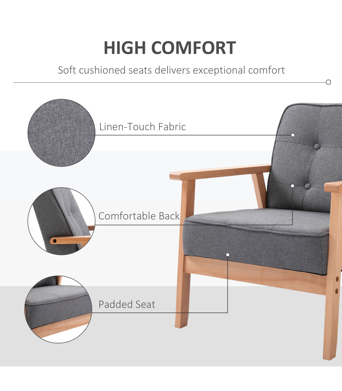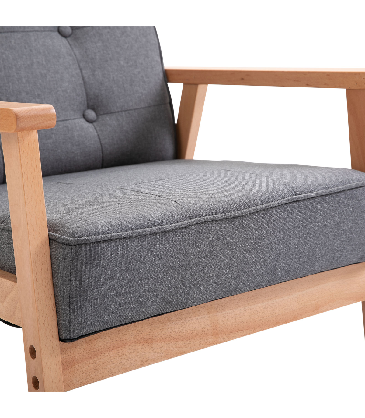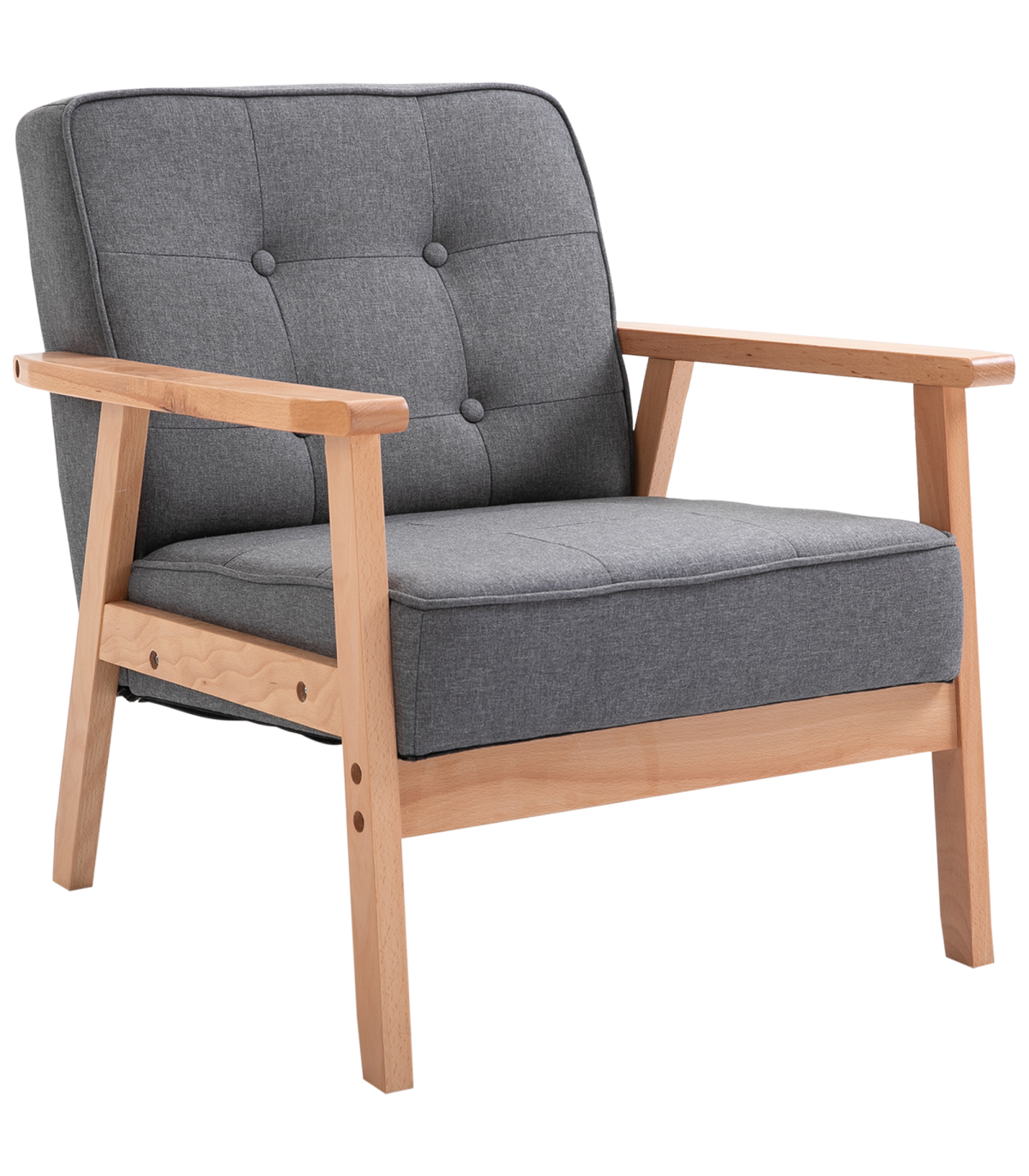 Retro Single Sofa Armchair Beech Wood Frame Padded Cushion Linen Fabric Grey