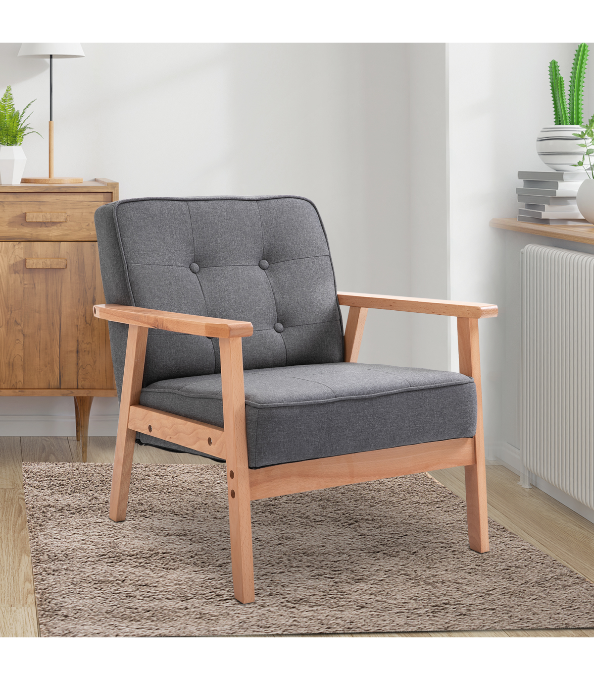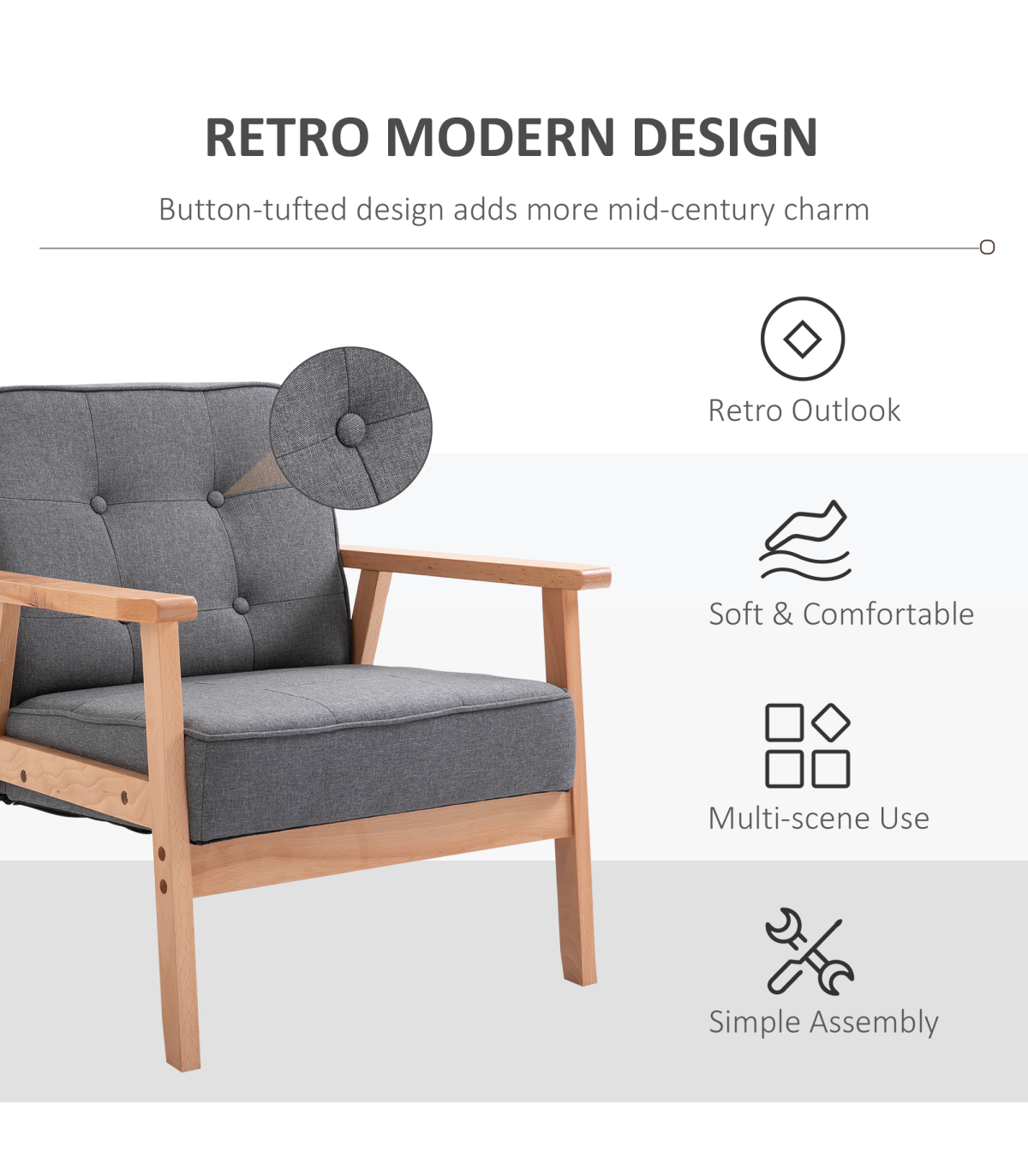 Beautiful retro styling: Perfect for injecting a talking spot into your living room, bedroom, conservatory, balcony with our accent chairs.Solid wooden frame: A strong frame for this comfy chair for living room - keeping you supported as you relax.Padded seat and backs: Keeps you comfortable as your relax - with wide seat to give you plenty of room to sit.Linen upholstery: Fresh-looking and easy to clean and maintain. This armchair features tufting and piping for an elegant touch.Dimensions: 74H x 64.5W x 70Dcm. Seat: 42H x 53W x 44.5Dcm. Maximum load 200kg. Assembly required.