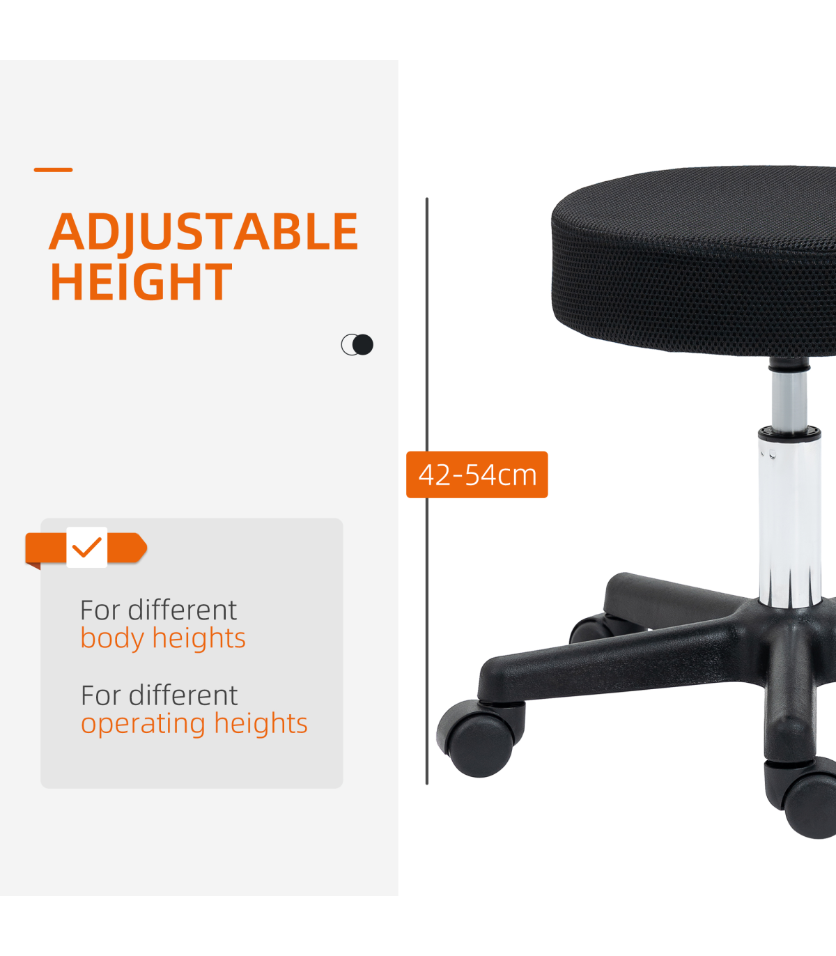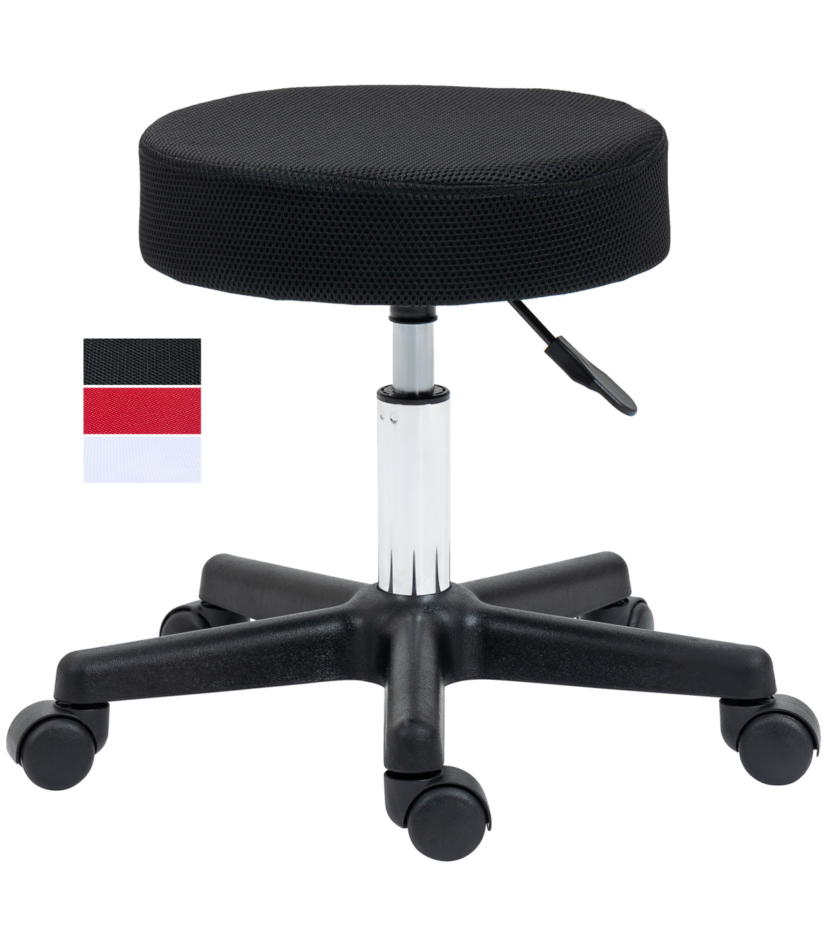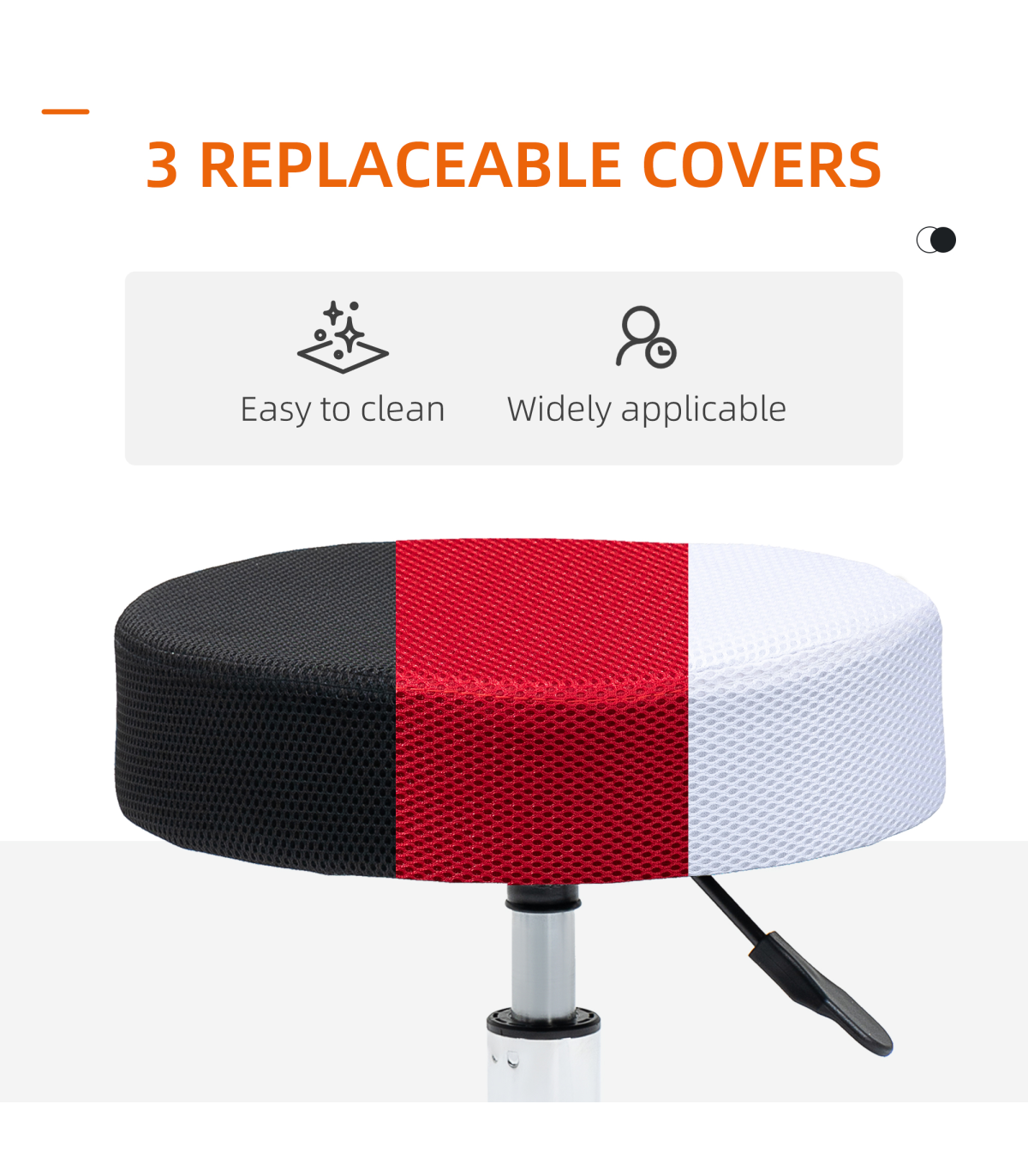 Three changeable covers: Saddle stool comes with black, red, white mesh seat tops. Easy to clean and change,42-54cm adjustable height: Salon chair is easy to adjust to a level you want, controlled by easy-to-reach lever.Versatile: This beauty stool is ideal for massage parlours, tattoo shops, beauticians, hair salons - or even your home.Five wheels: Easy to move this workshop stool around, whenever.Dimensions: 42-54H x ?48cm. Maximum load 136kg. Assembly required.