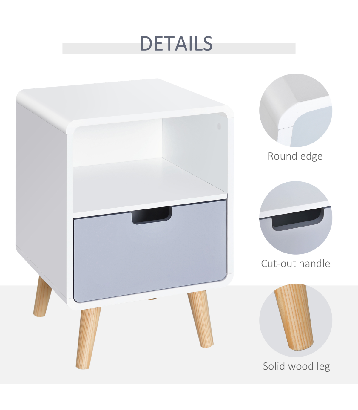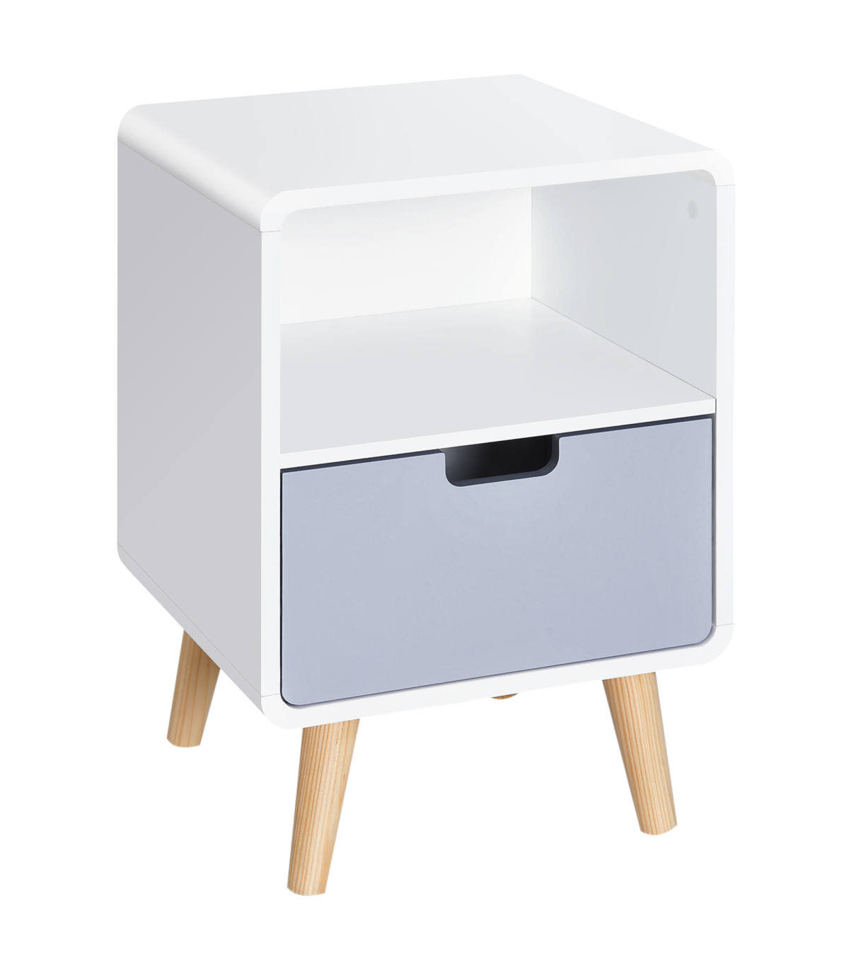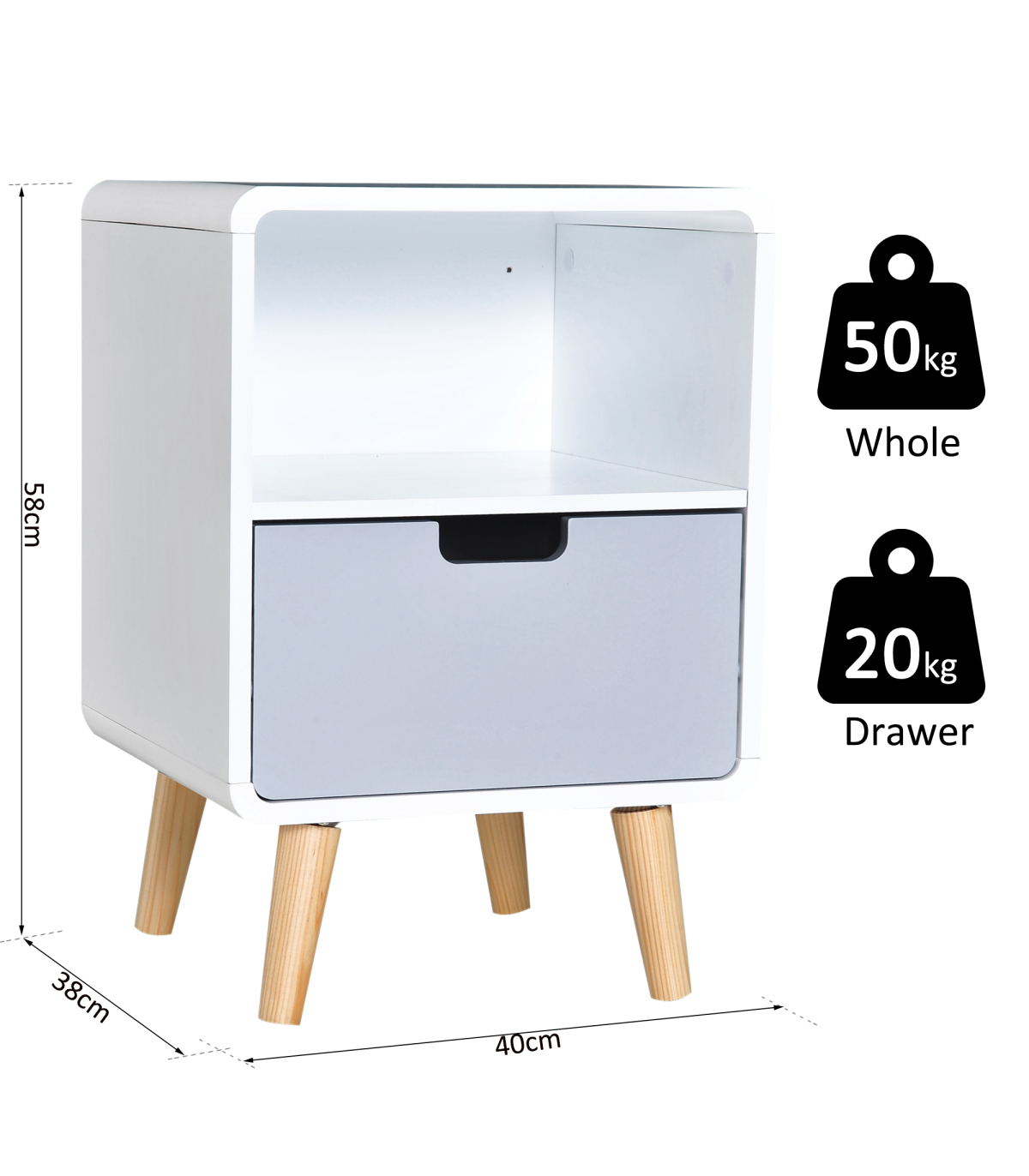 Nordic Style: Classic puristic retro Scandinavian style. Can be used as a sofa side table, end table or corner table. Blends seamlessly with any contemporary bedroom, living room or entryway.Sturdy Structure: Made from pine wood and MDF, it is durable and cost-efficient. This bedside cabinet can hold up to 50kg and is built to be a lasting conversation piece for years to come.Lots of Storage: Features a small open shelf and a grey lower drawer and a sleek top surface. Ideal for plants, ornaments or reading lamp. The hollow drawer handle adds a unique touch.Easy Maintenace: Painted surface with stain resistant and water-resistant protection. Easy to clean with a damp cloth.Dimensions: 40L x 38W x 58Hcm. Drawer: 33.5L x 27.5W x 10Hcm. Storage Shelf: 36.5 L x 36W x 19.5Hcm. Weight Capacity: whole: 50kg. drawer: 20kg.