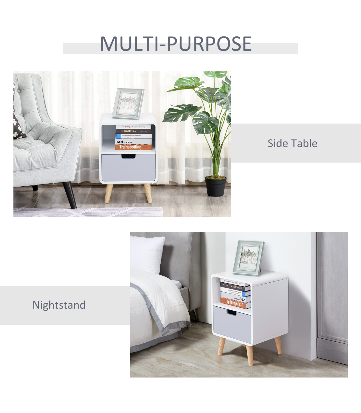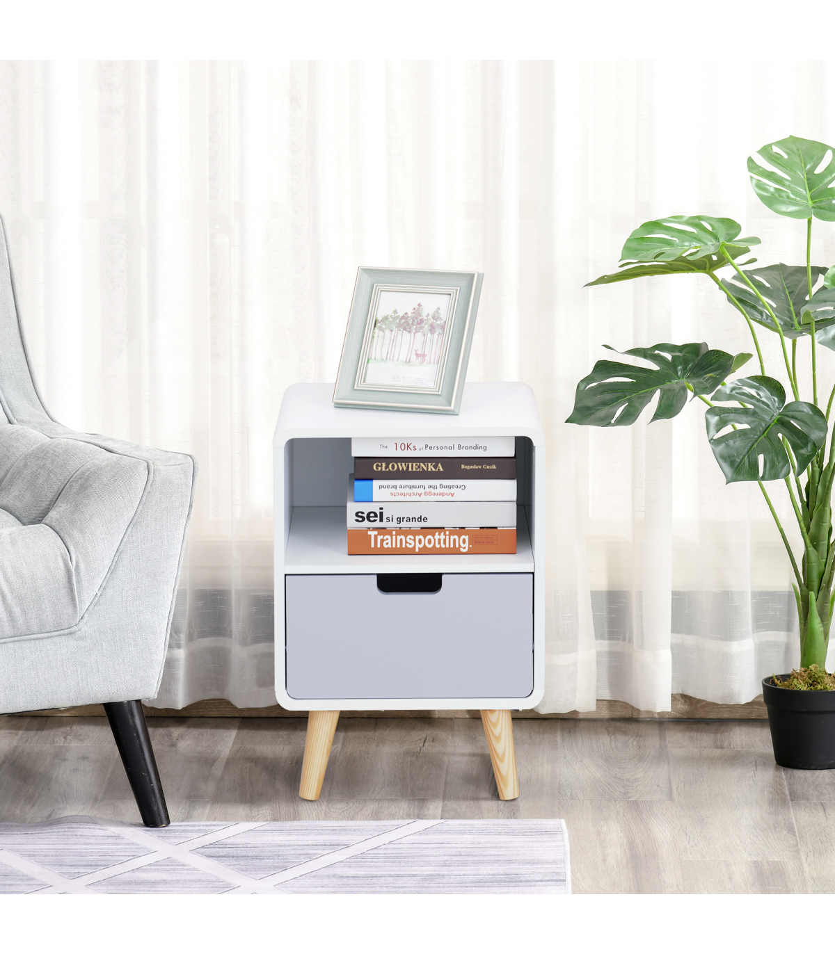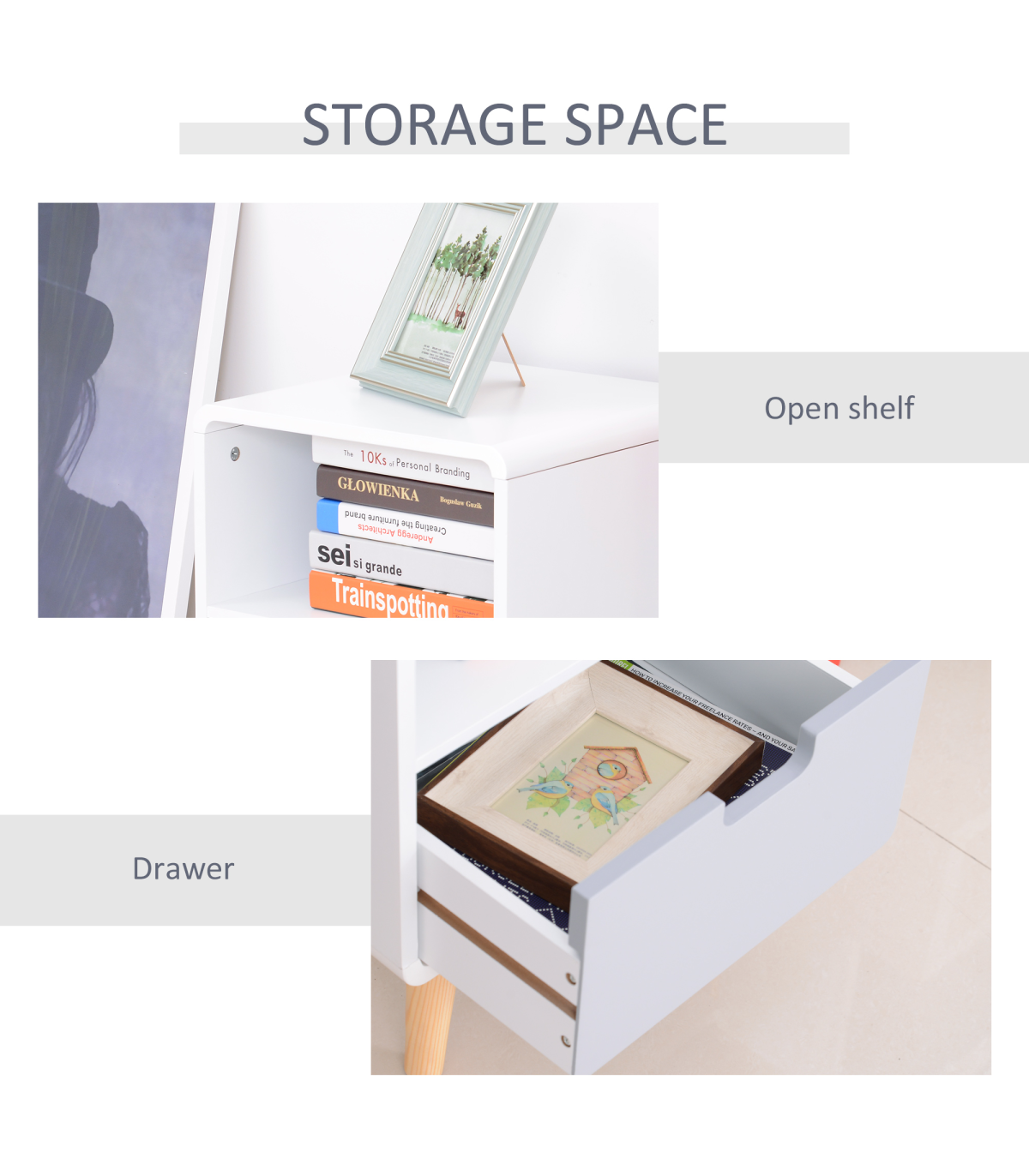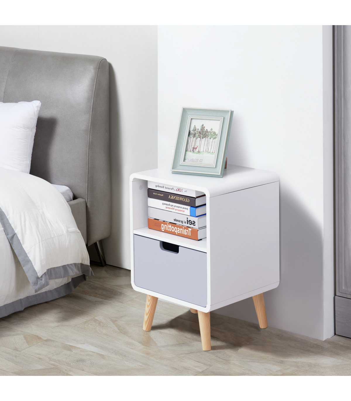 Nordic Style: Classic puristic retro Scandinavian style. Can be used as a sofa side table, end table or corner table. Blends seamlessly with any contemporary bedroom, living room or entryway.Sturdy Structure: Made from pine wood and MDF, it is durable and cost-efficient. This bedside cabinet can hold up to 50kg and is built to be a lasting conversation piece for years to come.Lots of Storage: Features a small open shelf and a grey lower drawer and a sleek top surface. Ideal for plants, ornaments or reading lamp. The hollow drawer handle adds a unique touch.Easy Maintenace: Painted surface with stain resistant and water-resistant protection. Easy to clean with a damp cloth.Dimensions: 40L x 38W x 58Hcm. Drawer: 33.5L x 27.5W x 10Hcm. Storage Shelf: 36.5 L x 36W x 19.5Hcm. Weight Capacity: whole: 50kg. drawer: 20kg.