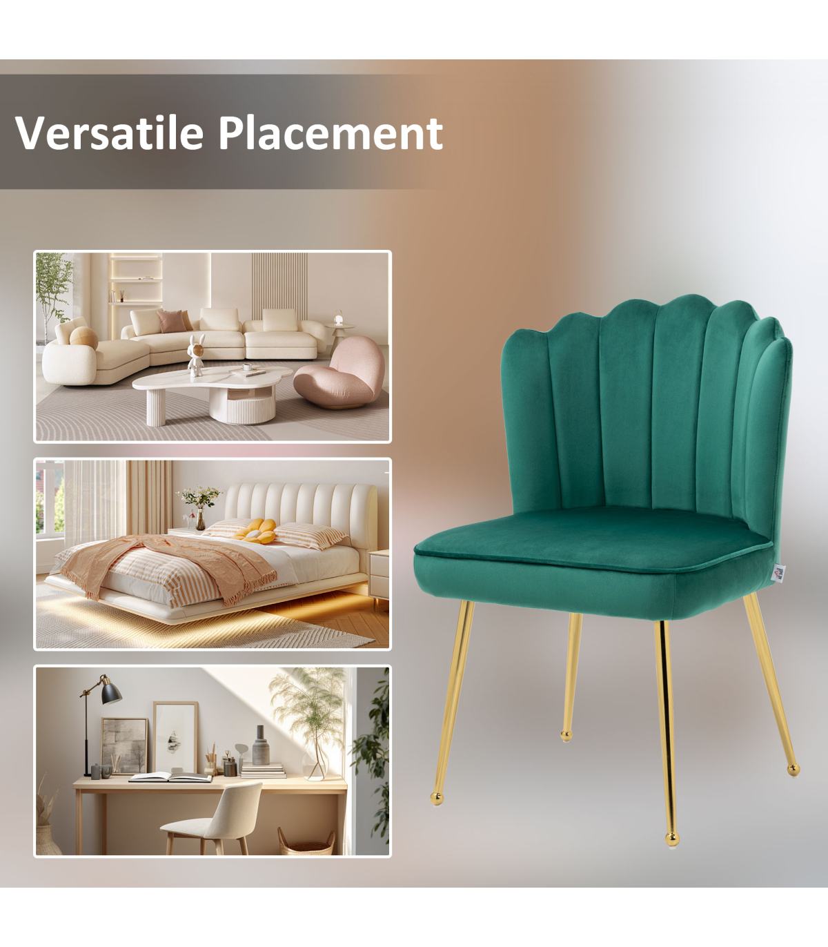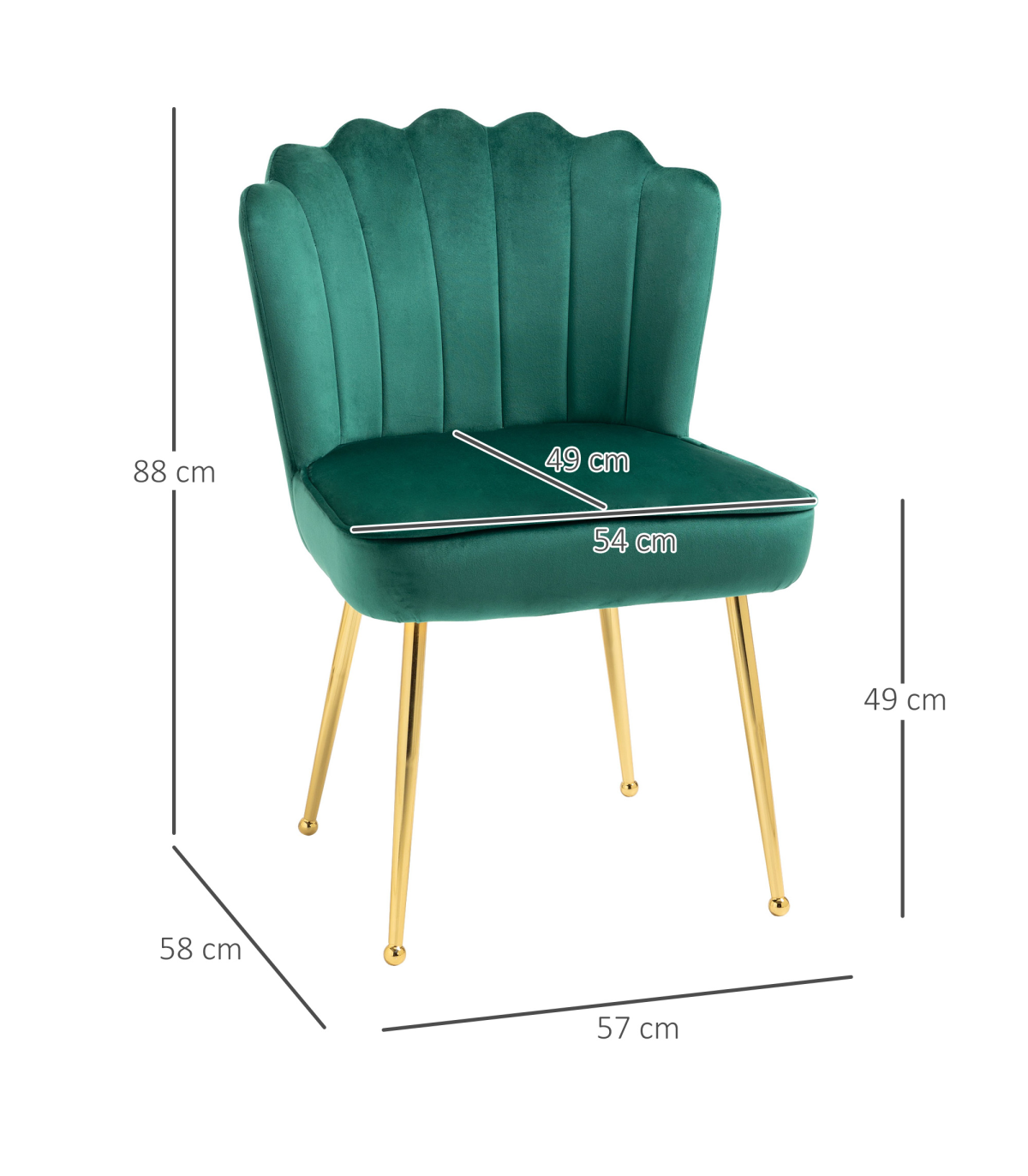 COMFORTABLE: Seat filled with sponge padding to sit for longer periods, high back for support. The shell chair with no arms for plenty of sitting room.LUXE LOOK: Shell-shaped back of the comfy chair is pretty, wrapped in velvet-feel upholstery for plenty of sophistication. Pastel hue is soft for a gentle look.METAL LEGS: A sturdy base to support you properly. Gold-tone finish to complement the rest of the living room chair.BEDROOM CHAIR DIMENSIONS: 88H x 57W x 58Dcm. Seat: 49H x 54W x 49Dcm.MAXIMUM LOAD 120KG. ASSEMBLY REQUIRED.
