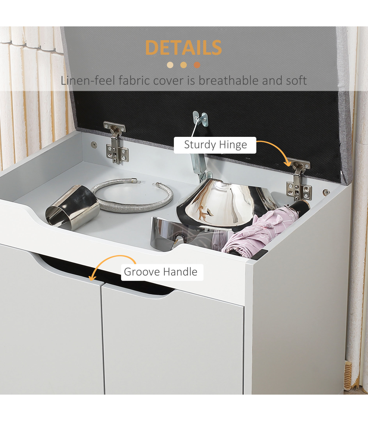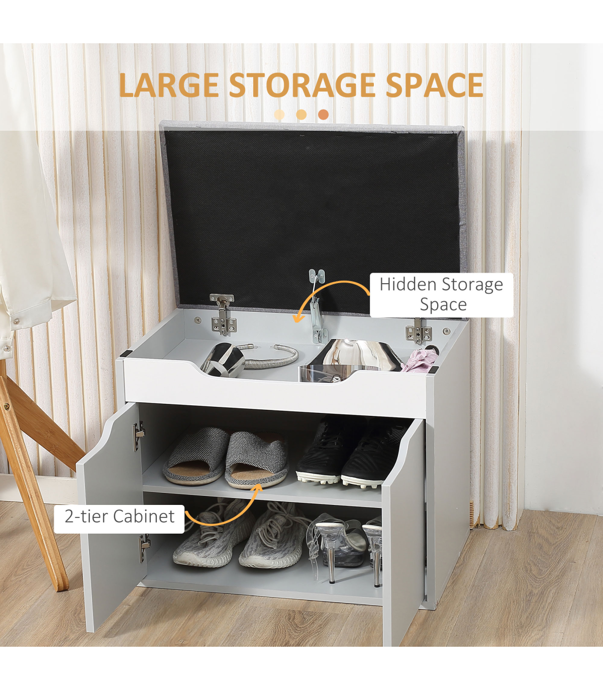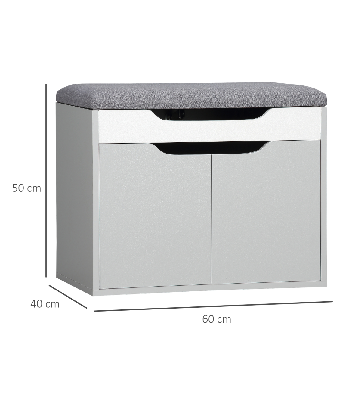 Two-part storage: A small top compartment with flip-up lid and bottom cupboard with adjustable shelf. Shoe storage bench holds four pairs of shoes roughly.Padded seat: A place to sit comfortably on this shoe cupboard. Linen-look upholstery for smoothness and style.Compact and freestanding: Easy to stand in your hallway, this shoe storage cabinet doesn't take up much space.Sturdy: Made from particle board, this shoe storage unit it sturdy, suitable for everyday use.Dimensions: 50H x 60W x 40Dcm. Maximum load: Bench - 160kg. Shelf - 5kg. Assembly required.