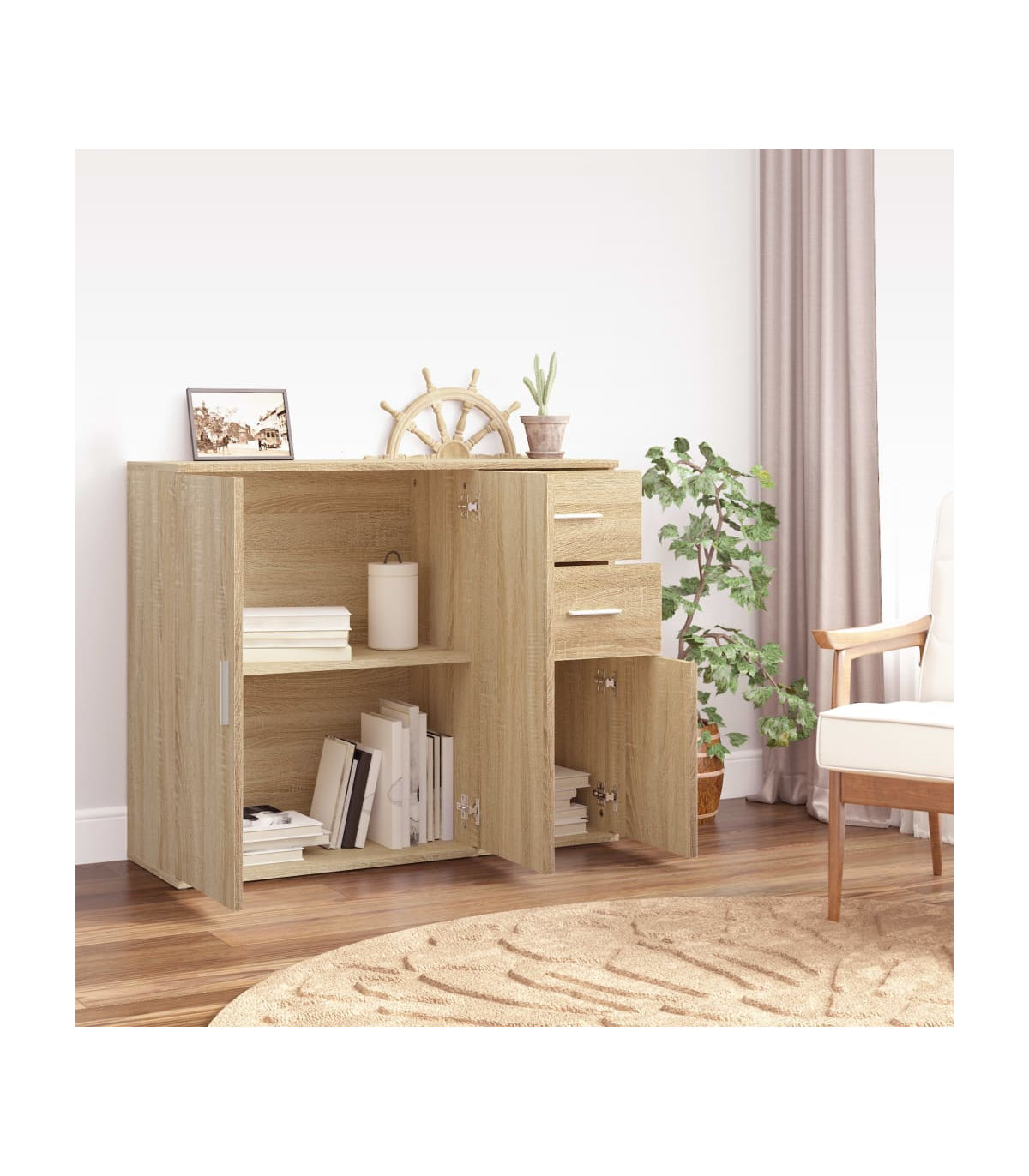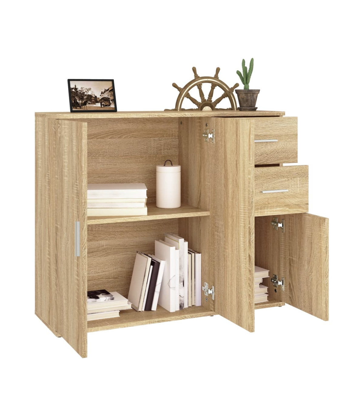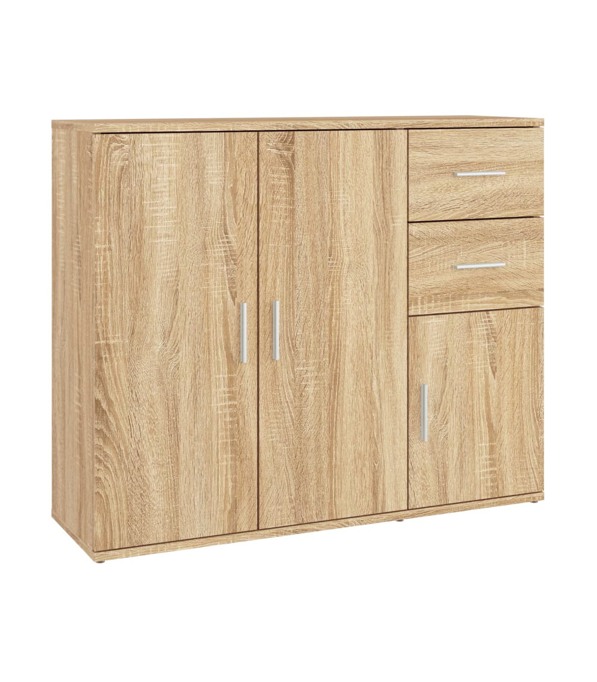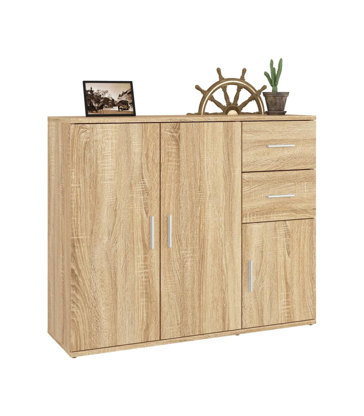 This classic sideboard, featuring a timeless look, is meant to be an excellent addition to your home. Sturdy material: The engineered wood is of exceptional quality with smooth surface and also features strength, stability and resistance to moisture.Ample storage space: The cabinet offers ample storage space for keeping your various daily essentials well organised and within easy reach.Displaying function: The top of the cupboard is great for displaying your decorative items, photo albums or small plants. Good to know:To make assembly as easy as possible, each product is delivered with a manual. Warning:To prevent it being overturned, this product must be used with the provided wall attachment device.