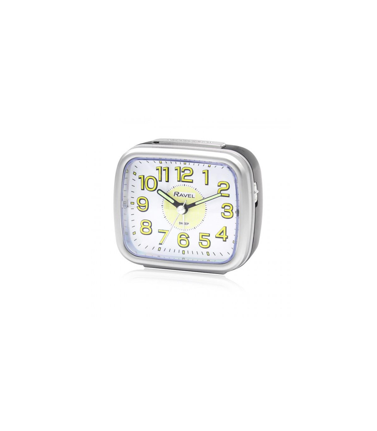Ravel's mid sized, contemporary styled bedside alarm clock for the home. Featuring a clear white dial with minute track and bold luminous numbers that offer the complete easy-read option, even in the middle of the night. The bold, black hands with luminous infill stand out, being easy to read. Featuring a beep alarm with crescendo function. Available in black, white, white / silver, black / silver. With snooze, silent sweep and light functions. Ideal for bedside table's, mantel pieces, desk's and office spaces. All Ravel clocks and watches are produced by Timesource Ltd, a UK company and producer of Henley and Ravel watches. Registered trademarks. Silent Sweep Second Beep Crescendo Alarm Snooze Light Luminous Numbers Dimensions: (H) 90mm x (W) 100mm x (D) 49mm