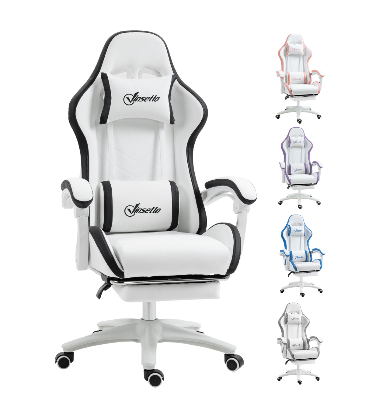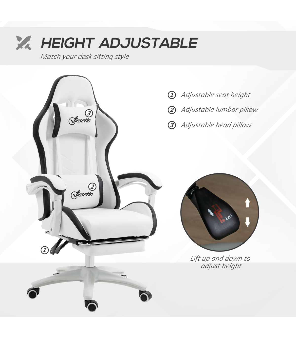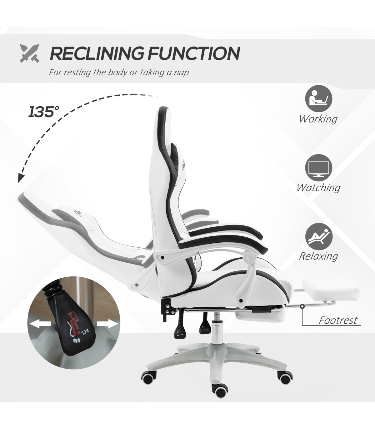 Keep comfortable and focused in the game: do it with this Vinsetto gaming chair. Faux leather upholstery is sleek, with a coloured border all over for a touch of impact. Padded all over, with head and lumbar pillow included for comfort. The back reclines to a maximum 135e, with a pull-out footrest to elevate the lower body. Adjust the height between 45.5cm and 53.5cm, to game at a position best for you.