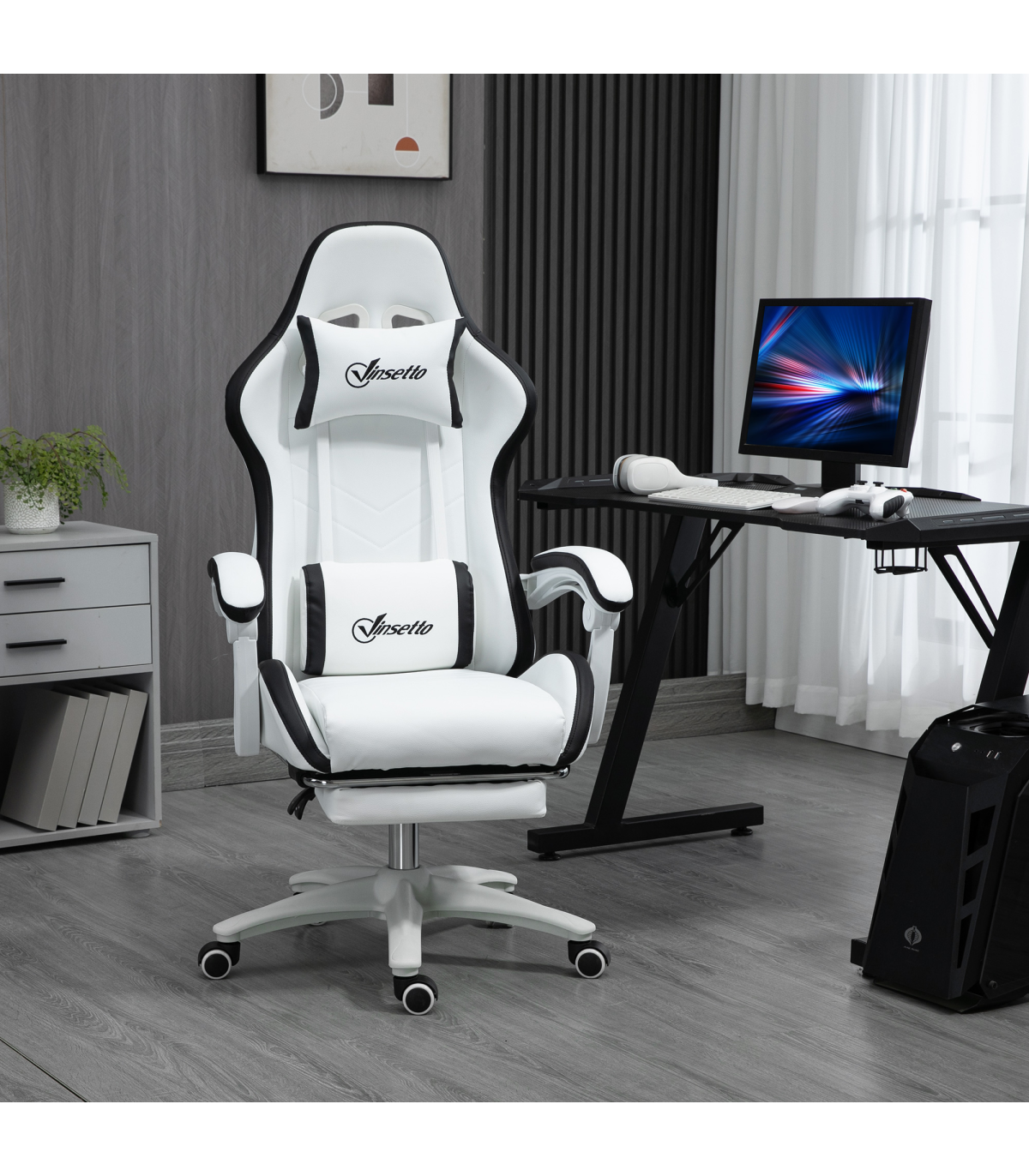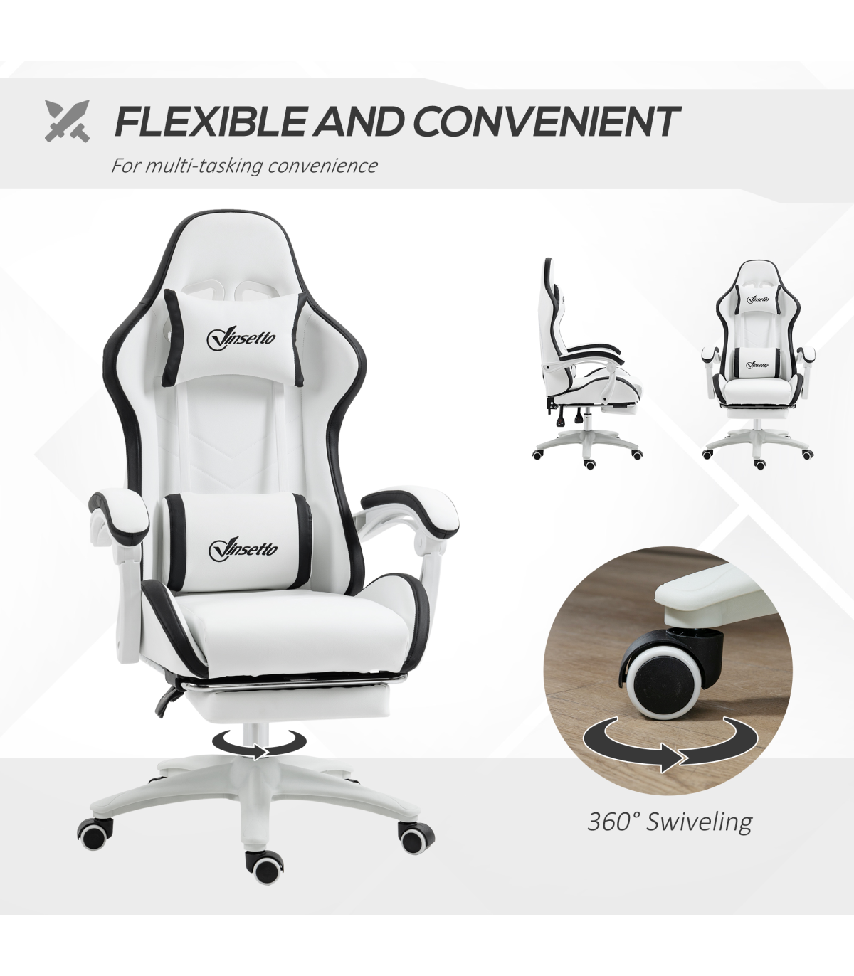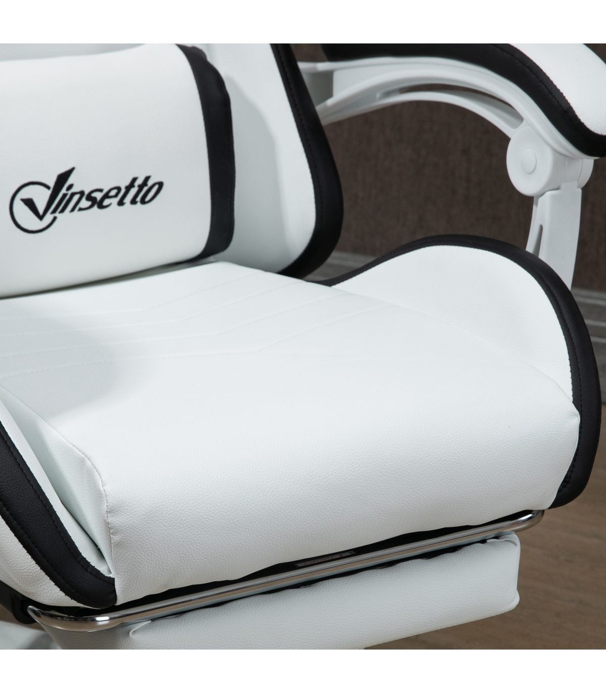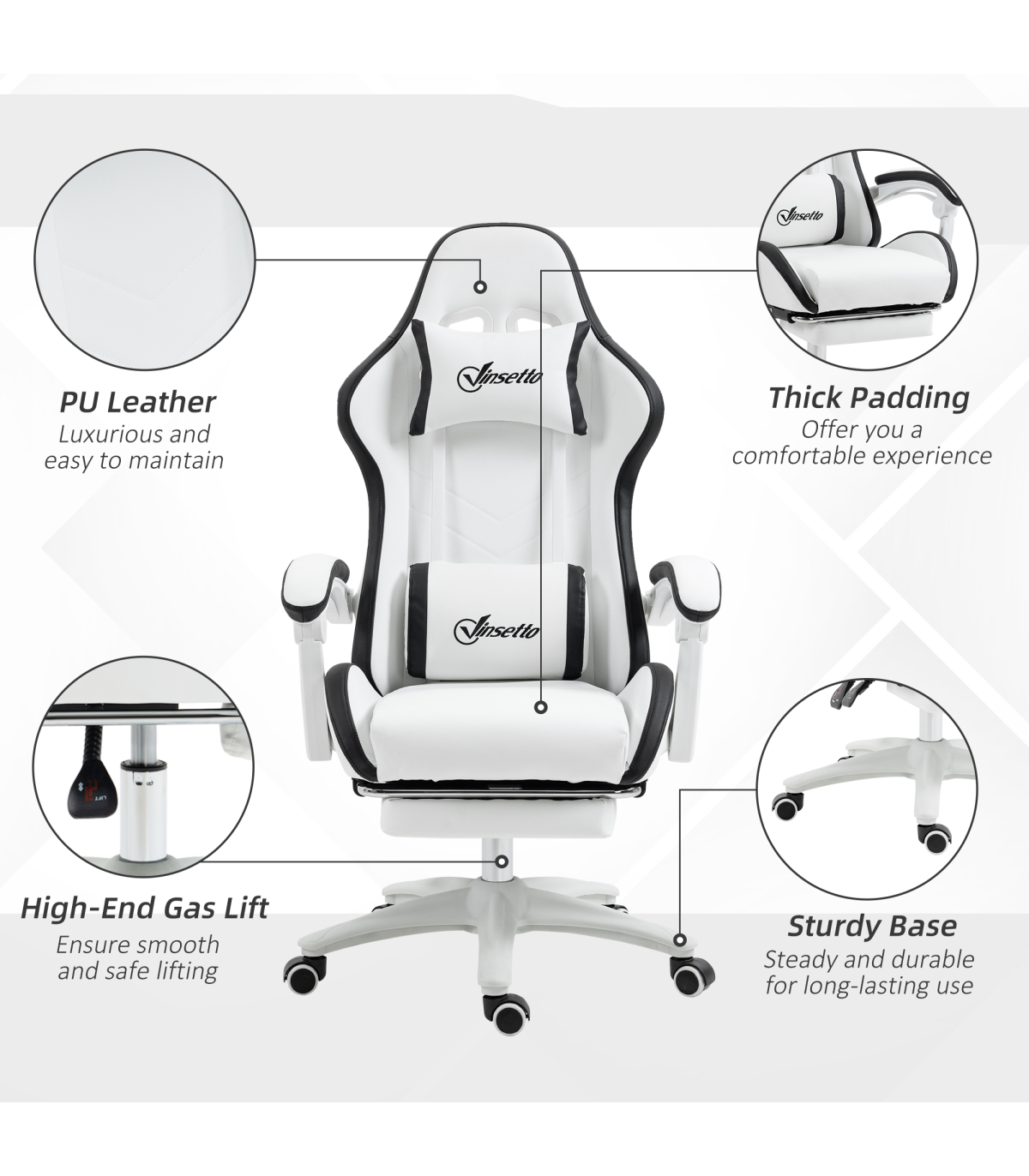Keep comfortable and focused in the game: do it with this Vinsetto gaming chair. Faux leather upholstery is sleek, with a coloured border all over for a touch of impact. Padded all over, with head and lumbar pillow included for comfort. The back reclines to a maximum 135e, with a pull-out footrest to elevate the lower body. Adjust the height between 45.5cm and 53.5cm, to game at a position best for you.