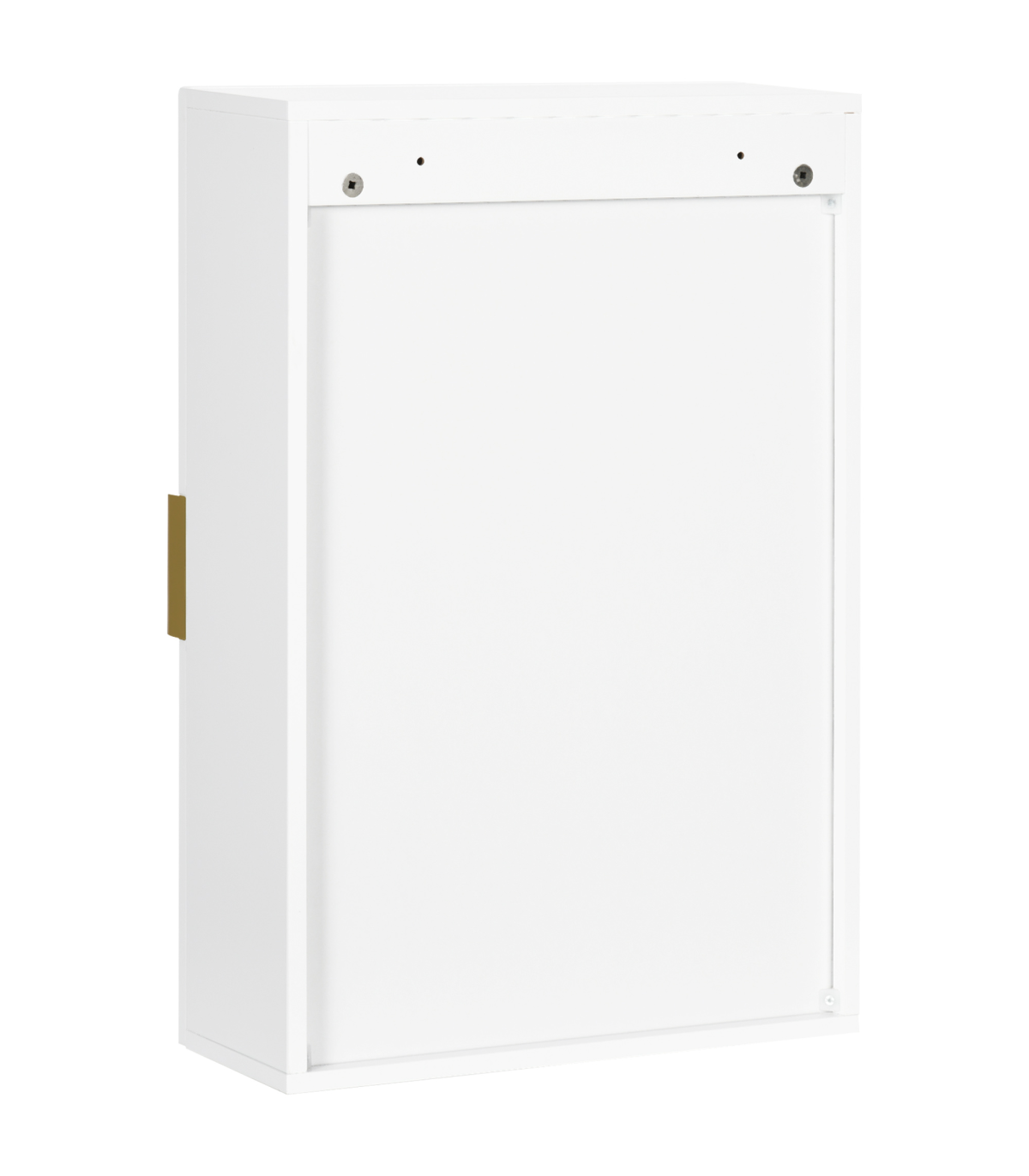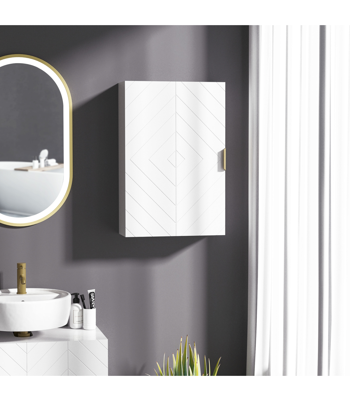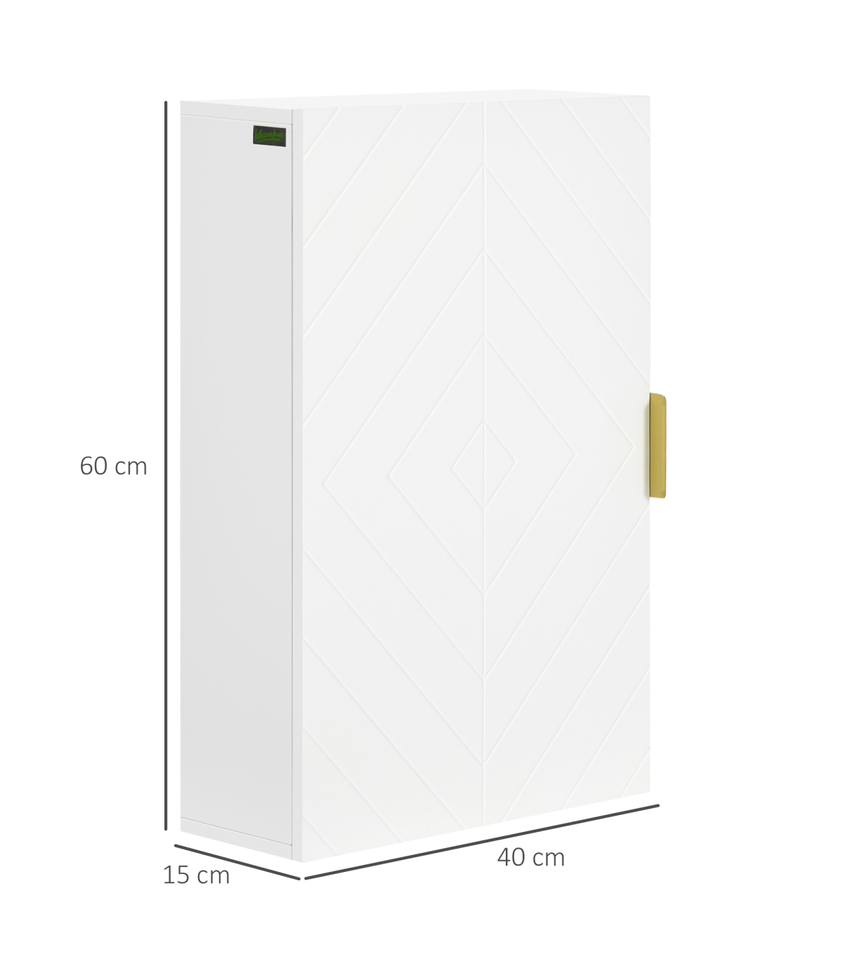 Two inner adjustable shelves: Bathroom wall cabinet offers discreet storage, with sections to organise easily.Modern: A white bathroom storage cabinet for simplicity, with gold-tone accents for a luxe touch.On-wall cabinet design: A great space saver, this bathroom cabinet doesn't take up floor space.Embossed doors: Adds a delicate bit of character to the overall look of this bathroom storage unit.Dimensions: 40W x 15D x 60Hcm. Maximum load 12kg. Assembly required.