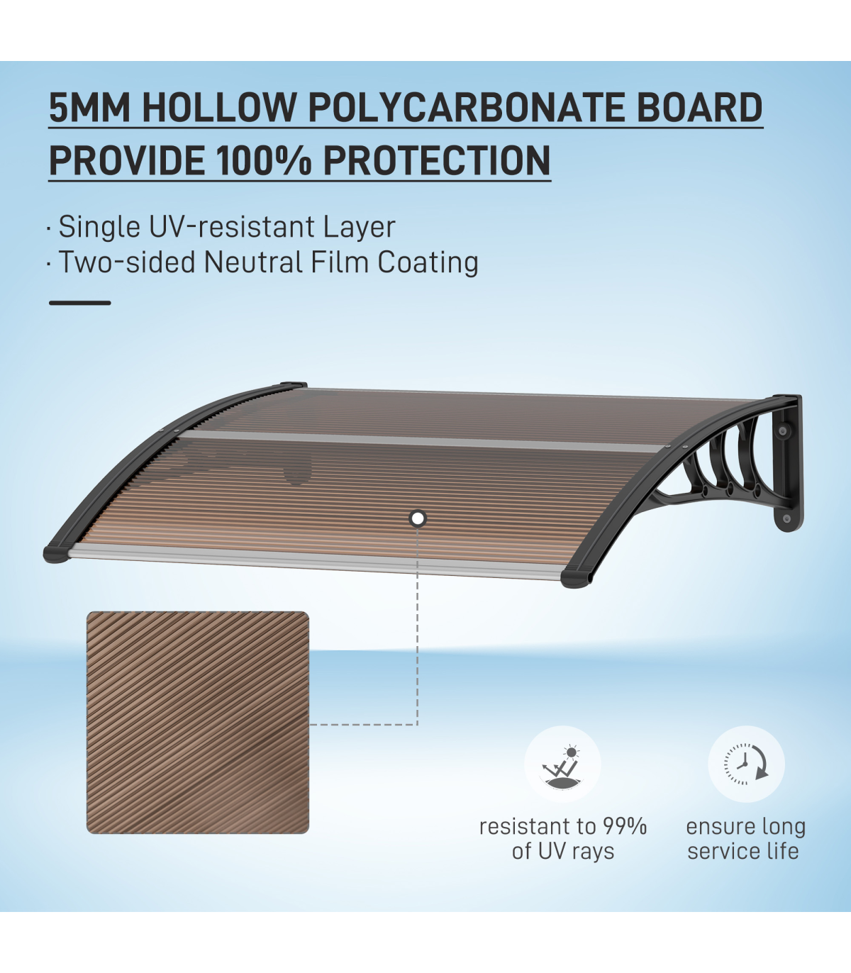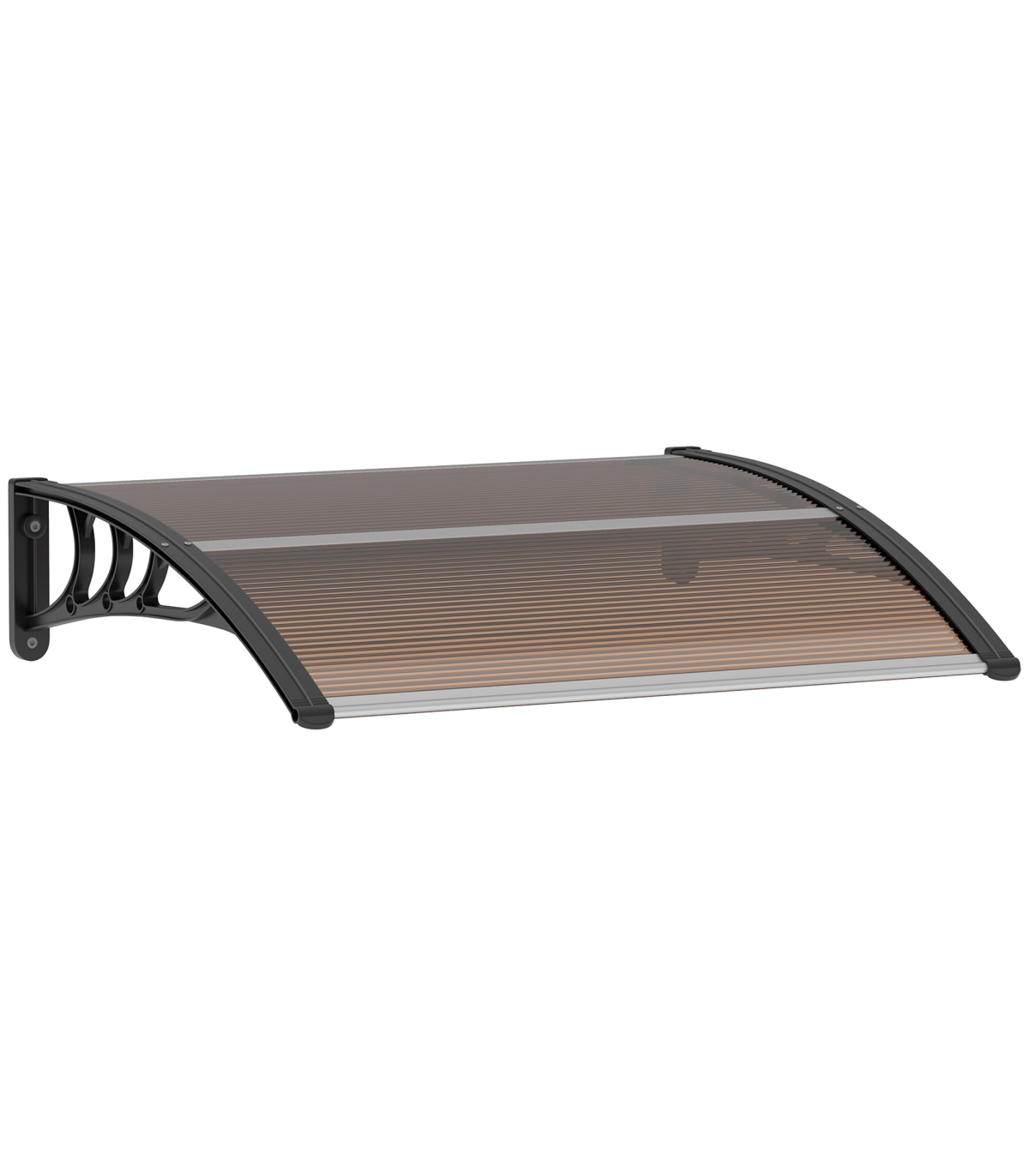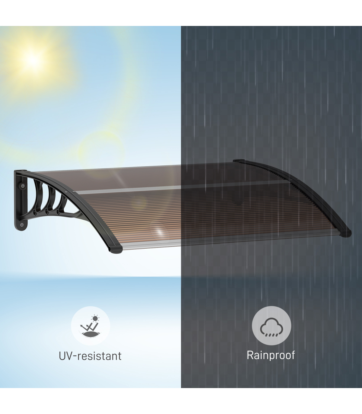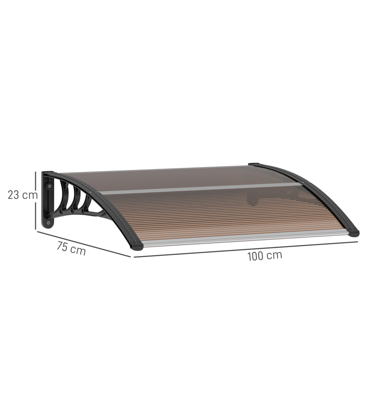 Curved polycarbonate: Non-toxic and resistant to rain and snow, this front door canopy helps protect the outside of your doors and windows from sunlight and more. Keeps spot sheltered all year round.UV covering: Coated on the surface, the door canopy protects you, your door and your window from sun rays, keeping the temperature down inside, whilst still allowing you to enjoy the light.Sturdy frame: Rigid plastic on the outer, with aluminium tubes connecting the two ends to hold everything together. Awning is lightweight, durable and reliable for a long-term addition to your home and outdoor.Easy to install: Outdoor canopy has all accessories needed to attach and fix securely.Dimensions: 75L x 100W x 23Hcm. Wall bracket: 23H x 75Lcm.