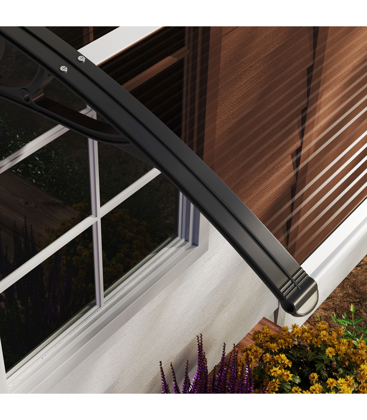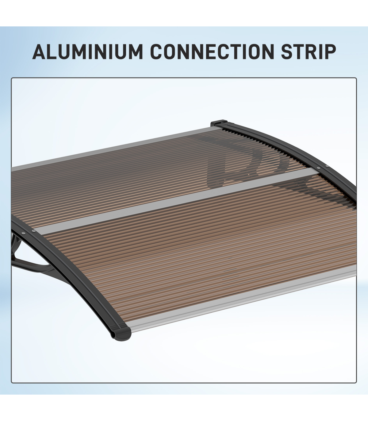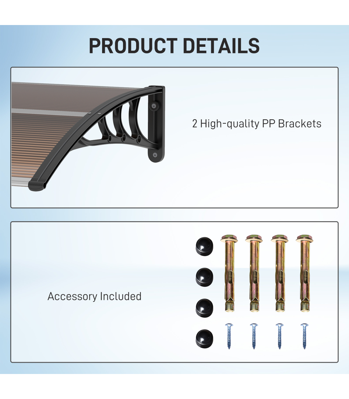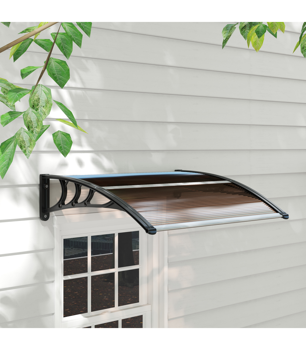 Curved polycarbonate: Non-toxic and resistant to rain and snow, this front door canopy helps protect the outside of your doors and windows from sunlight and more. Keeps spot sheltered all year round.UV covering: Coated on the surface, the door canopy protects you, your door and your window from sun rays, keeping the temperature down inside, whilst still allowing you to enjoy the light.Sturdy frame: Rigid plastic on the outer, with aluminium tubes connecting the two ends to hold everything together. Awning is lightweight, durable and reliable for a long-term addition to your home and outdoor.Easy to install: Outdoor canopy has all accessories needed to attach and fix securely.Dimensions: 75L x 100W x 23Hcm. Wall bracket: 23H x 75Lcm.