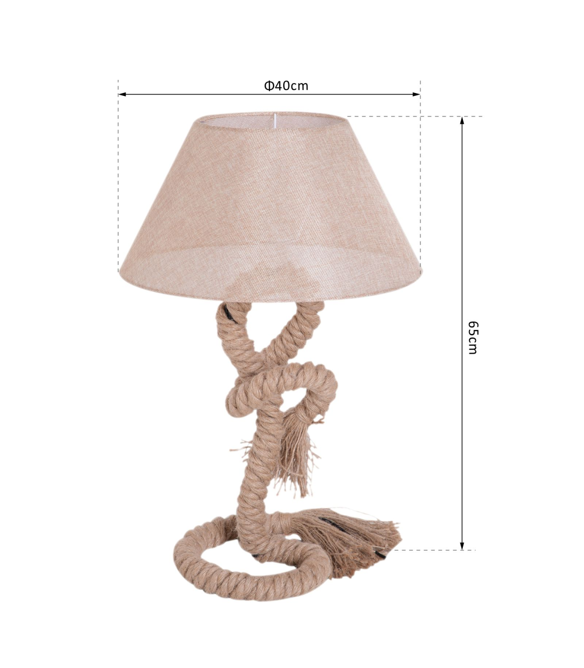 Industrial Design: Simple elegant industrial-design table lamp. Can be used seamlessly throughout your house: on desks, tables, or countertops, in bedrooms, living rooms, dining rooms, or dens.Unique Nautical Theme: Combine Nautical Pier Rope base with a linen-style fabric shade, making this lamp a unique object in you home.Durable Material: Constructed of sturdy hemp rope and metal frame, with fabric light shape and IP20 water and dust protect abililty, this light can stand for long lasting use. Soft cushioned overlays with hook-and-loop tape for warm and soft touch.Hassle Free and Easy to Use: Holds a single E27 40W bulb (NOT INCLUDED), utilizes an easy on/off switch. Comes equipped with a 1.5m cord for convenient plug accessibility.Overall Size: 40L x 40W x 65H cm,Input Voltage:220-240V/50Hz,E27 bulb base(bulb not included)