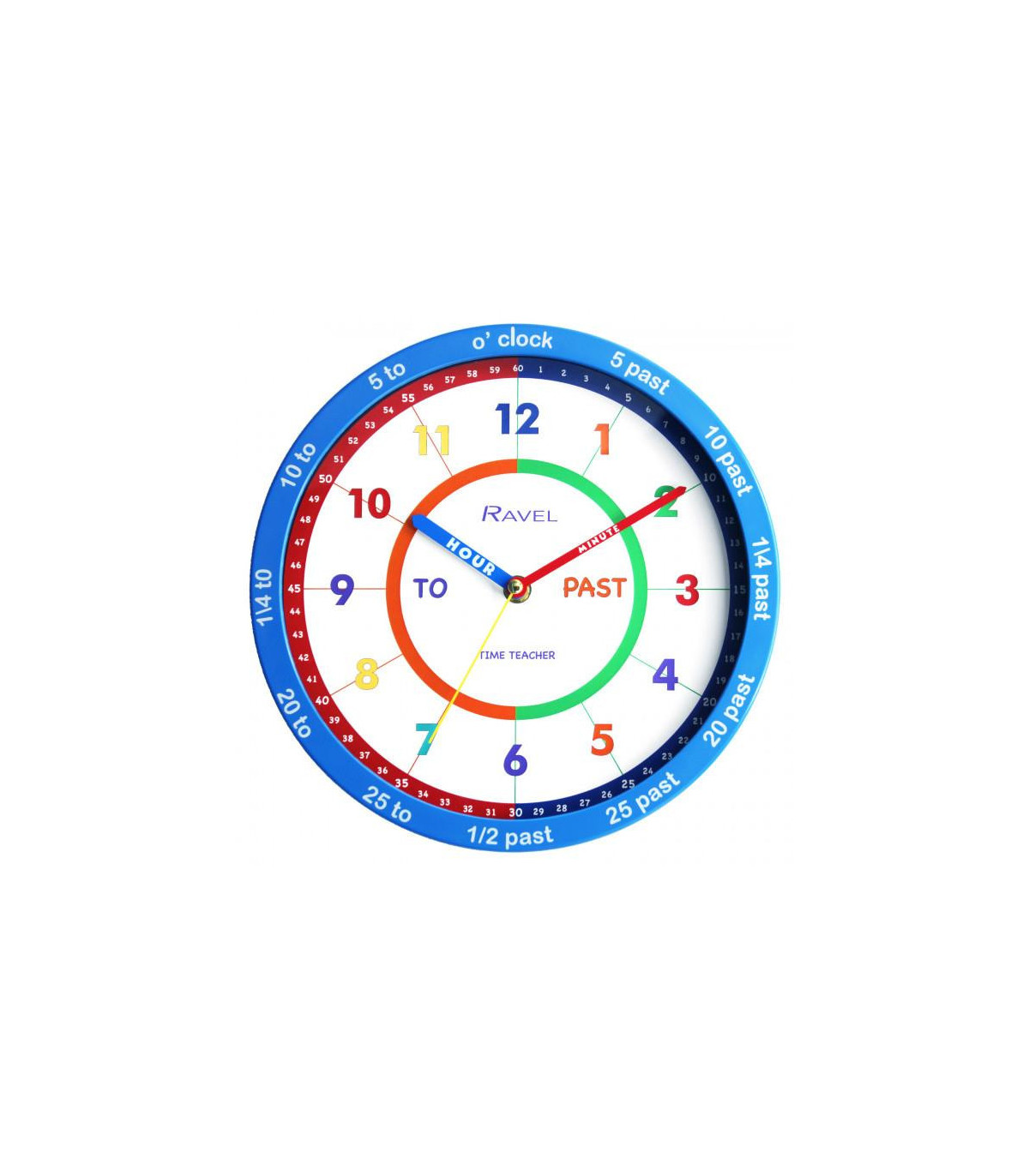 Ravel's high quality white plastic time-teacher clock is perfect to help you teach your child the time. Clearly labelled, colour coded "to" and "past" sections, hands and numbers help your child learn how to tell the time correctly. Ravel's fabulous multi-coloured clock is sure to make helping your little one to tell the time a wonderful experience. Coloured Plastic Round 25cm Case. Colour Coded Hands. Time-Teacher Dial. Silent Sweep Second Hand. Quality Quartz Movement. Packed in Ravel Time-Teacher Clock Presentation Box.