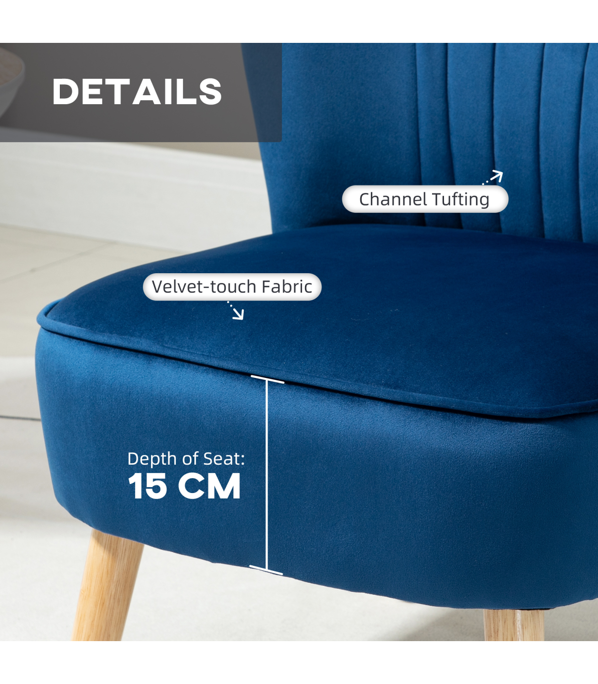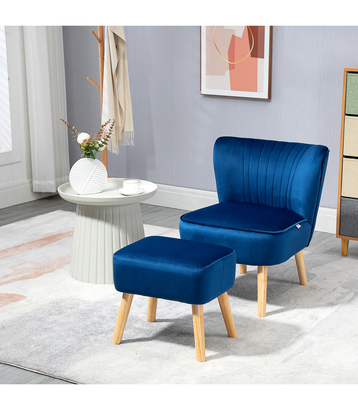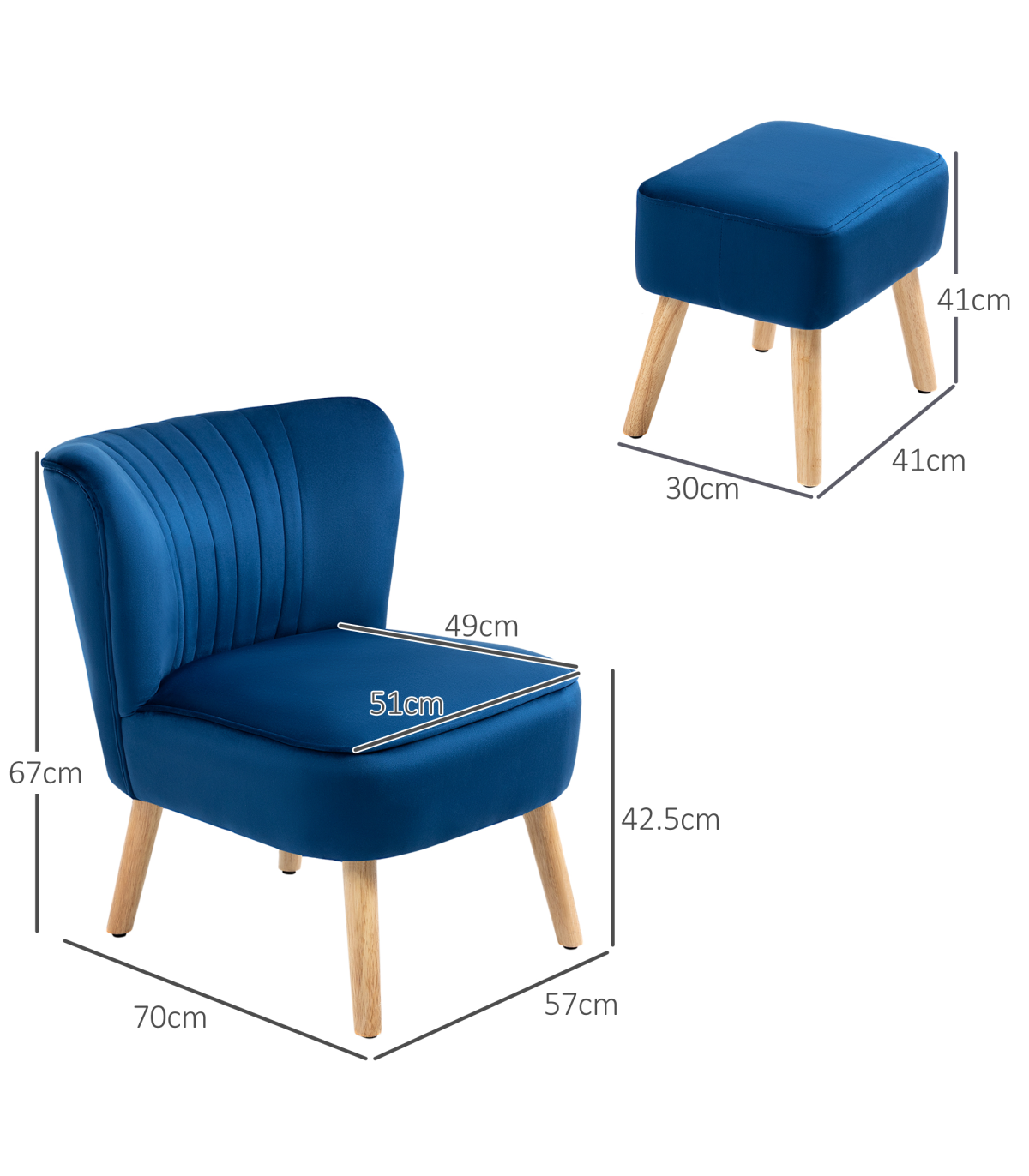 Luxe design: Bedroom chair and footstool are both are wrapped in velvet-feel upholstery, in a soft-coloured shade. A beautiful focal point for your living space.Matching set: An armless accent chair and footstool - this lounge chair set creates a stylish spot wherever.Wooden legs: Tub chair and footstool support you properly when you sit and relax.Comfortable: Padded chair and stool - sink in and relax for long periods!Dimensions: Chair: 67H x 57W x 70Dcm. Ottoman: 36H x 41L x 30Wcm. Assembly required.