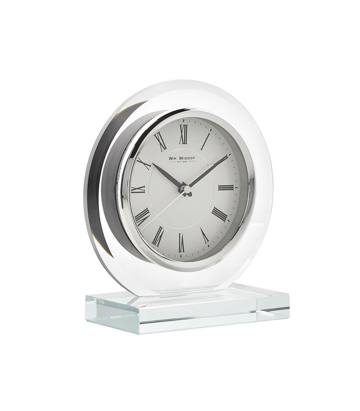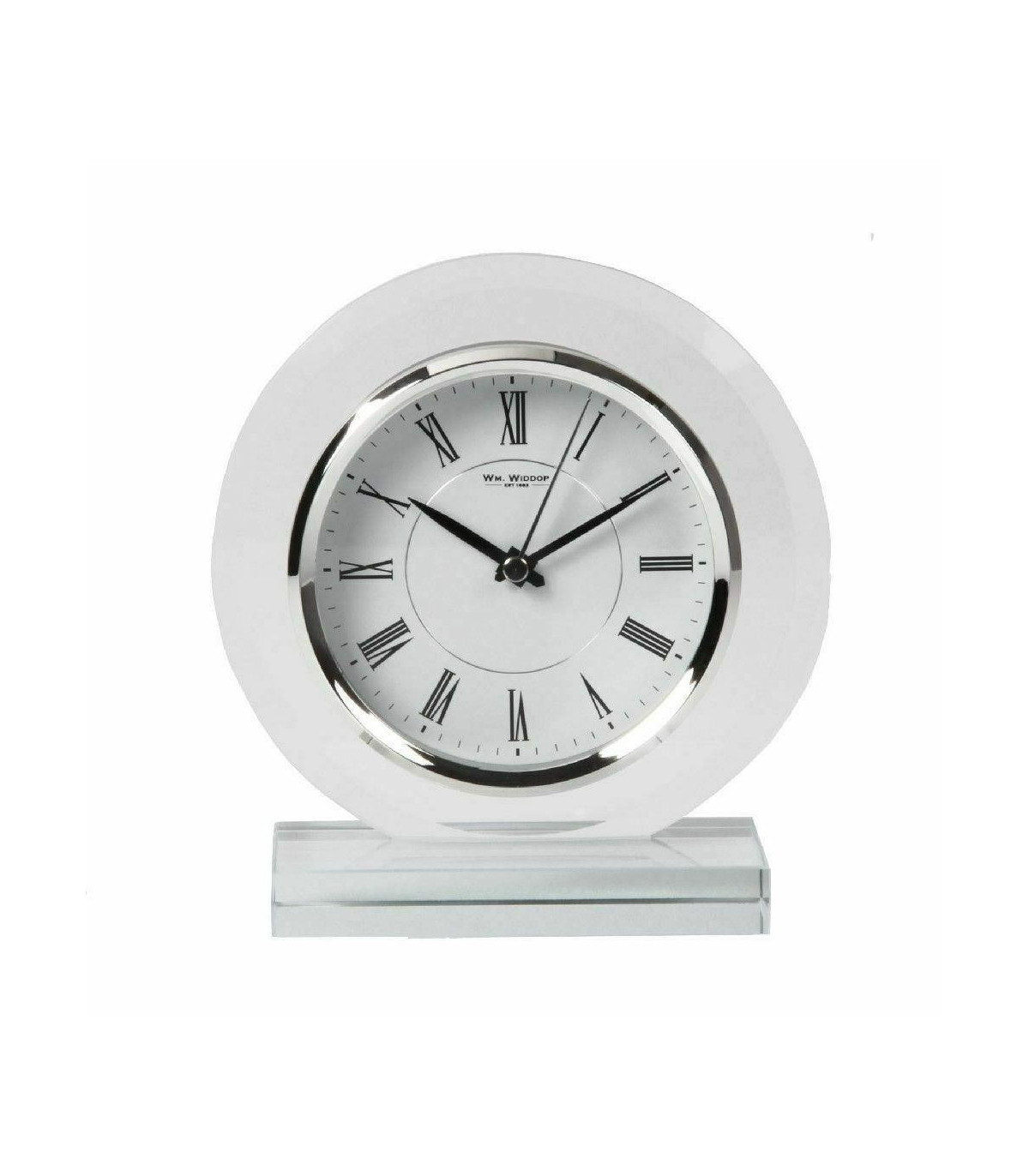 A round glass mantel clock from WILLIAM WIDDOP?. This mantel clock has a beautiful contemporary design with a glass surround. The main clock face features a silver bezel and a roman numeral dial. Whether it?s a gift for a housewarming or a birthday, this mantel clock has a lasting style that will look great on a living room mantelpiece or cabinet table. Established in 1883, WILLIAM WIDDOP? is our flagship brand, named after our founder who was a clockmaker and jeweller based in the Yorkshire town of Brighouse. With a strong focus on family traditions, we continue to manufacture classic clocks as well as producing new & innovative designs. WILLIAM WIDDOP? clocks are famed for their history, longevity and timeless style which remains steadfast in the range today. Manufactured with unrivalled quality for those who will cherish their traditional timepieces for many years to come.